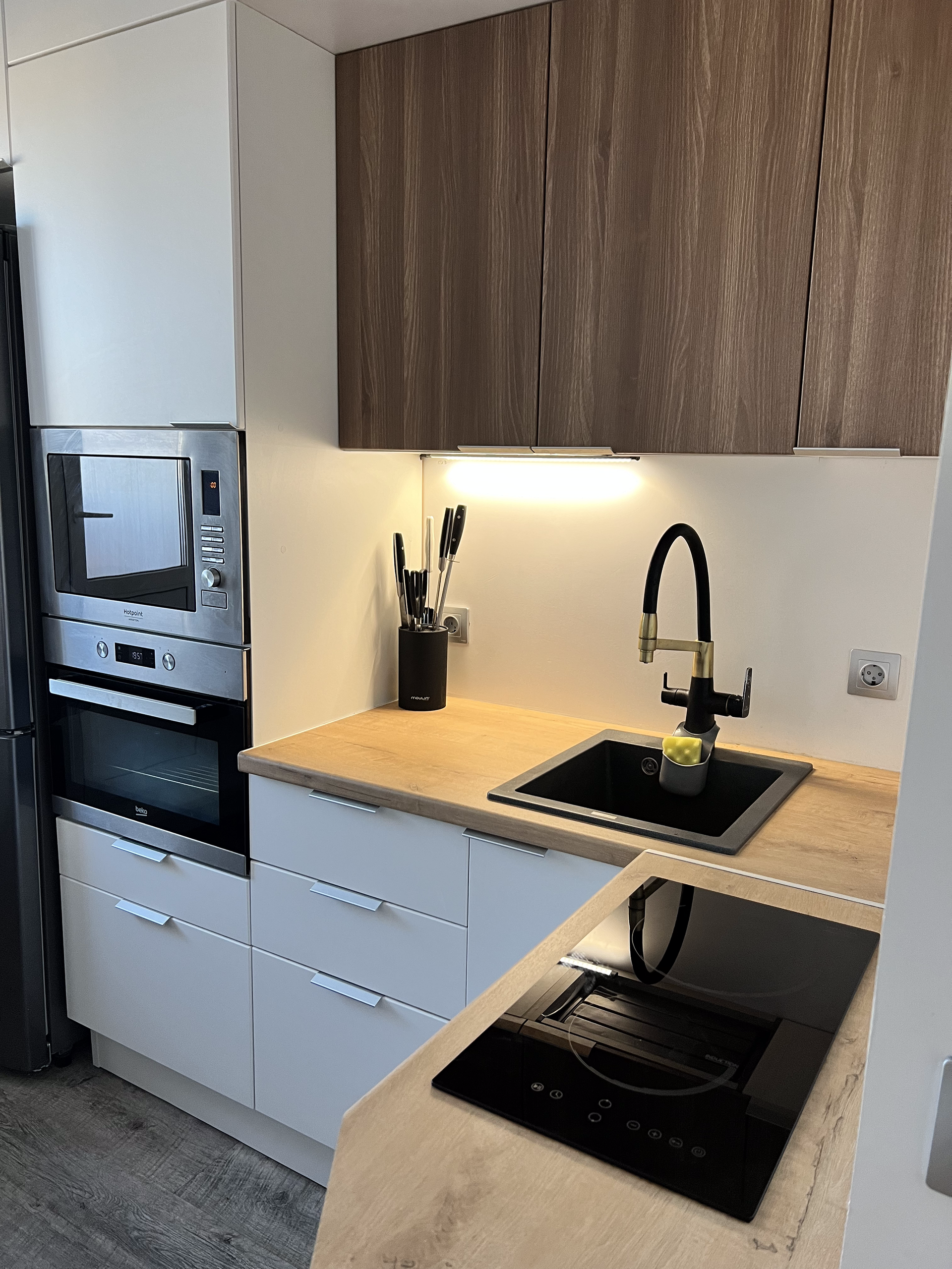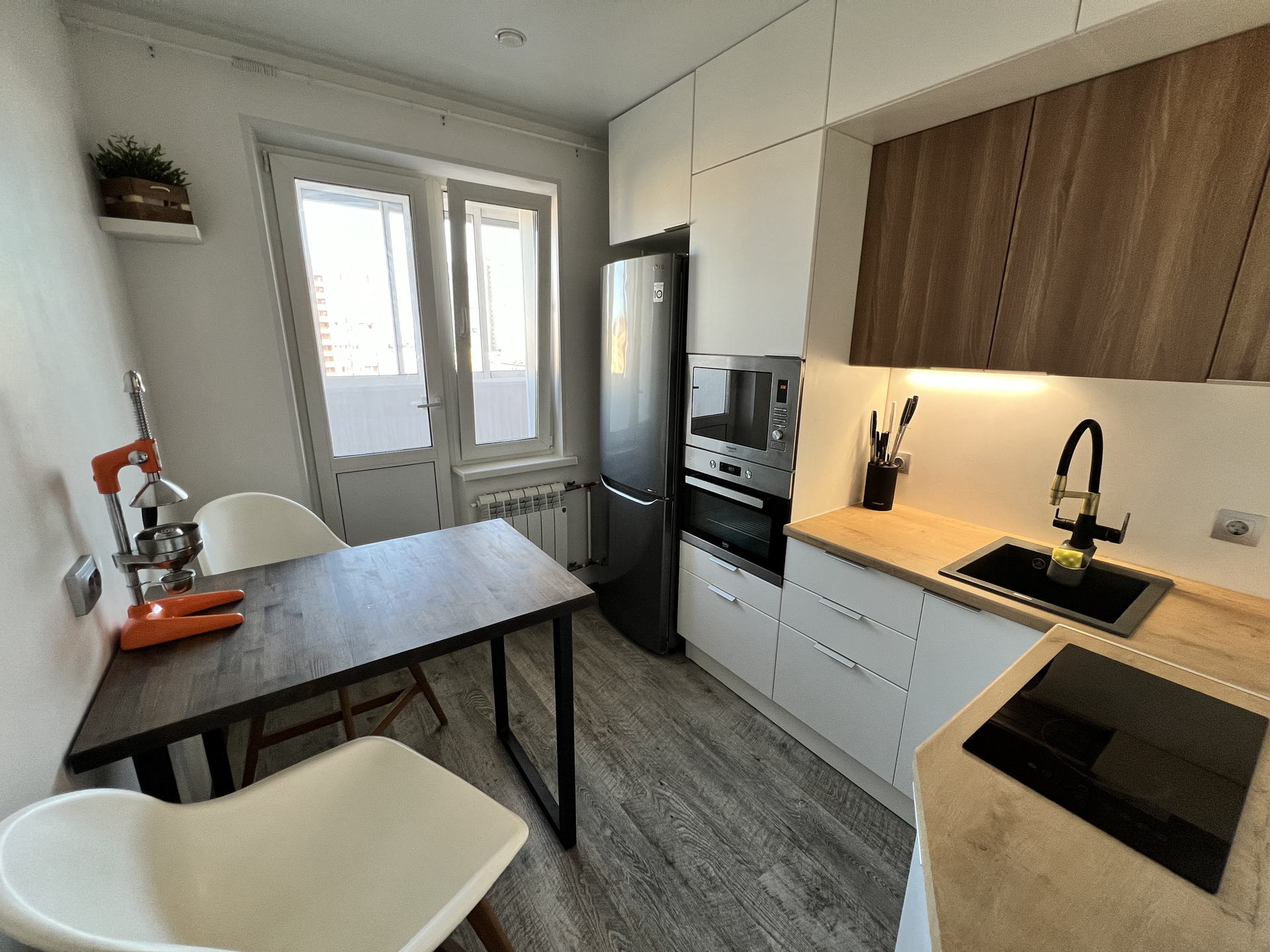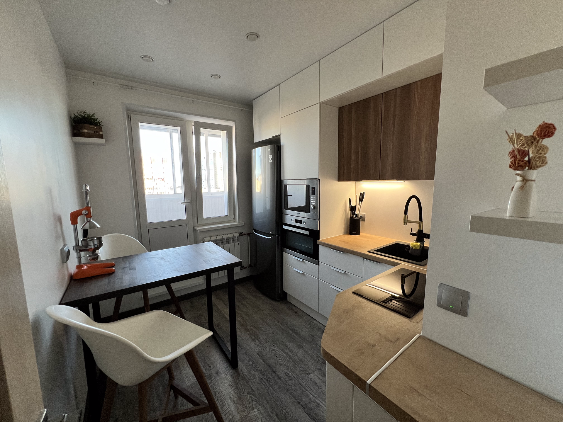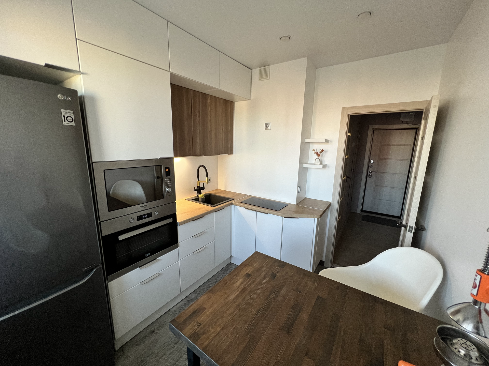 Кухонная мебель сделана на заказ и оборудована встроенной техникой. Установлен фильтр для питьевой воды.