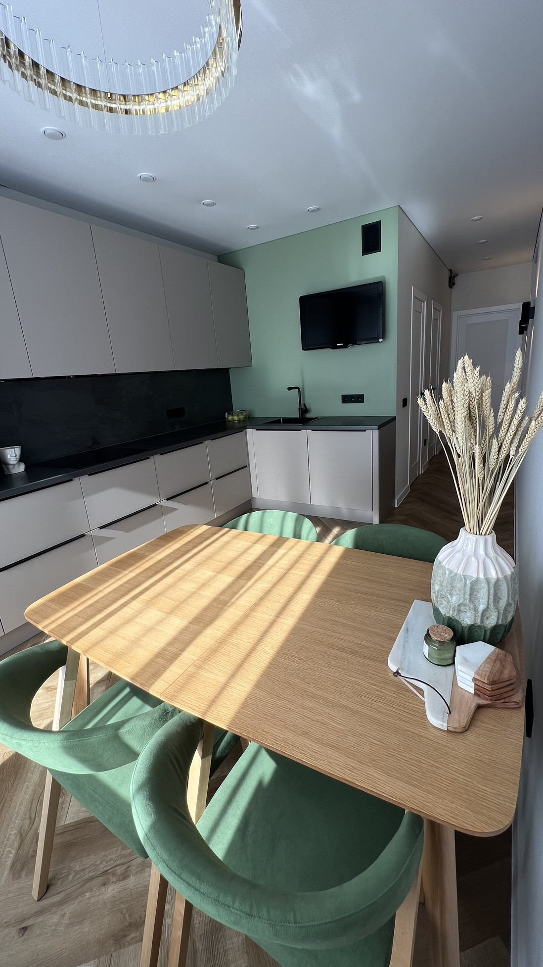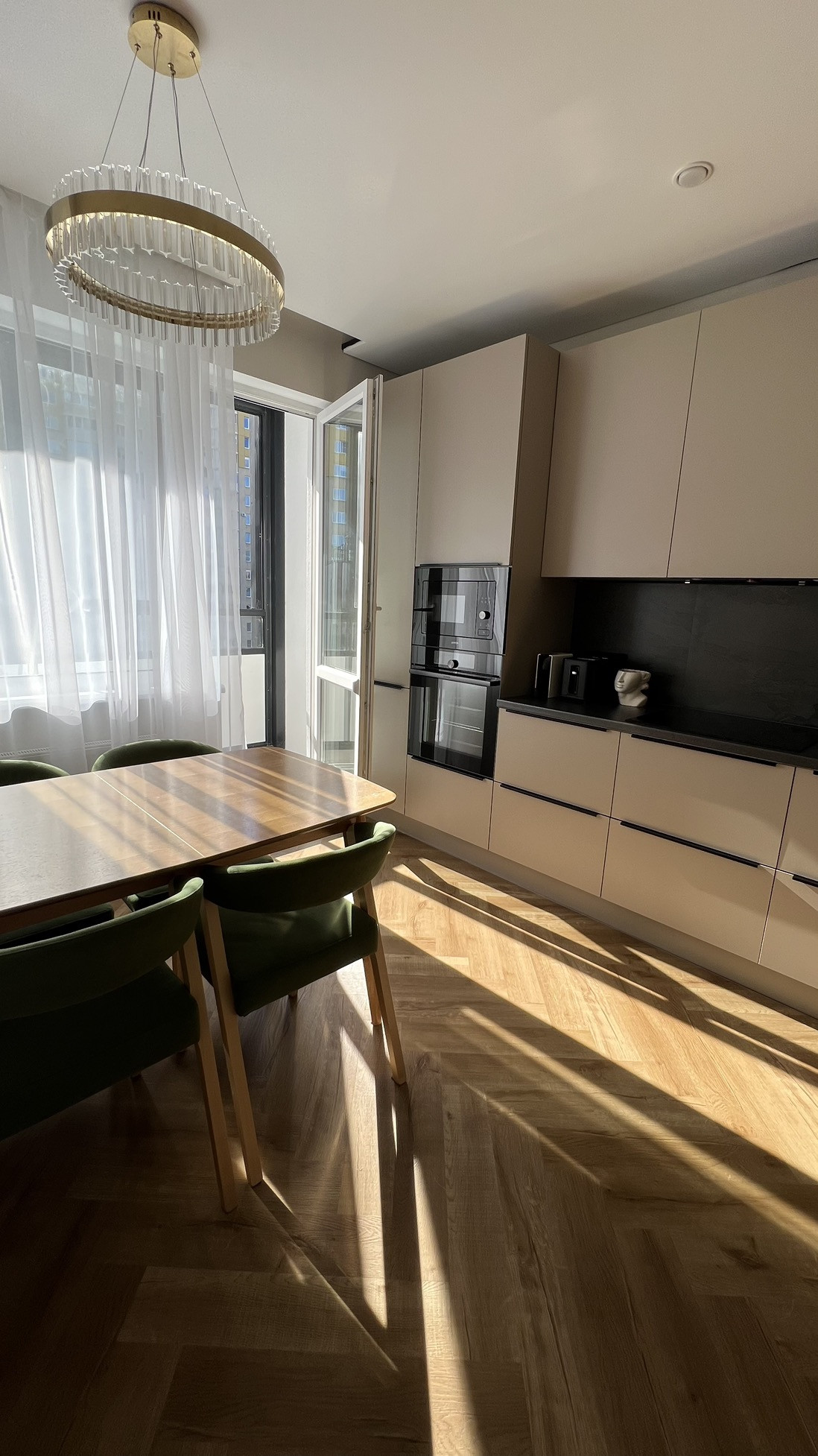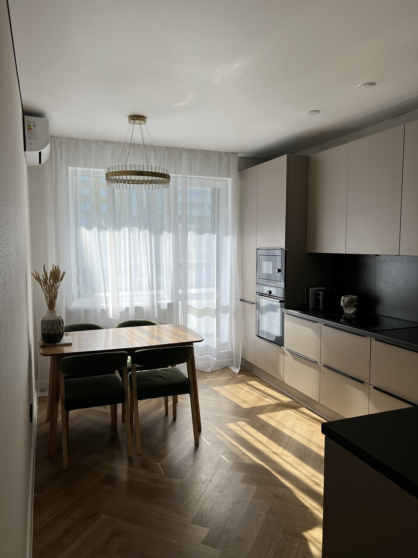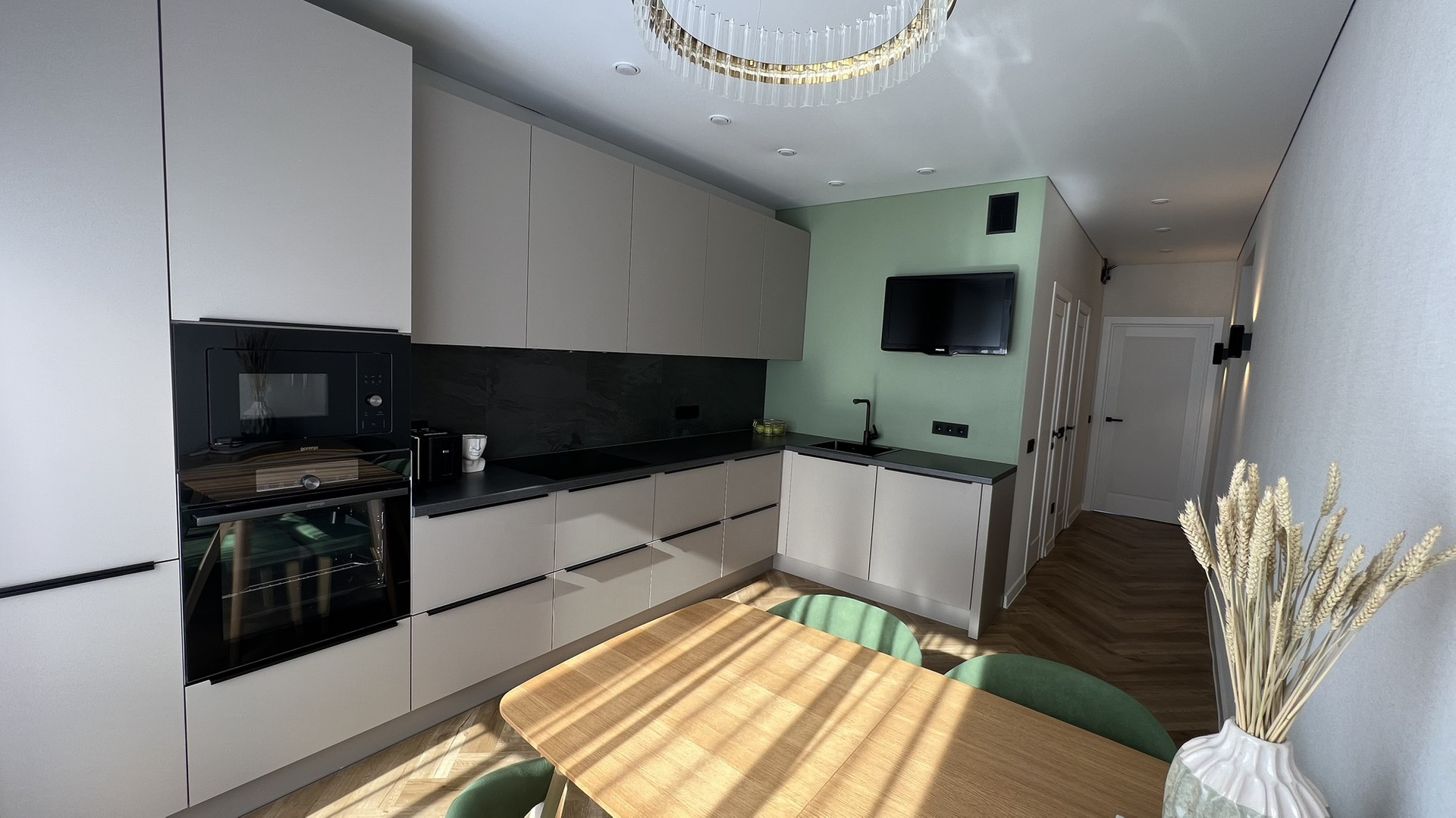 Большая кухня со встроенной техникой gorenje (холодильник, индукционная варочная панель, духовка, микроволновая печь, посудомоечная машина 60 см), кухонные стол и стулья из массива. Зеркальный встроенный гардеробный шкаф в прихожей при входе в квартиру, шкафы в гостиной и спальне, подвесная ТВ зона в гостиной и большой диван, вся мебель в квартире сделана на заказ.