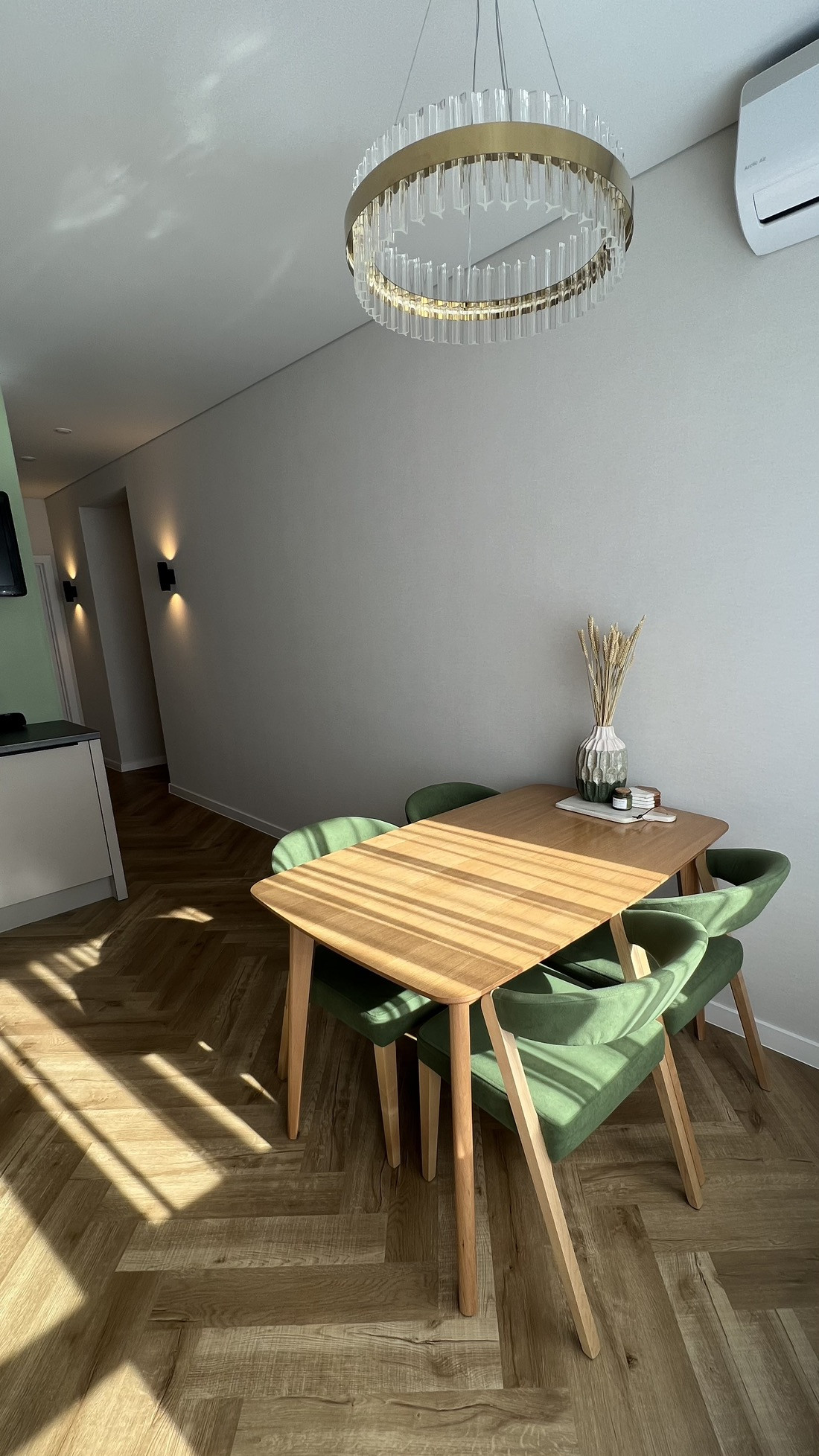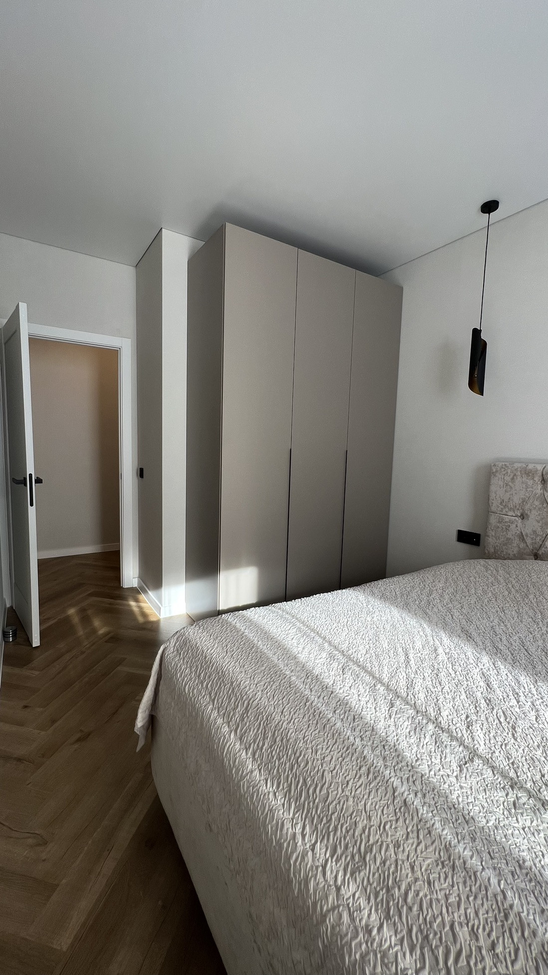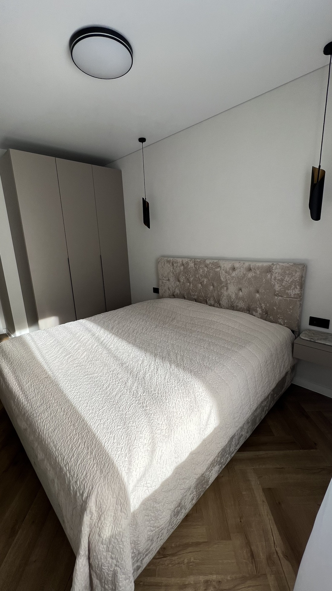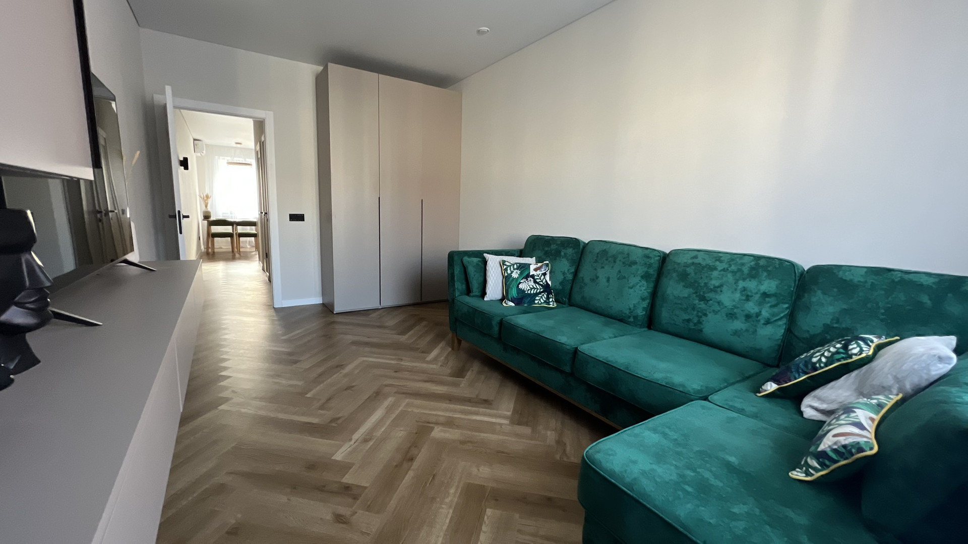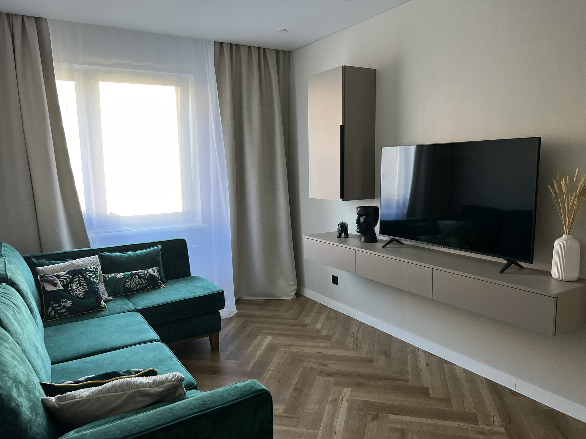 Большая кухня со встроенной техникой gorenje (холодильник, индукционная варочная панель, духовка, микроволновая печь, посудомоечная машина 60 см), кухонные стол и стулья из массива. Зеркальный встроенный гардеробный шкаф в прихожей при входе в квартиру, шкафы в гостиной и спальне, подвесная ТВ зона в гостиной и большой диван, вся мебель в квартире сделана на заказ.