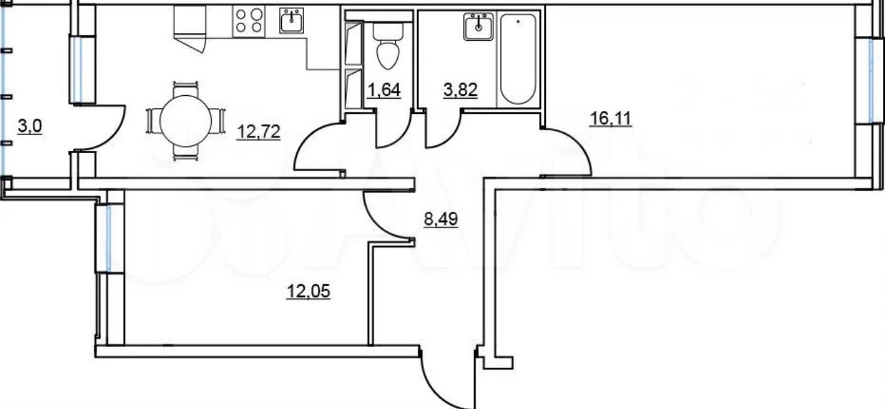 В квартире две изолированные комнаты (спальня 12.05 м² и гостиная 16.11 м²), кухня 12.72 м² с выходом на лоджию 3.00 м², раздельный санузел (3.82 м² + 1.64 м²), большая прихожая 8.49 м². Дом расположен в центре двора, защищенном от шума улиц, окна выходят во двор, высокий этаж, на этаже всего 5 квартир.
