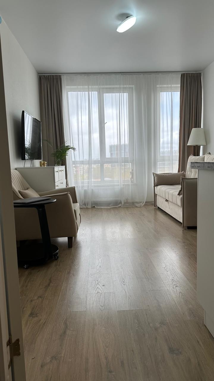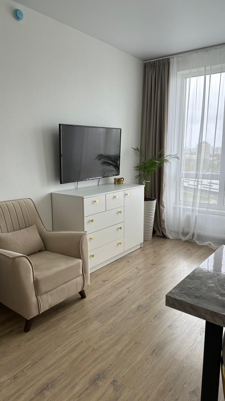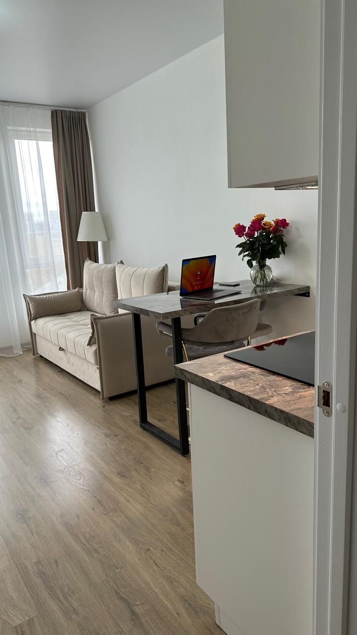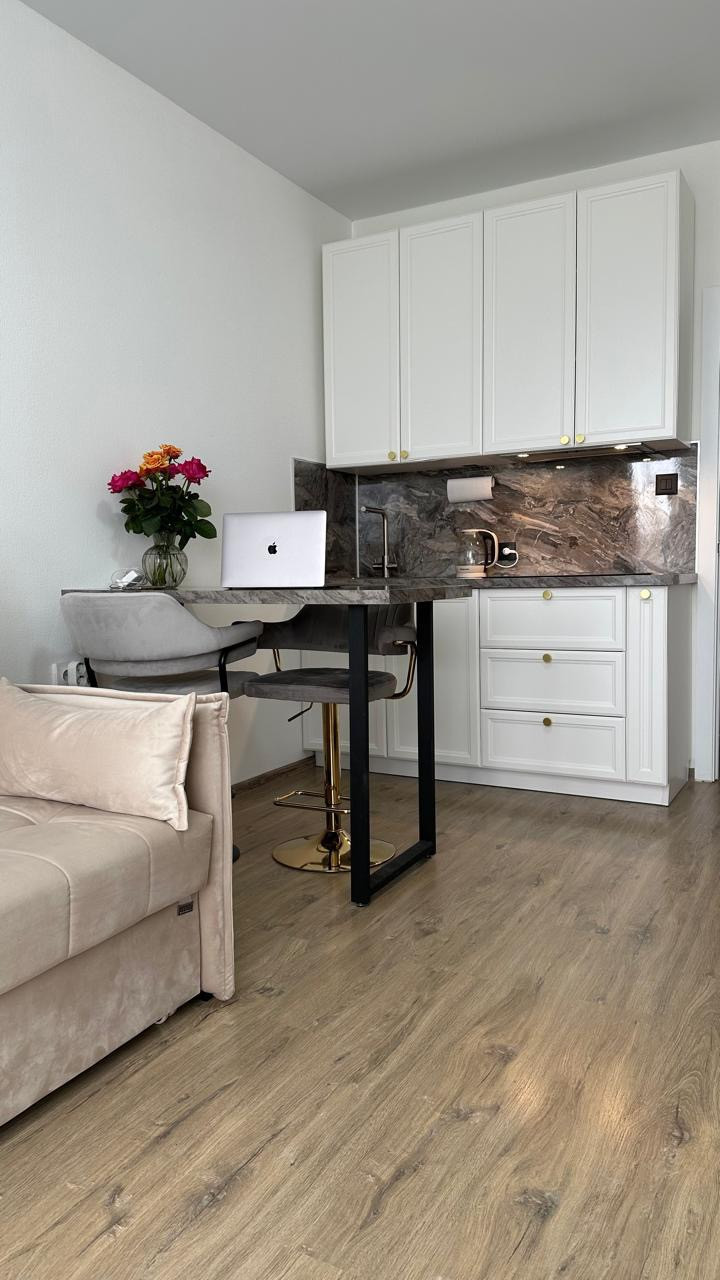 Стильная уютная студия в современном доме с консьержем. Апартамент оснащен всем необходимым: посудомоечная машина, стиральная машина с сушкой,холодильник, индукционная варочная поверхность, телевизор, шкаф, кресло, удобный комод и потрясающе удобный диван для постоянного сна.