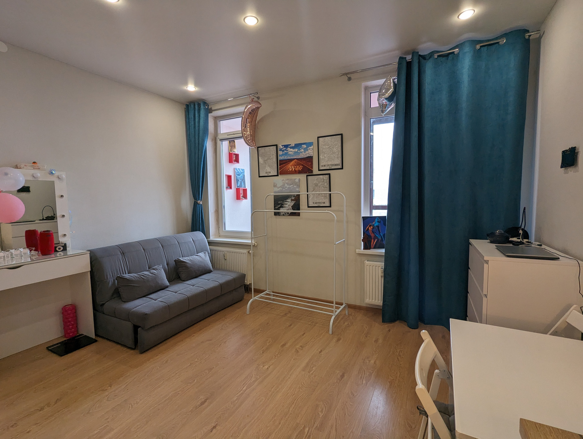 Квадратная форма комнаты с двумя окнами позволяет предусмотреть различные варианты зонирования.