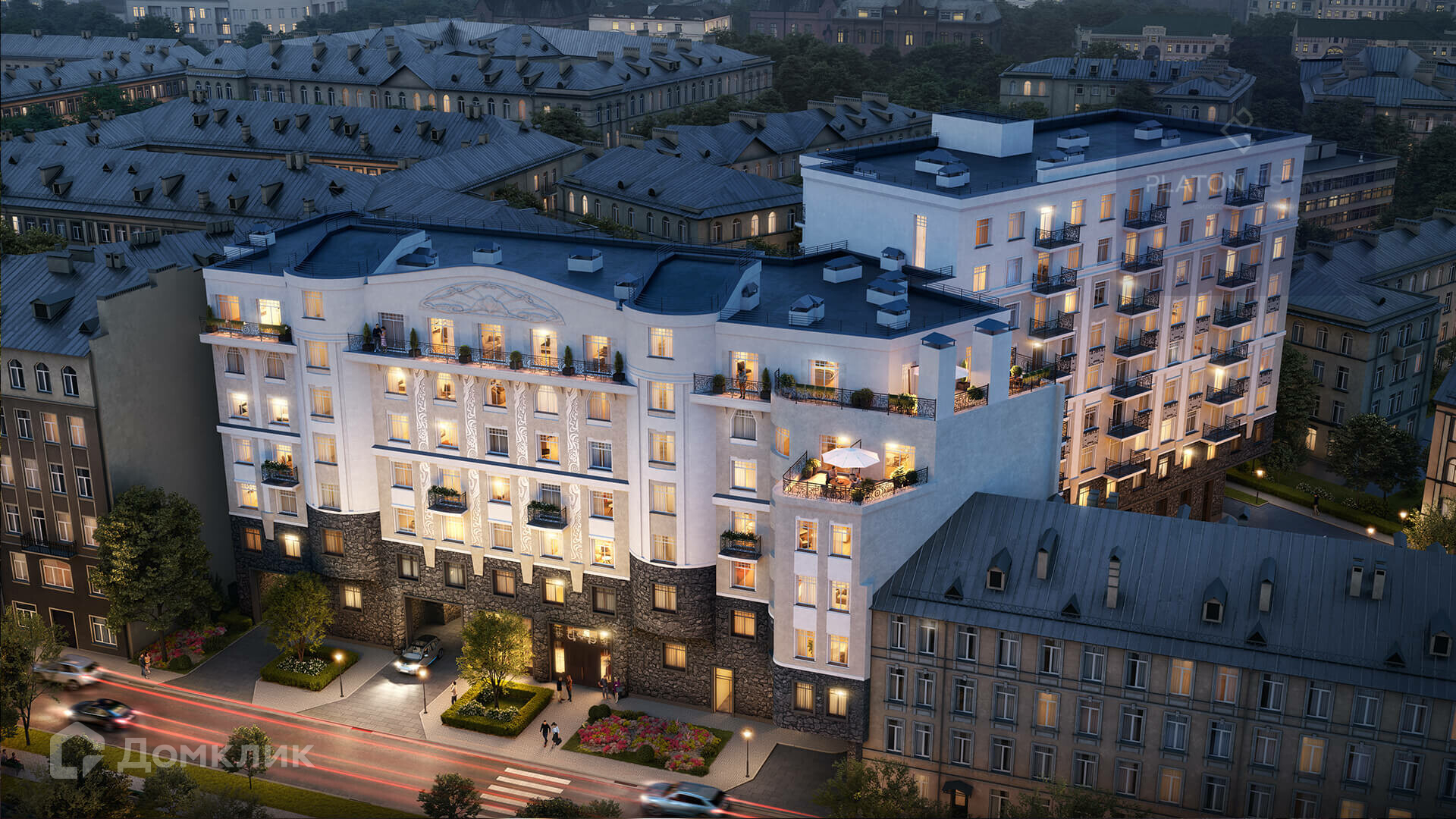 Внутридворовое пространство представляет собой благоустроенную территорию с большим количеством зелёных насаждений, уютными дорожками, площадками для отдыха и малыми архитектурными формами. Для комфорта жителей в доме есть отапливаемый подземный паркинг на 77 машино-мест.