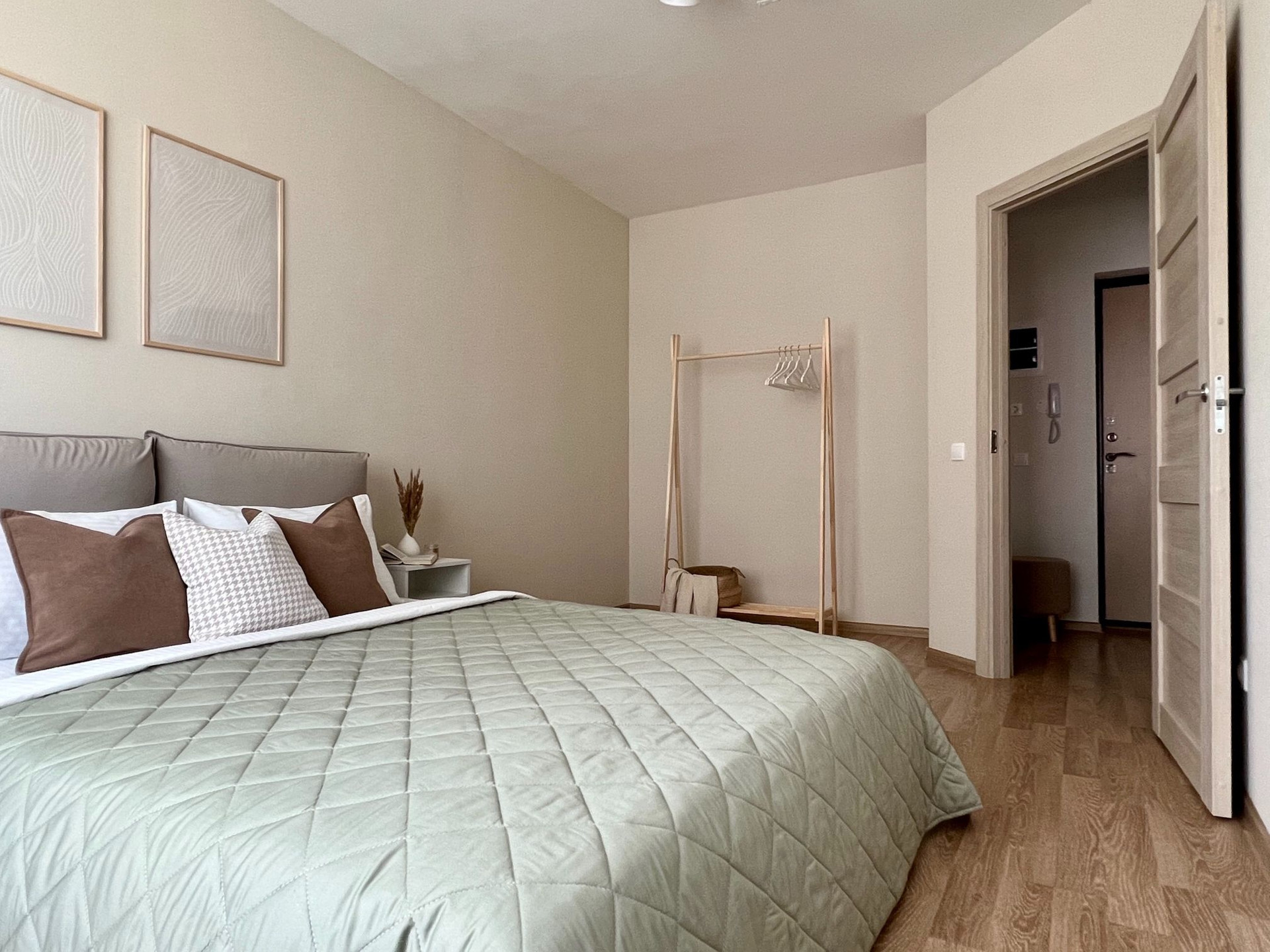 -удобная кровать в спальне с подьемным механизмом и коробом для хранения вещей
