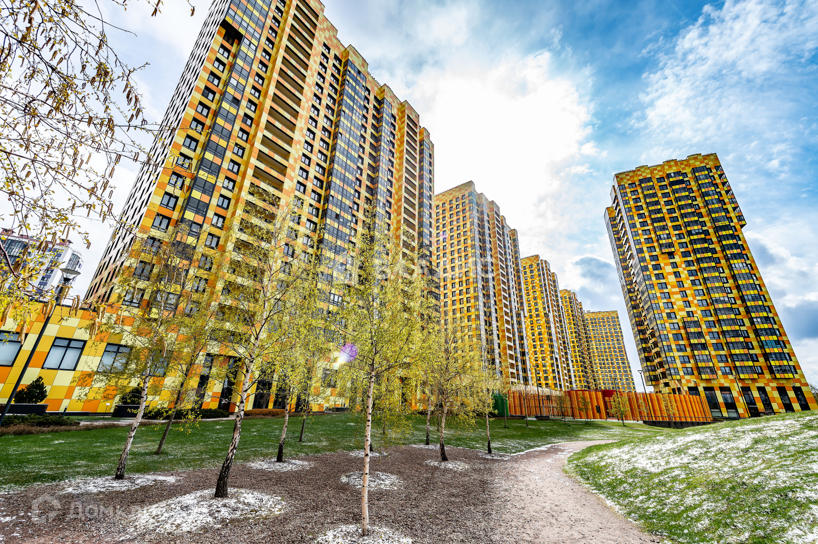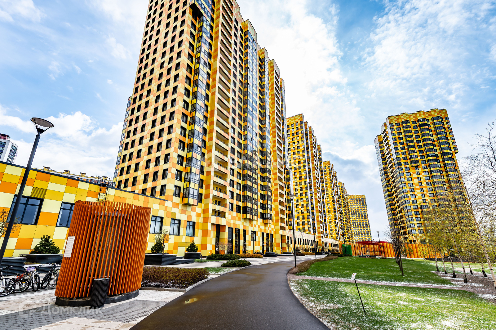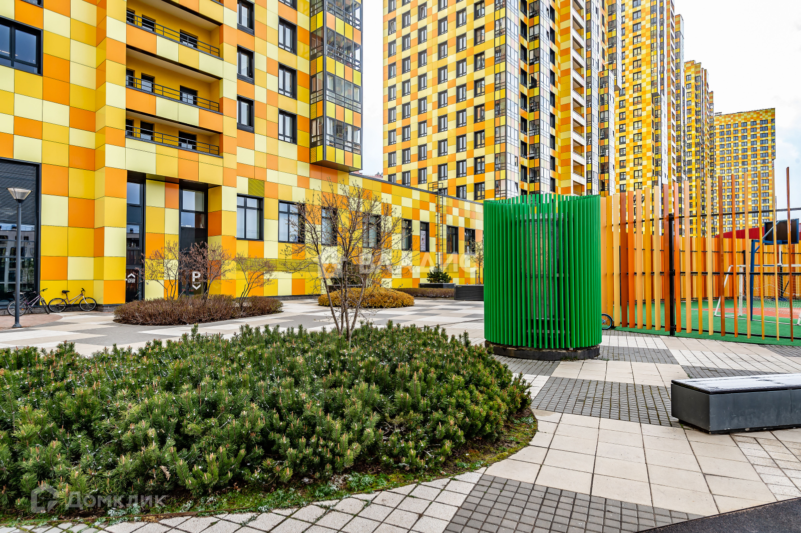 Игровые зоны, спортивные площадки, велодорожки и зоны отдыха с деревьями.