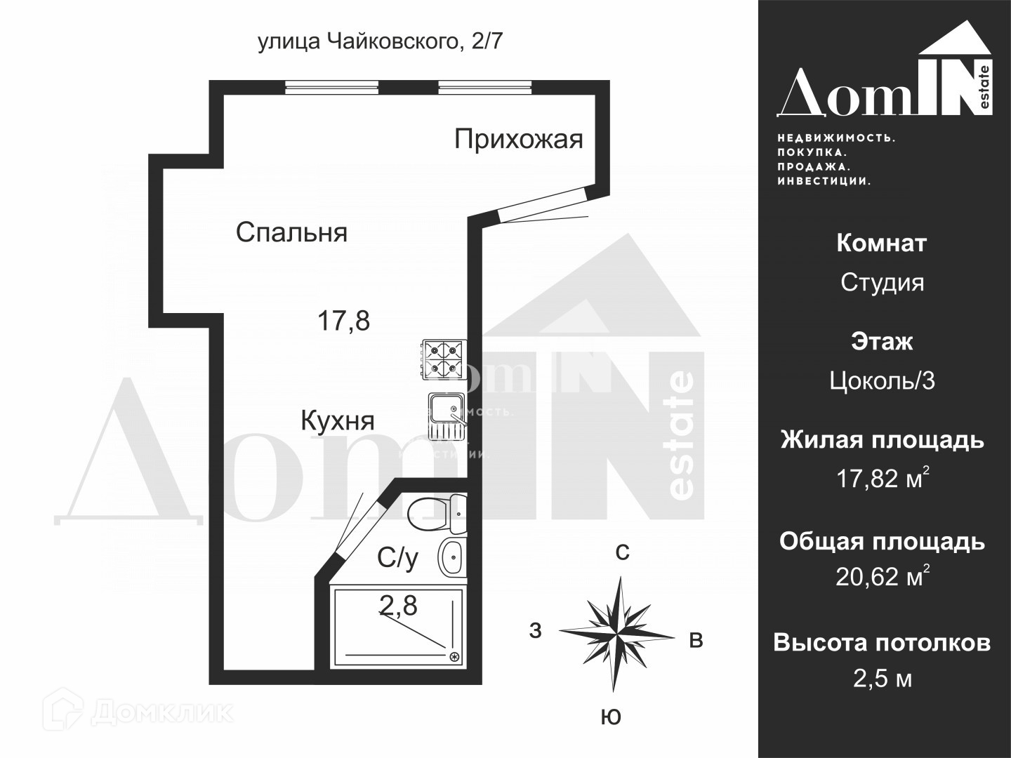 Квартира студия, 20.6 м2, этаж 1 / 3, на продажу в Санкт-Петербурге, улица Чайковского, 2/7