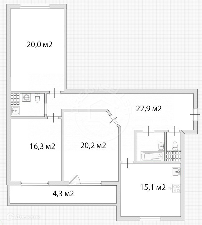 Комнаты изолированные: 20,2 + 20,0 + 16,3 кв.м.