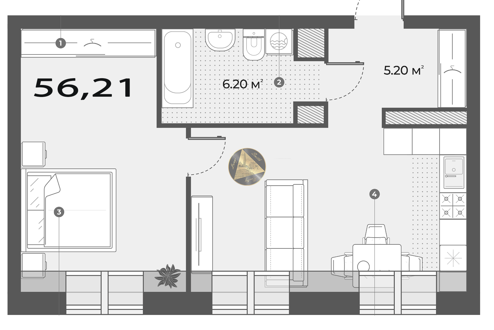 - Общая площадь квартиры 56,21 м2.