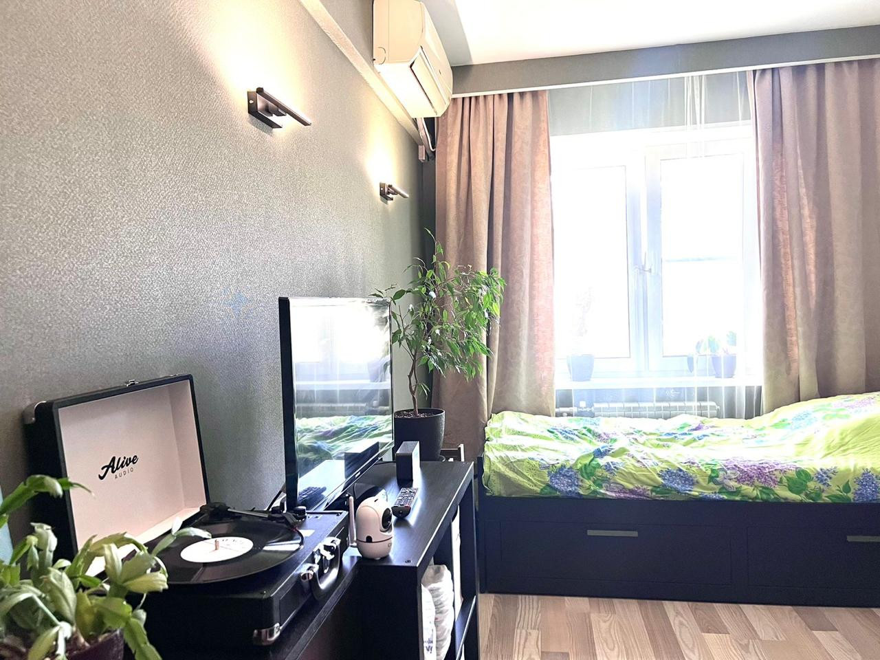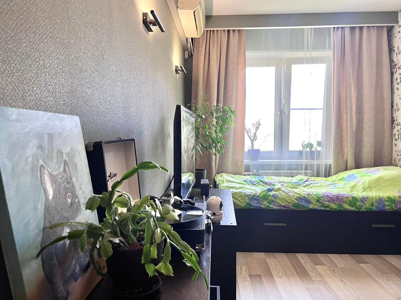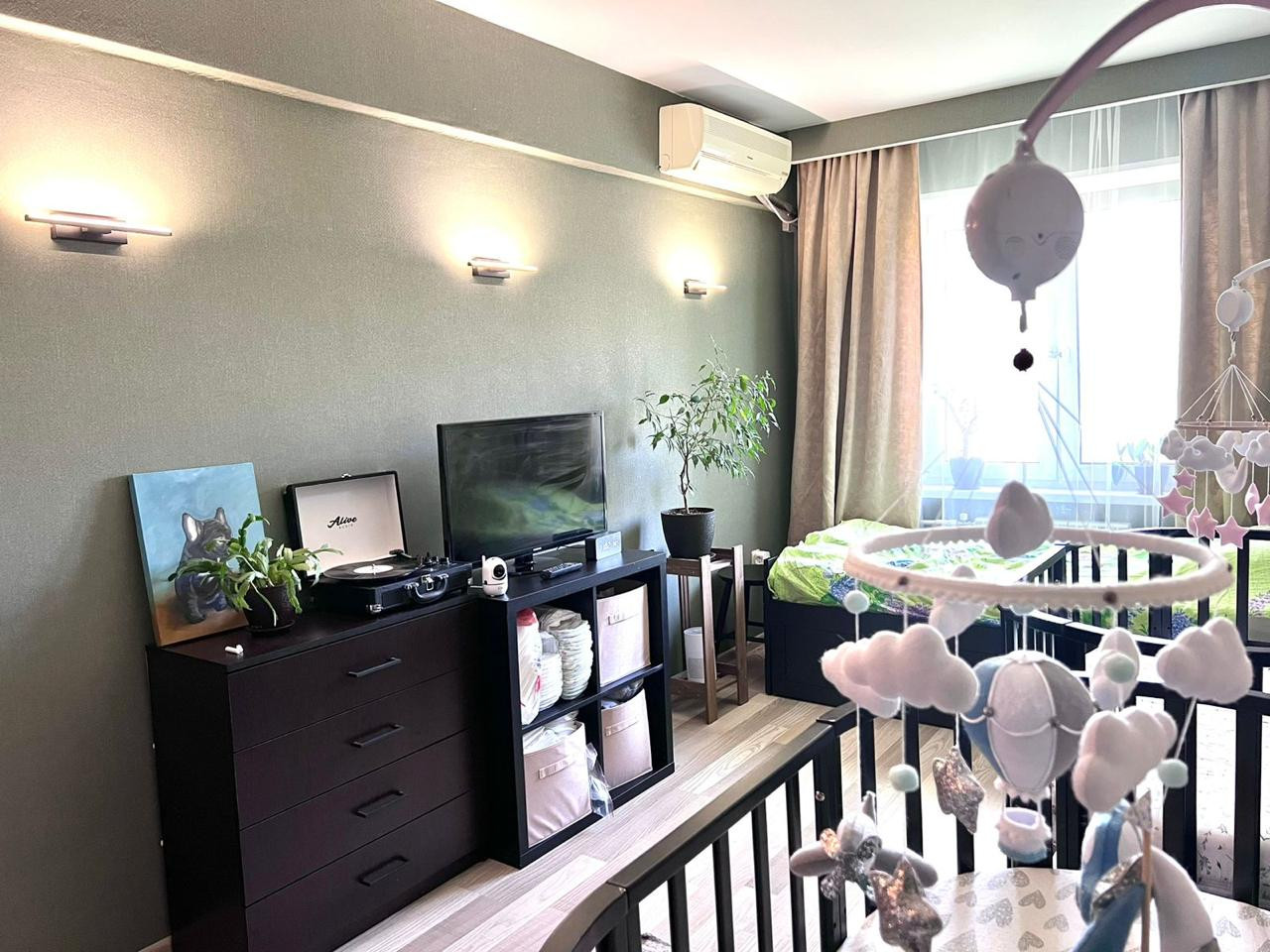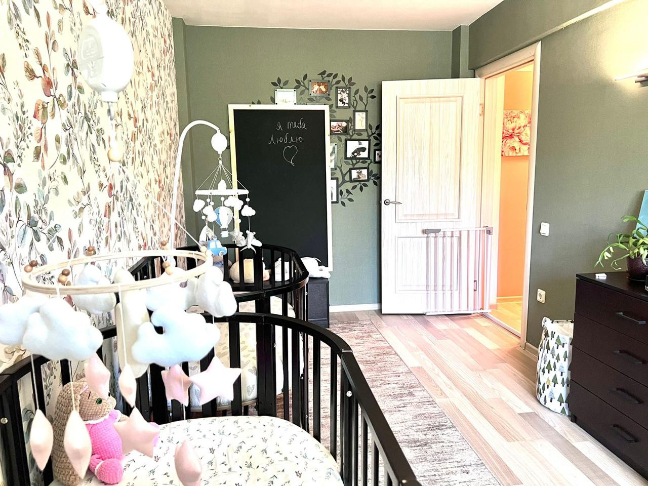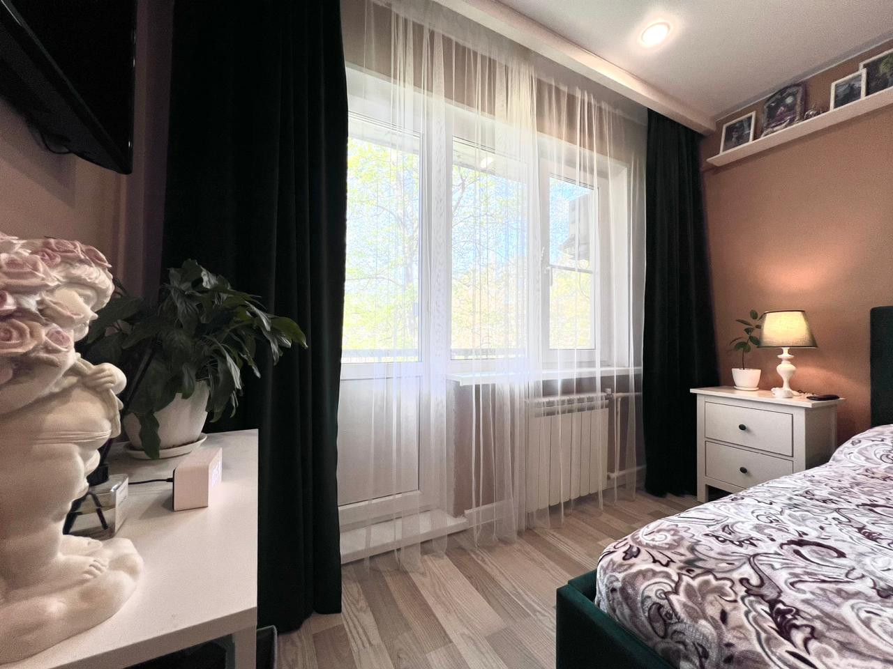 Кухня-гостиная и две изолированные комнаты. Одна из них оборудована под спальню, с балконом. Вторая - детская. Все окна квартиры выходят в зеленый двор.