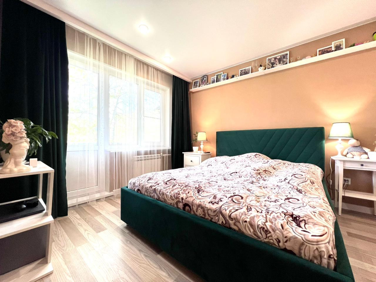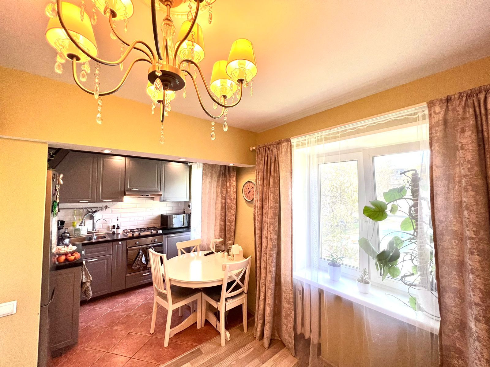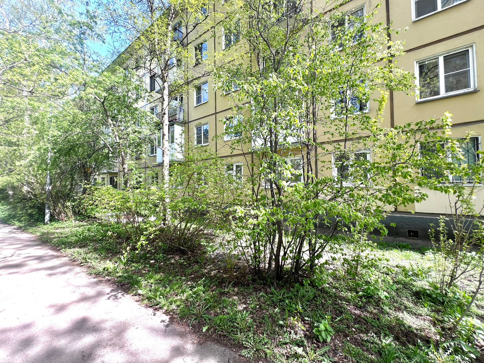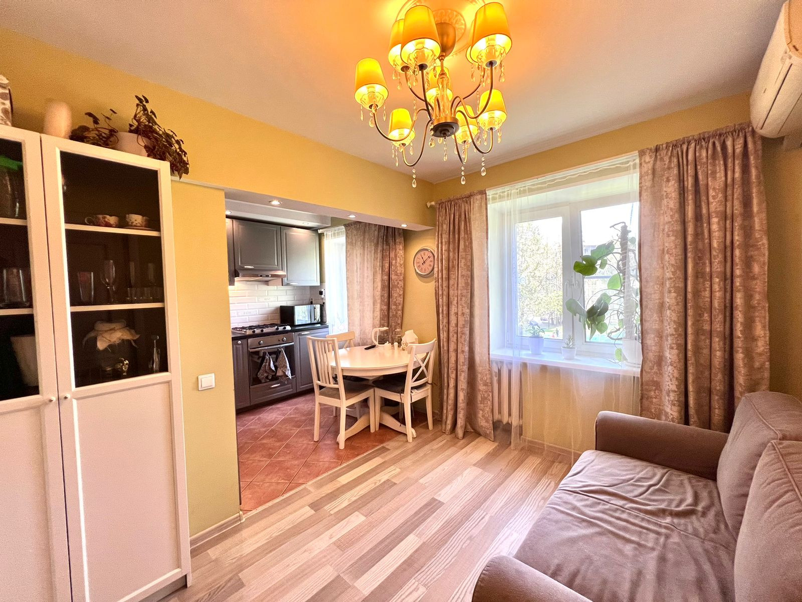 Кухня-гостиная и две изолированные комнаты. Одна из них оборудована под спальню, с балконом. Вторая - детская. Все окна квартиры выходят в зеленый двор.