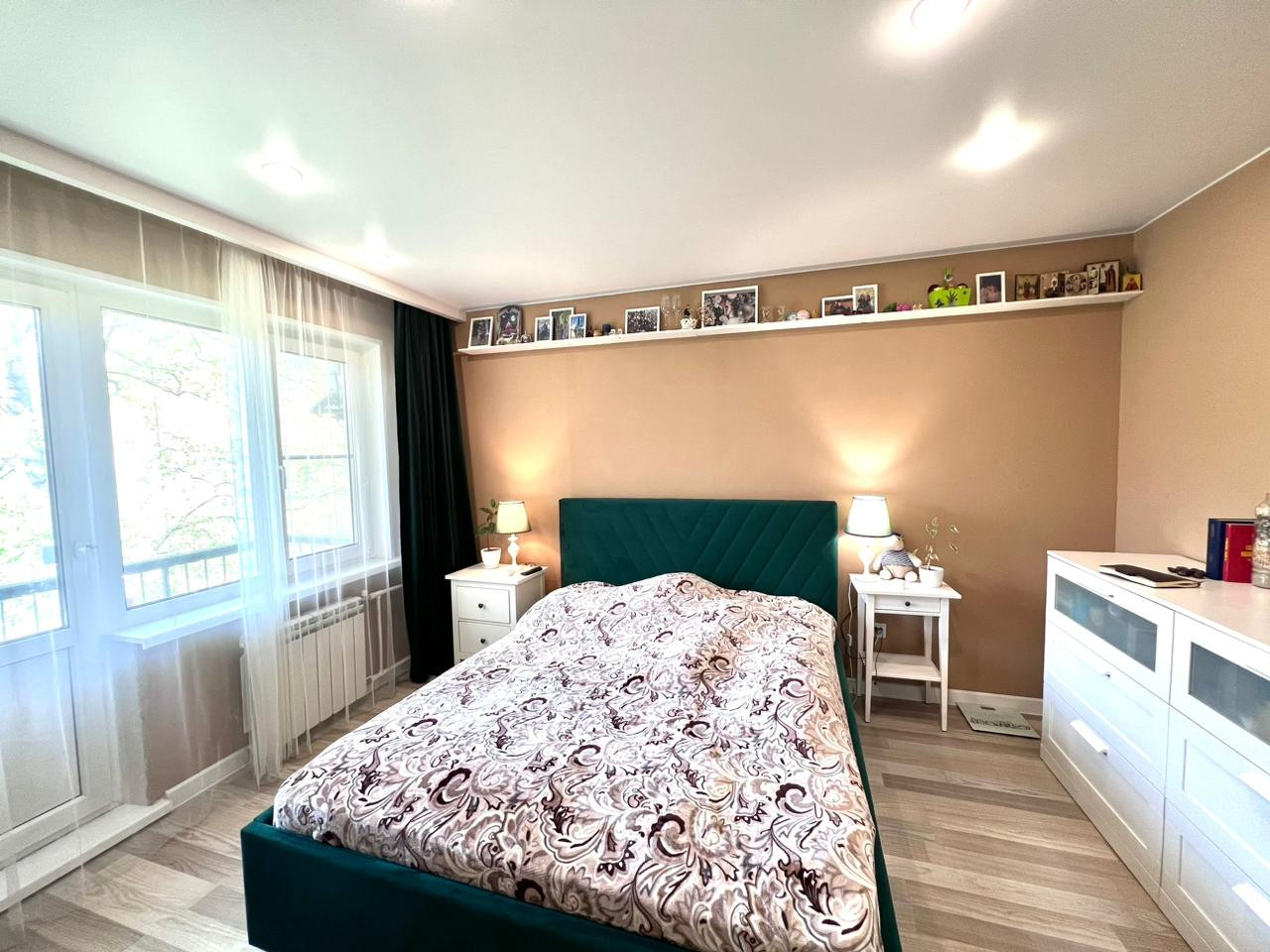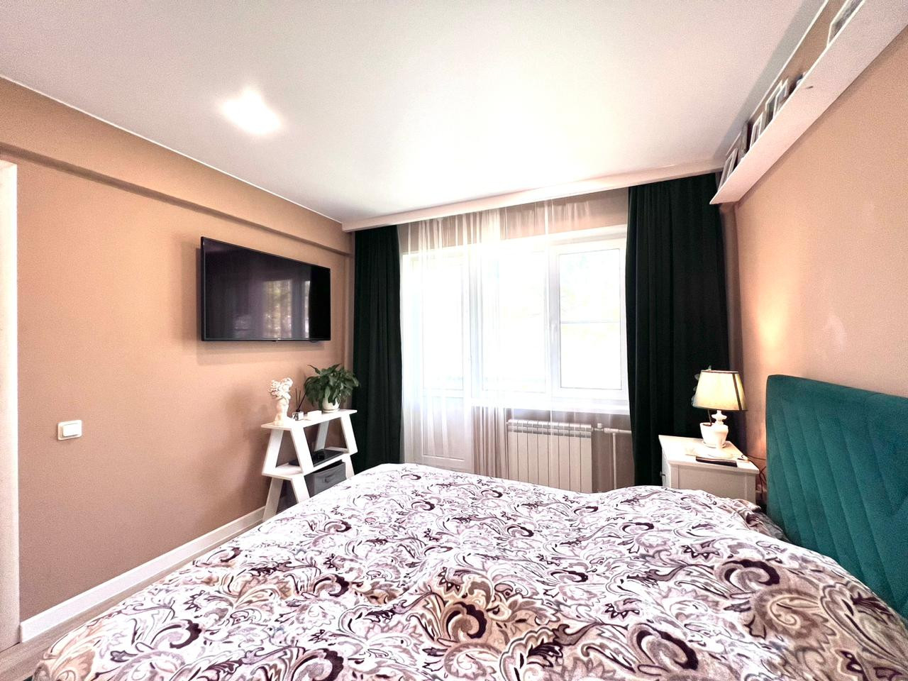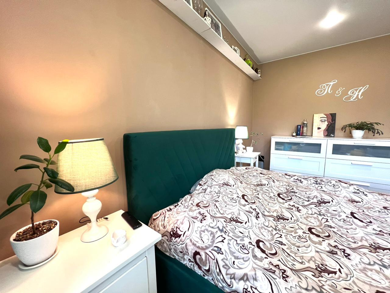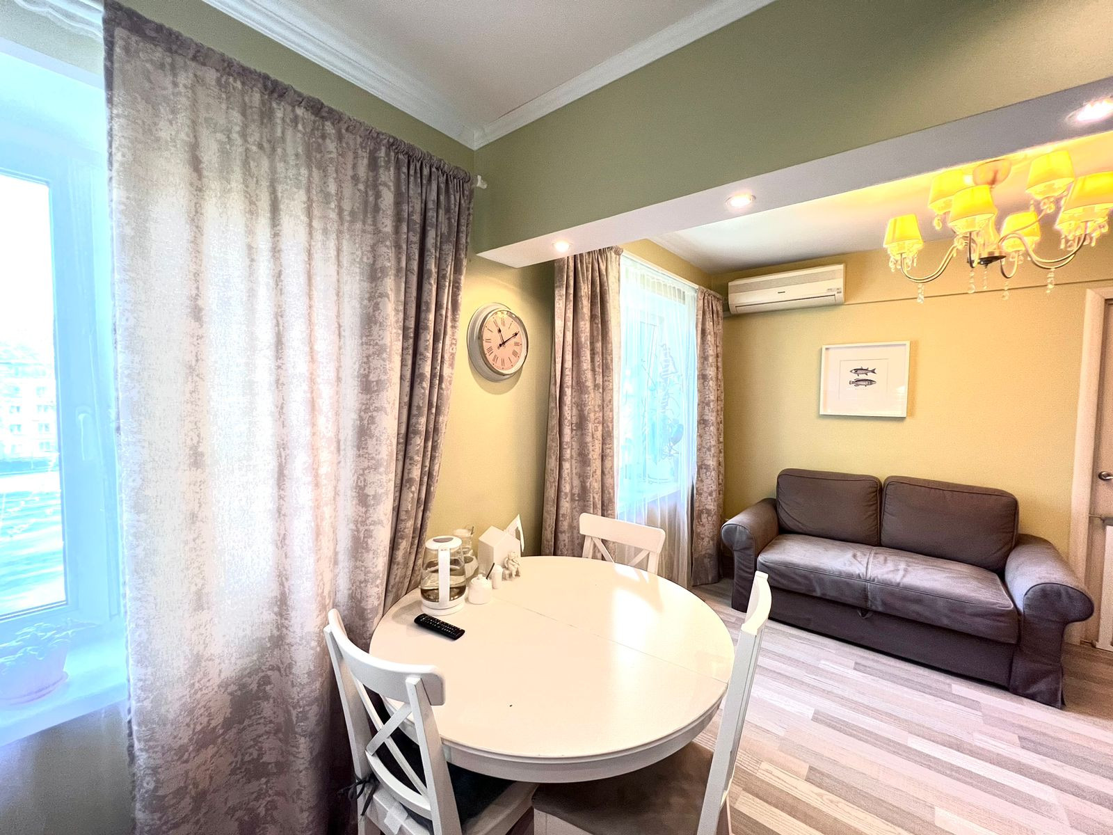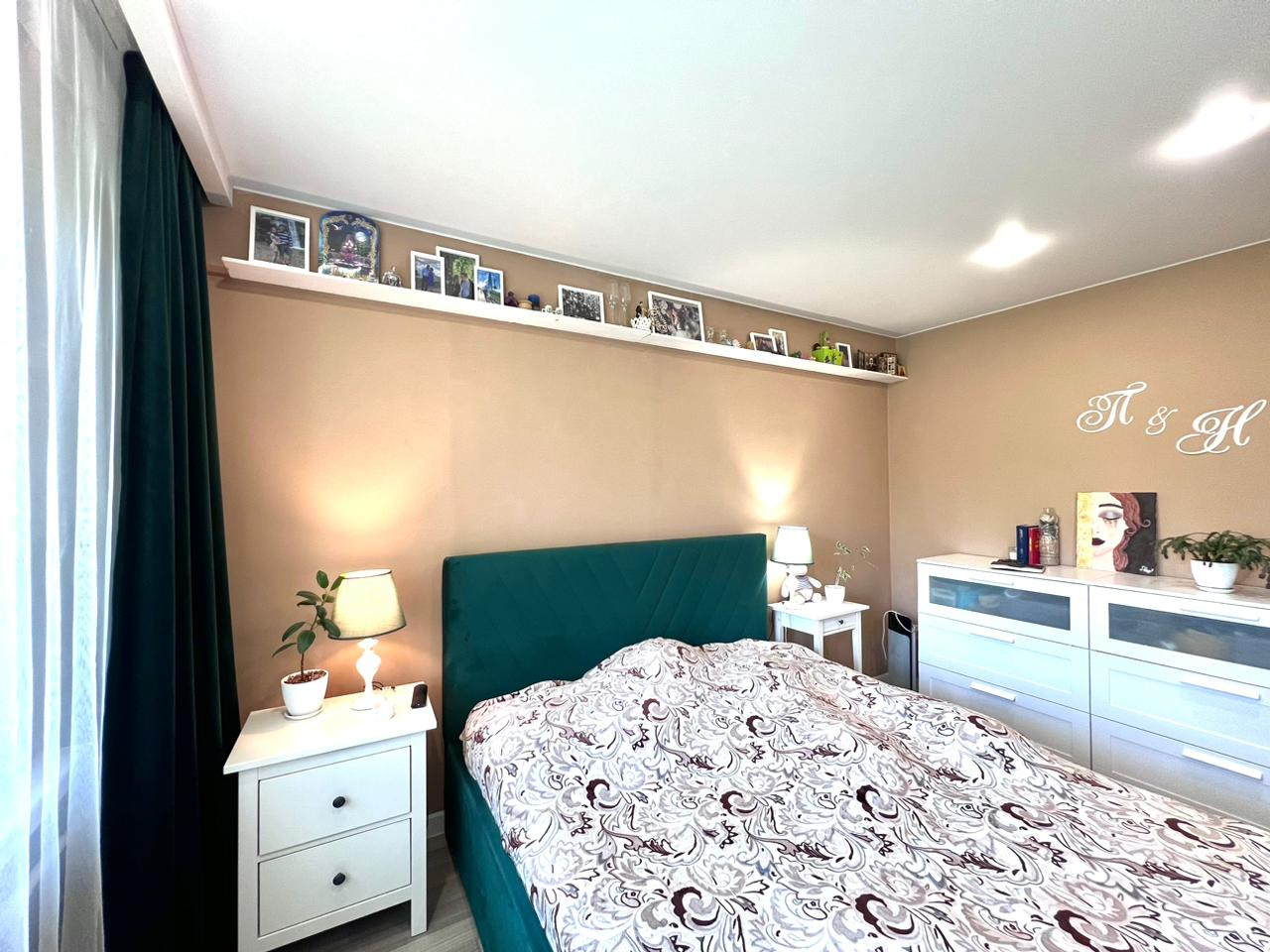 Кухня-гостиная и две изолированные комнаты. Одна из них оборудована под спальню, с балконом. Вторая - детская. Все окна квартиры выходят в зеленый двор.