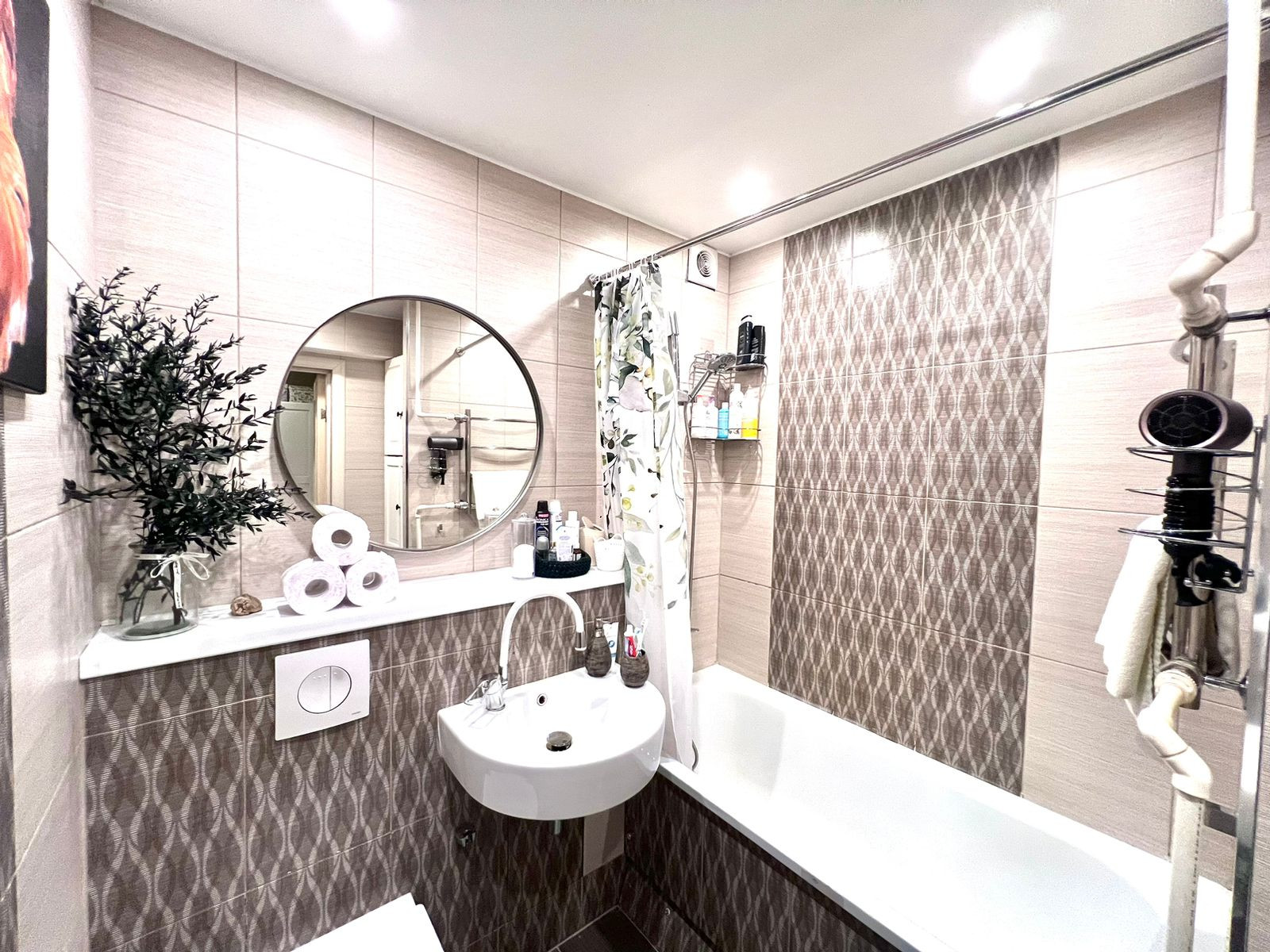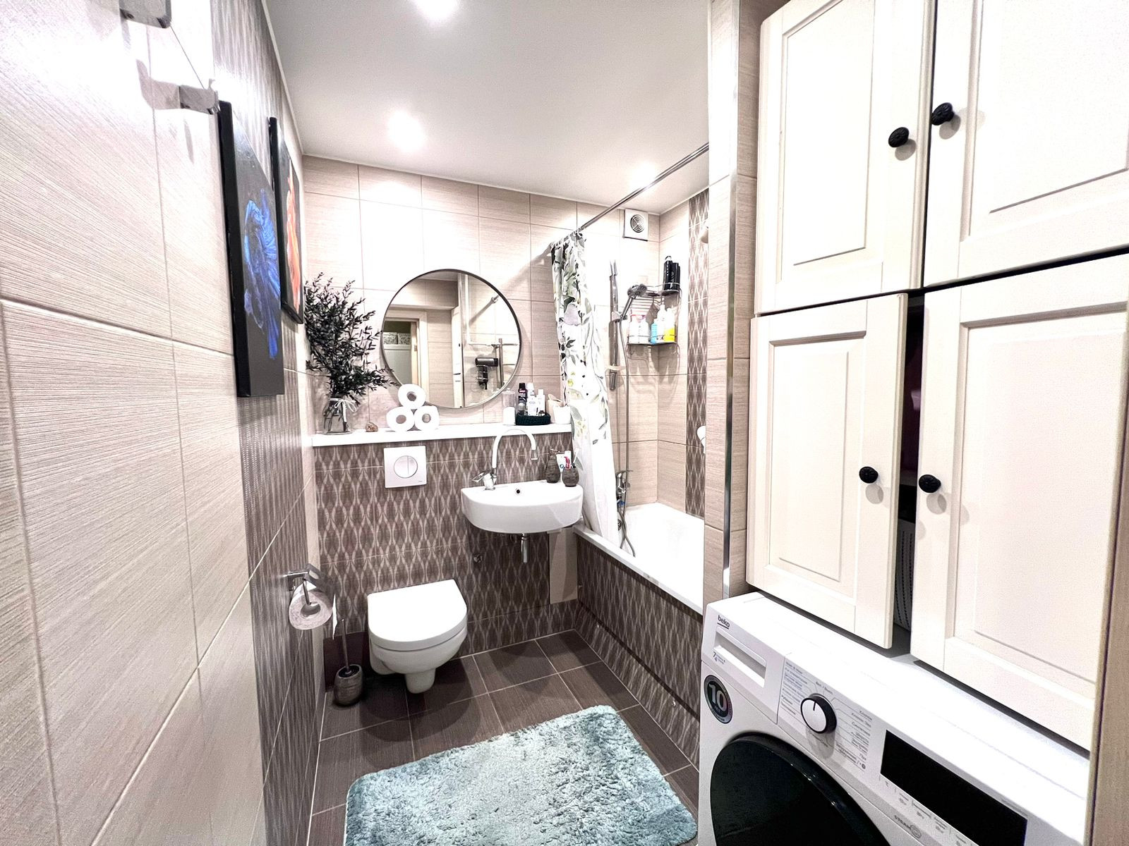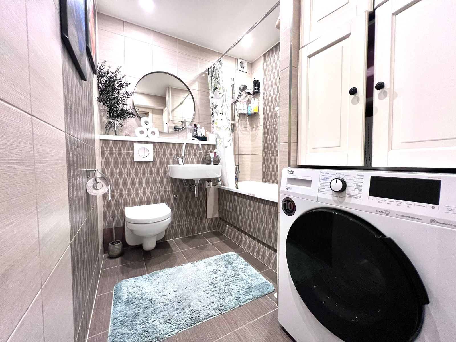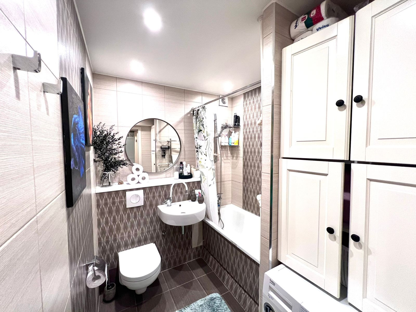 Санузел совмещенный. Просторный. Достаточно места для стиральной машины и шкафа для хранения бытовой химии.