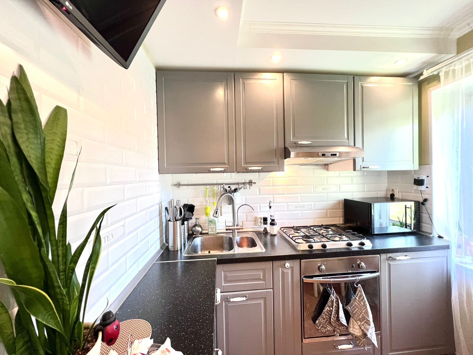 Кухня Икея со встроенной варочной панелью, духовым шкафом и вытяжкой так же останутся в подарок новому хозяину.