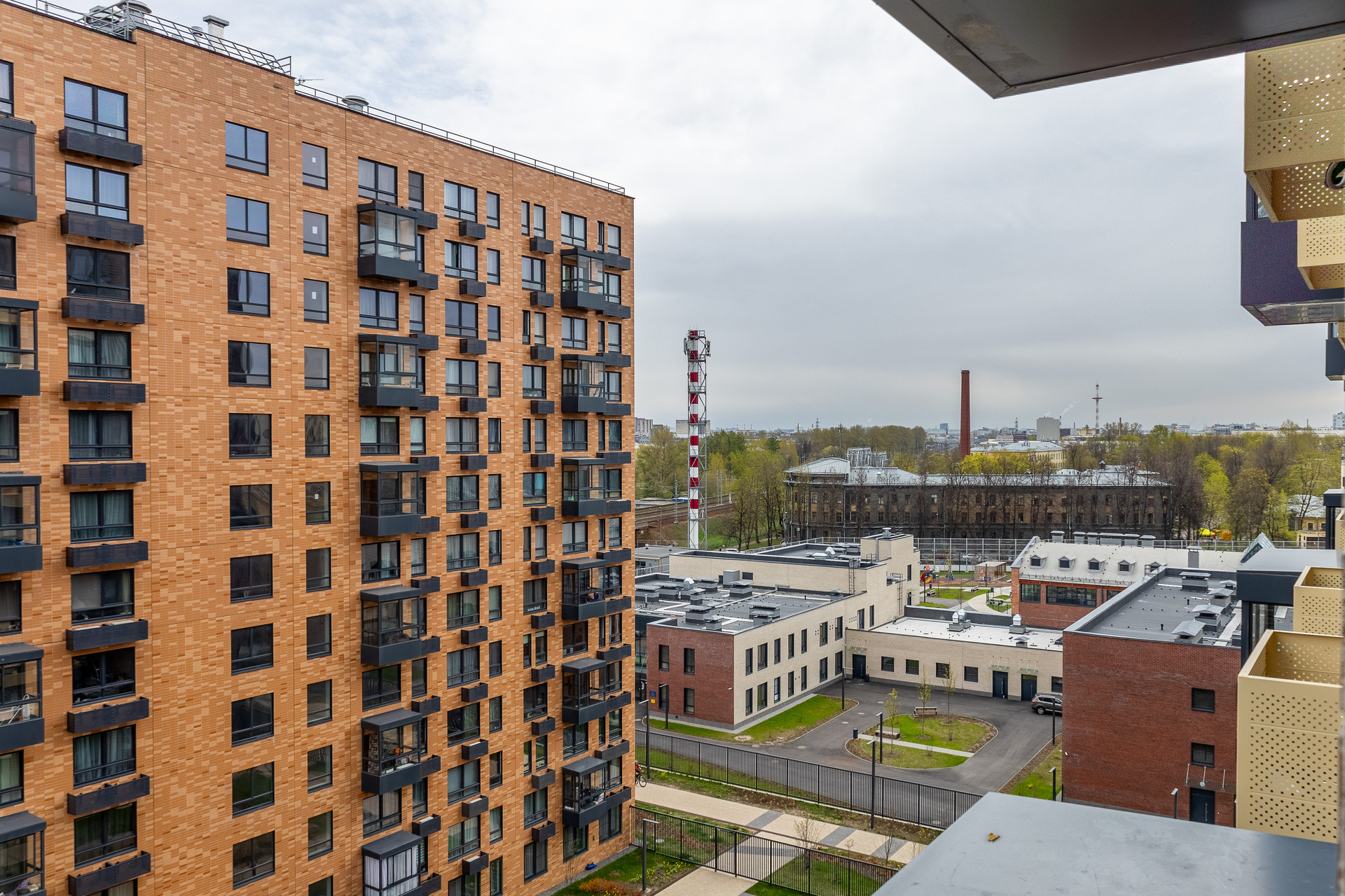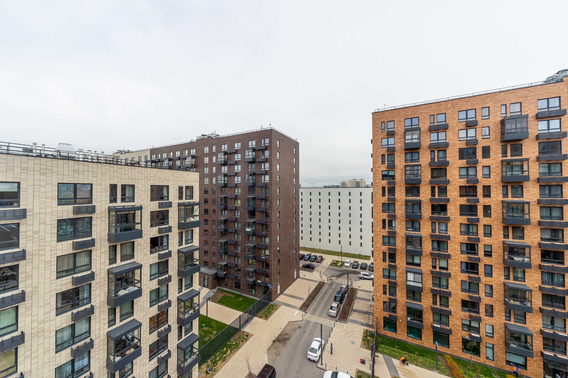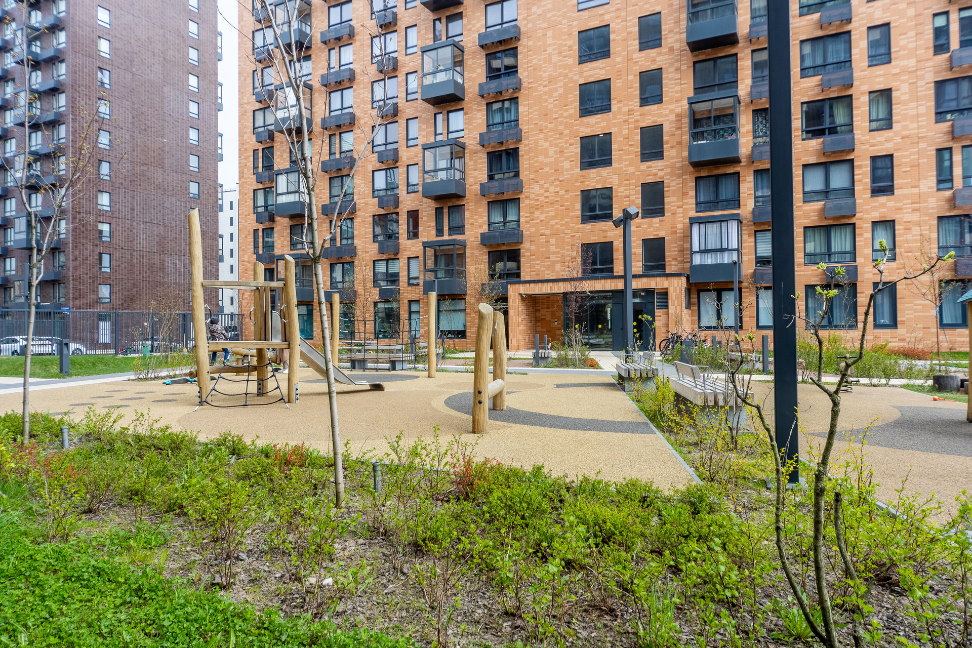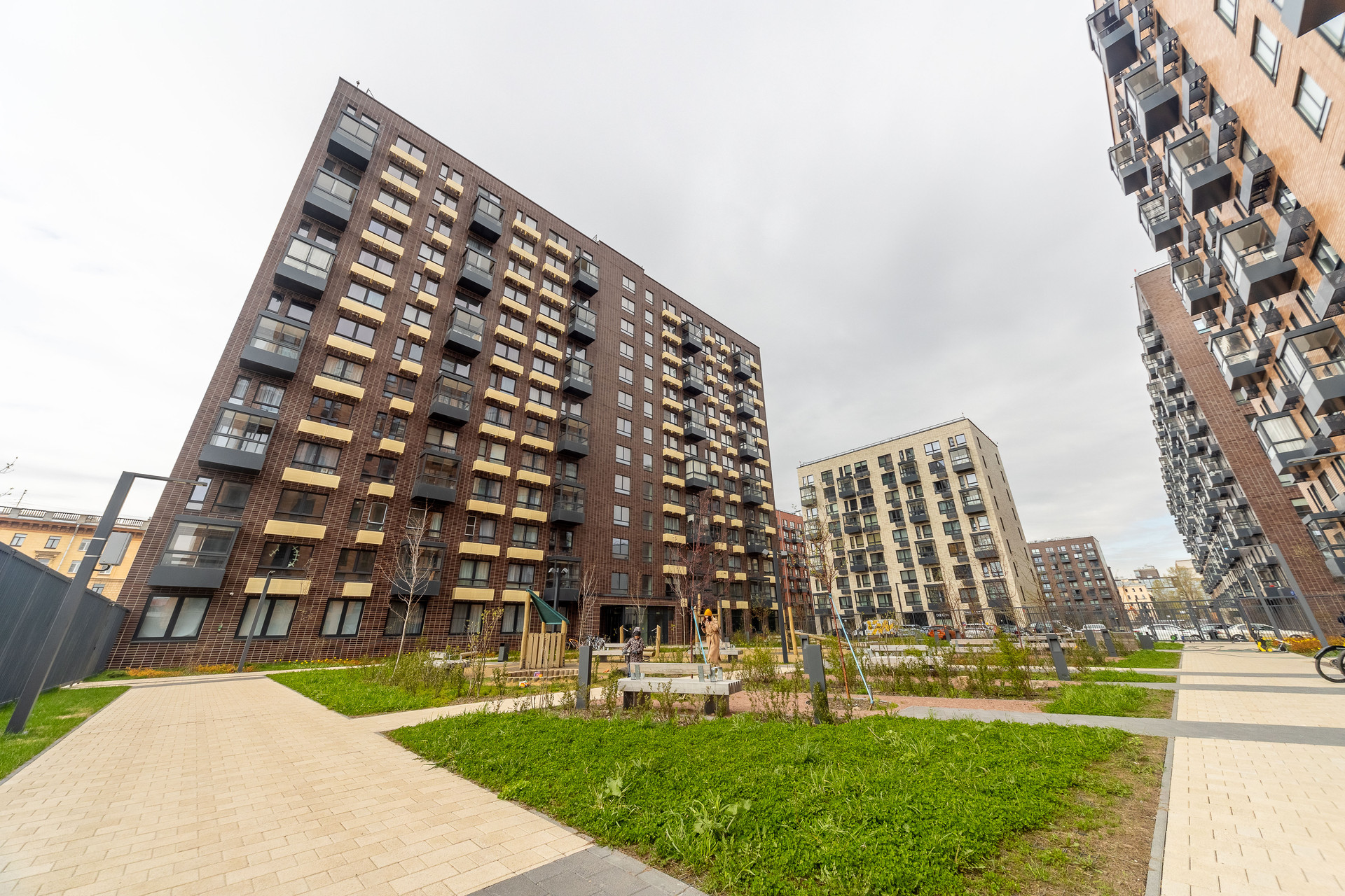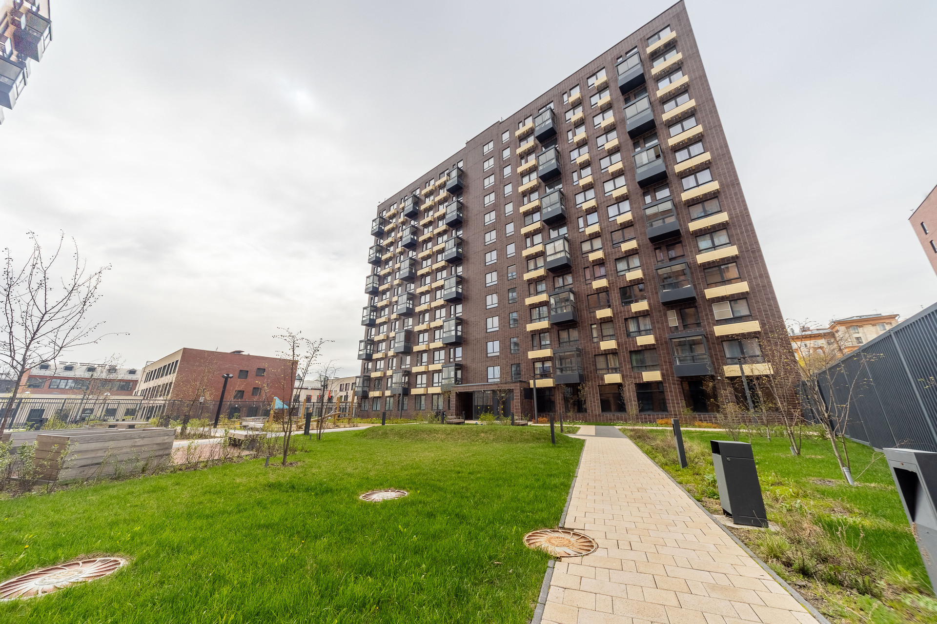 Закрытый внутренний двор, пожалуй лучшая благоустроенная территория среди конкурентов в данной локации. Двери общего пользования открываются через приложение (очень удобно при взаимодействии с курьерами). Достаточно большое количество гостевых парковочных мест, также для вашего удобства имеется 2 наземных паркинга.