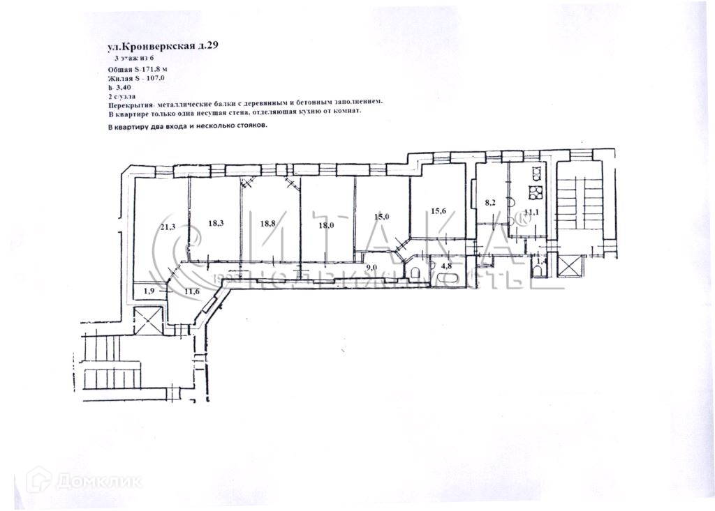 Многокомнатная квартира, 171.8 м2, этаж 3 / 6, на продажу в Санкт-Петербурге, Кронверкская улица, 29/37Б