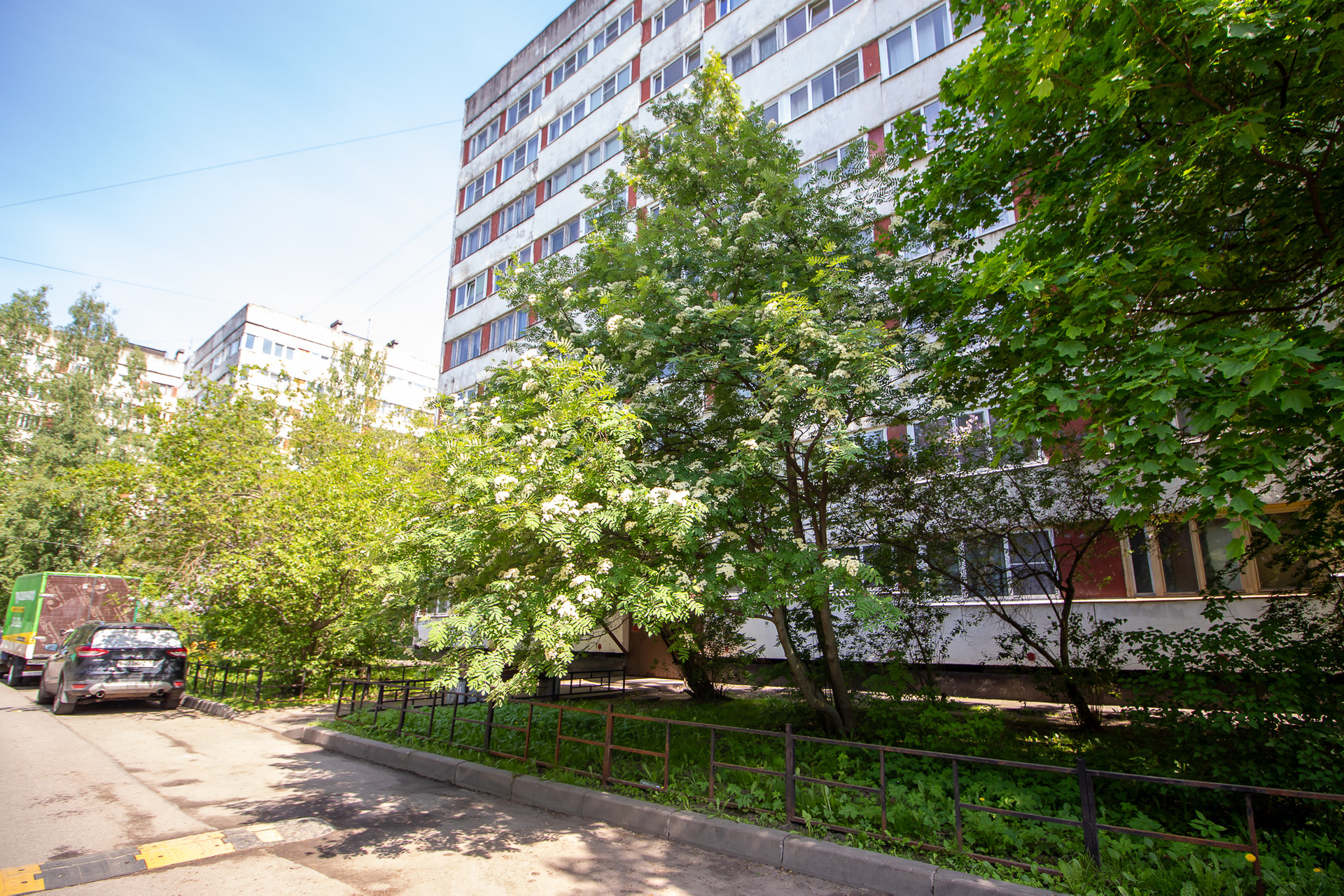 Дом находится в зелёном дворе Выборгского района, рядом с ним много детских площадок, магазинов, детских садов и школ. До метро можно дойти за 15 минут, а до торгового центра Гранд Каньон — за 5 минут.