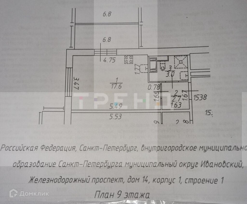 Квартира студия, 23.3 м2, этаж 9 / 14, на продажу в Санкт-Петербурге, Железнодорожный проспект, 14к1