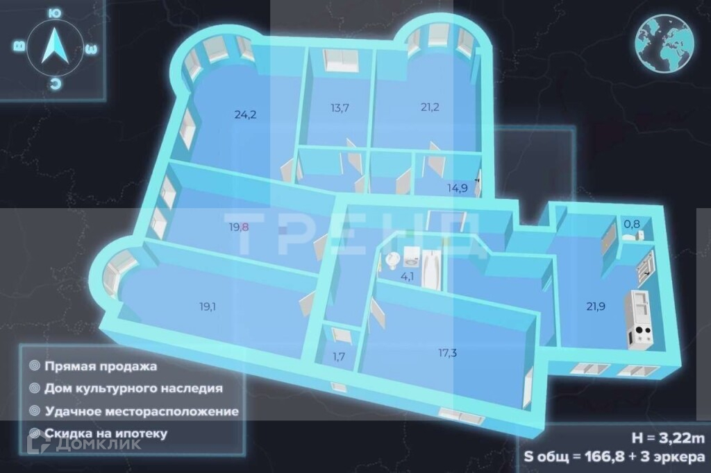 Действующий камин, 3 эркера, окна выходят на 3 стороны Восток, Запад и Юг.
