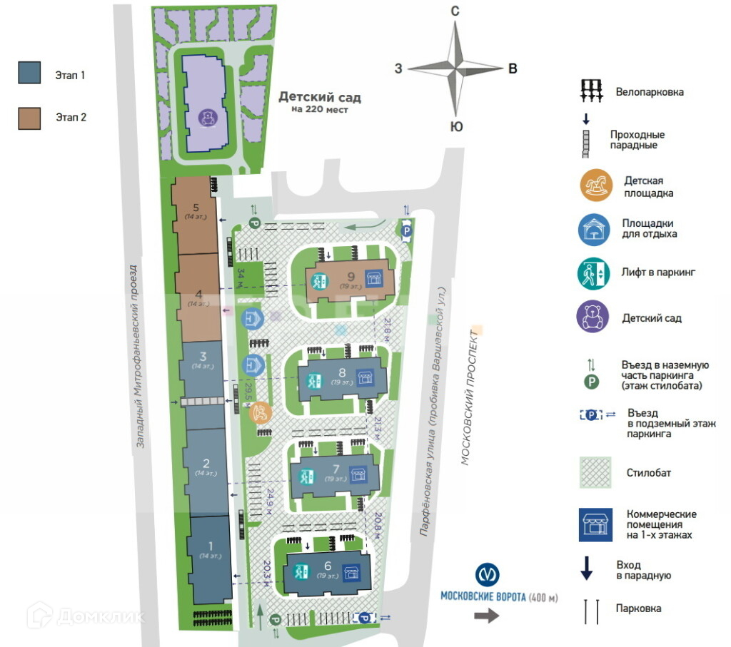 Развитая инфраструктура квартала позволит вам найти предметы первой необходимости не выходя из жилого комплекса, в том числе кабинет врача общей практики и детские сады в составе квартала, а также школа в ЖК "Московские ворота" на 825 мест.