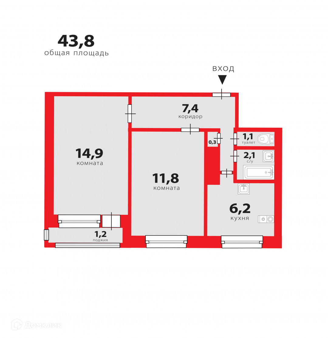 Общая площадь 43.8 м2