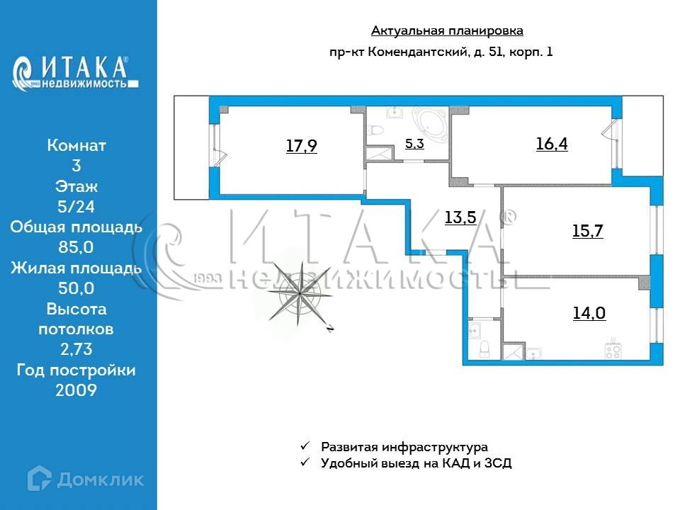3-комнатная квартира, 85 м2, этаж 5 / 24, на продажу в Санкт-Петербурге, Комендантский проспект, 51к1