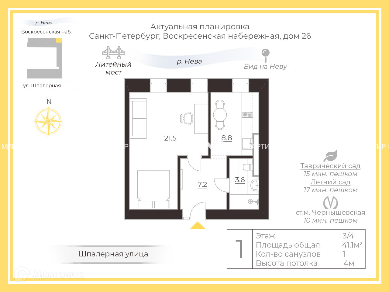 1-комнатная квартира, 41.1 м2, этаж 3 / 4, на продажу в Санкт-Петербурге, Воскресенская набережная, 26