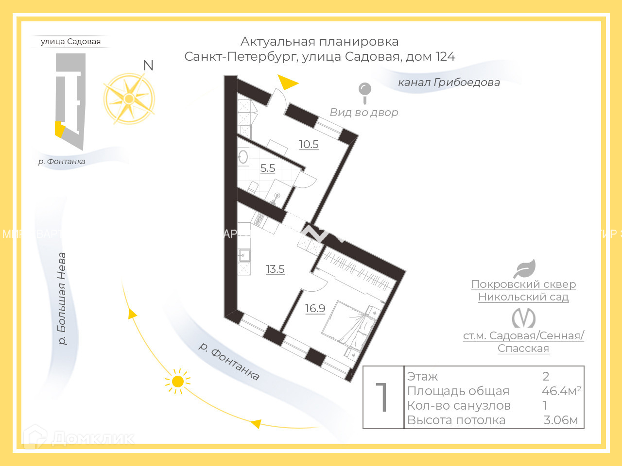1-комнатная квартира, 46.4 м2, этаж 2 / 3, на продажу в Санкт-Петербурге, набережная реки Фонтанки, 195