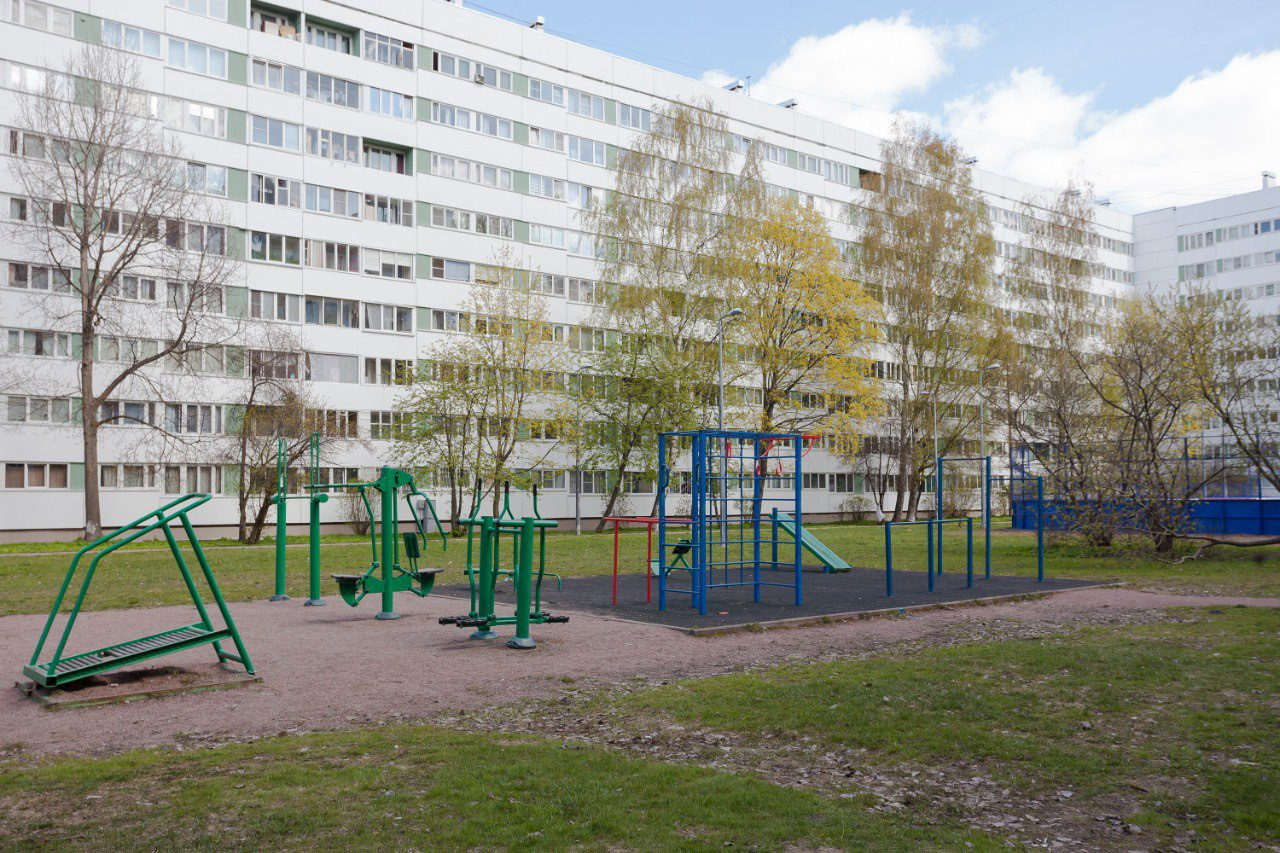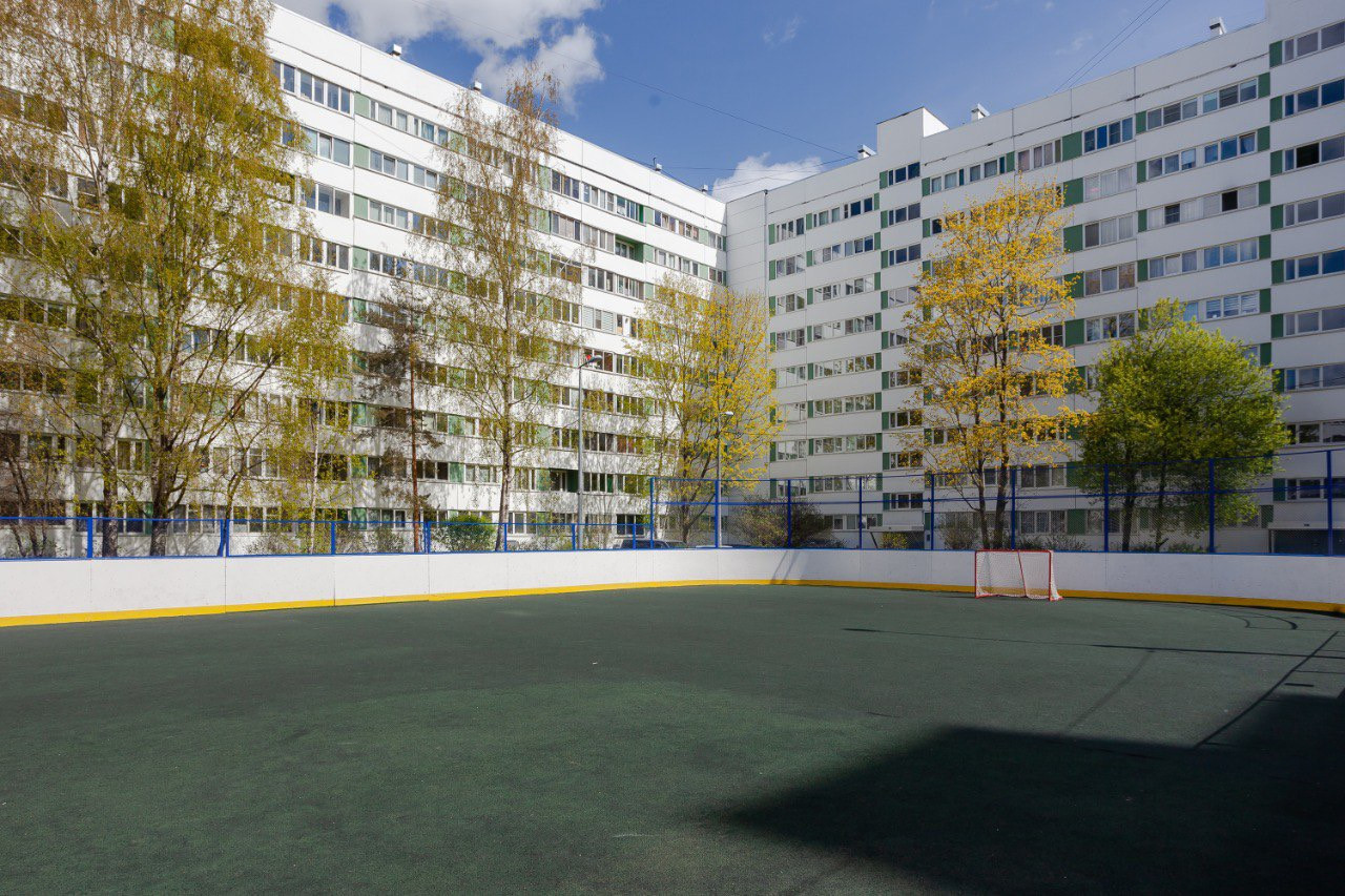 Территория дома очень зелёная, взрослые деревья и кустарники. Внутри двора детские и спортивные площадки, хоккейное поле, зимой заливается каток. Есть видеонаблюдение, доступ к камере у каждого жителя дома. Квартира расположена в стороне от проспекта.