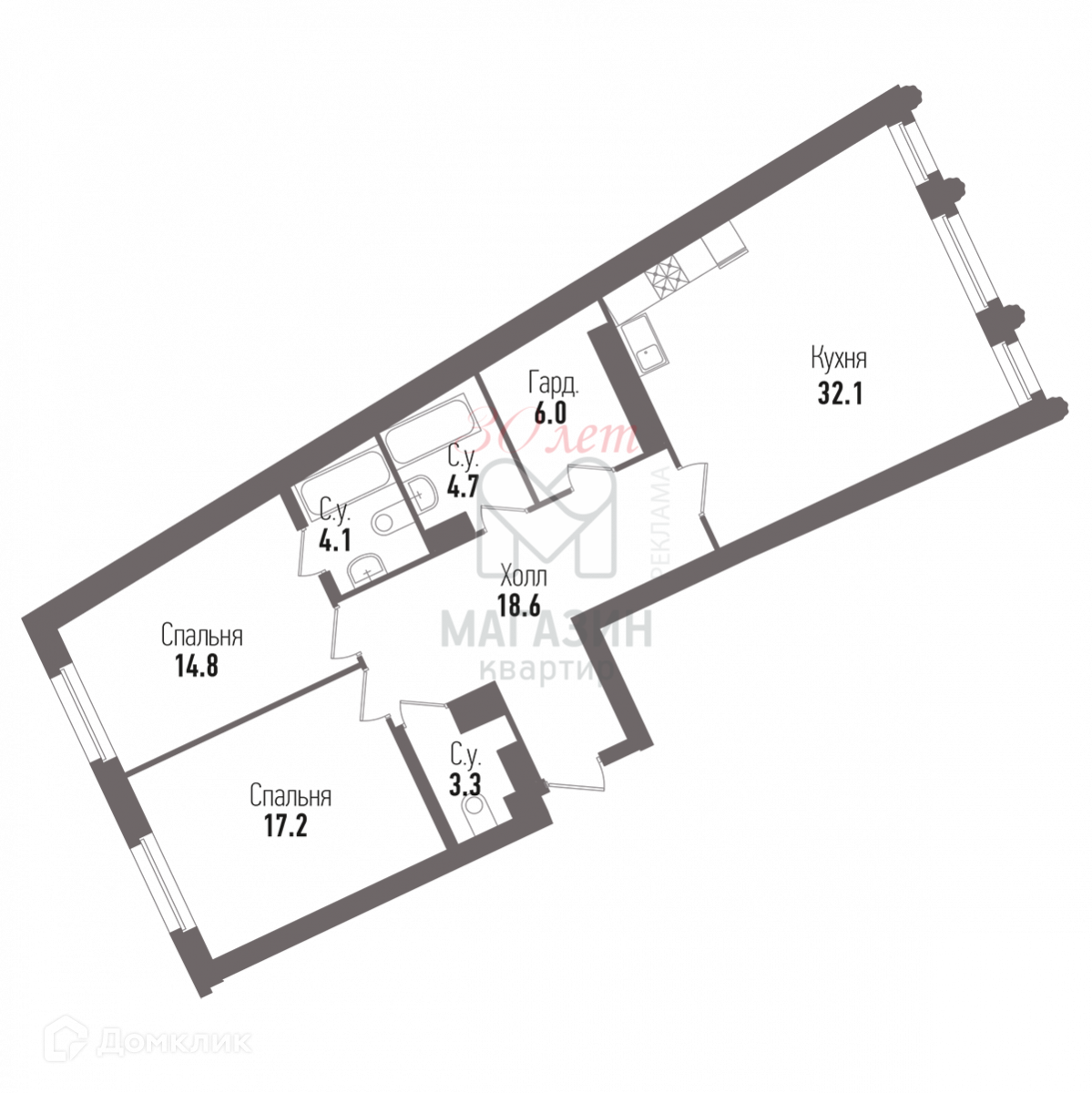 - Просторная двухсторонняя планировка площадью - 101 м2
