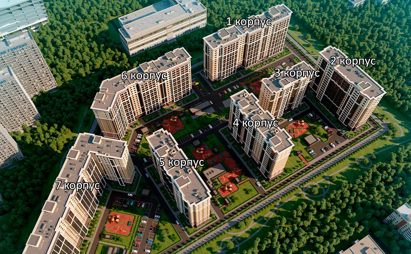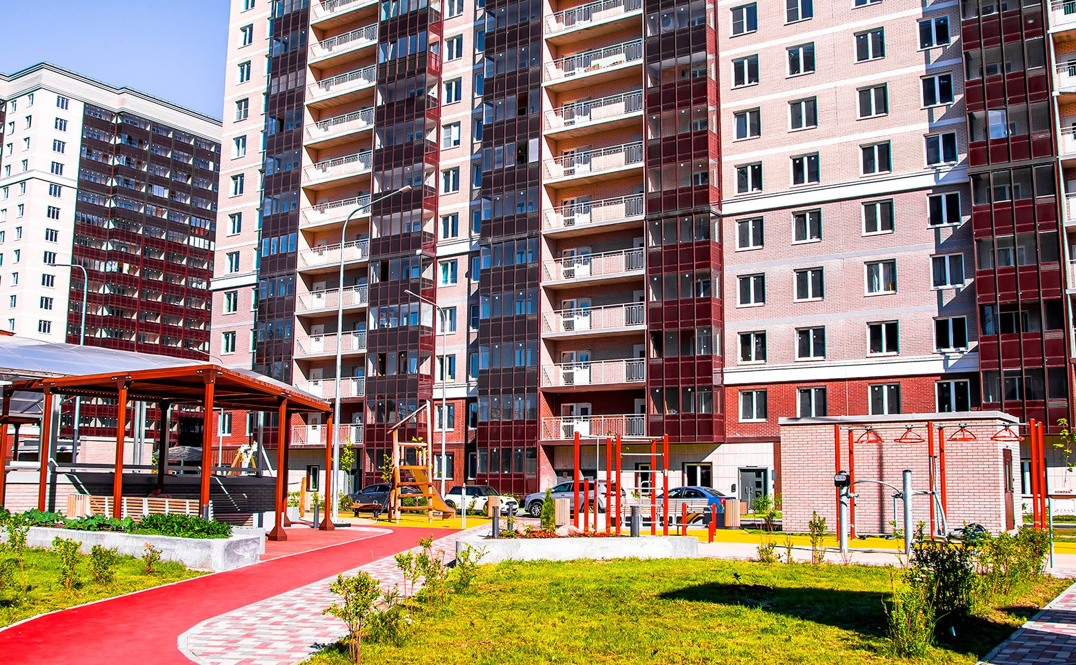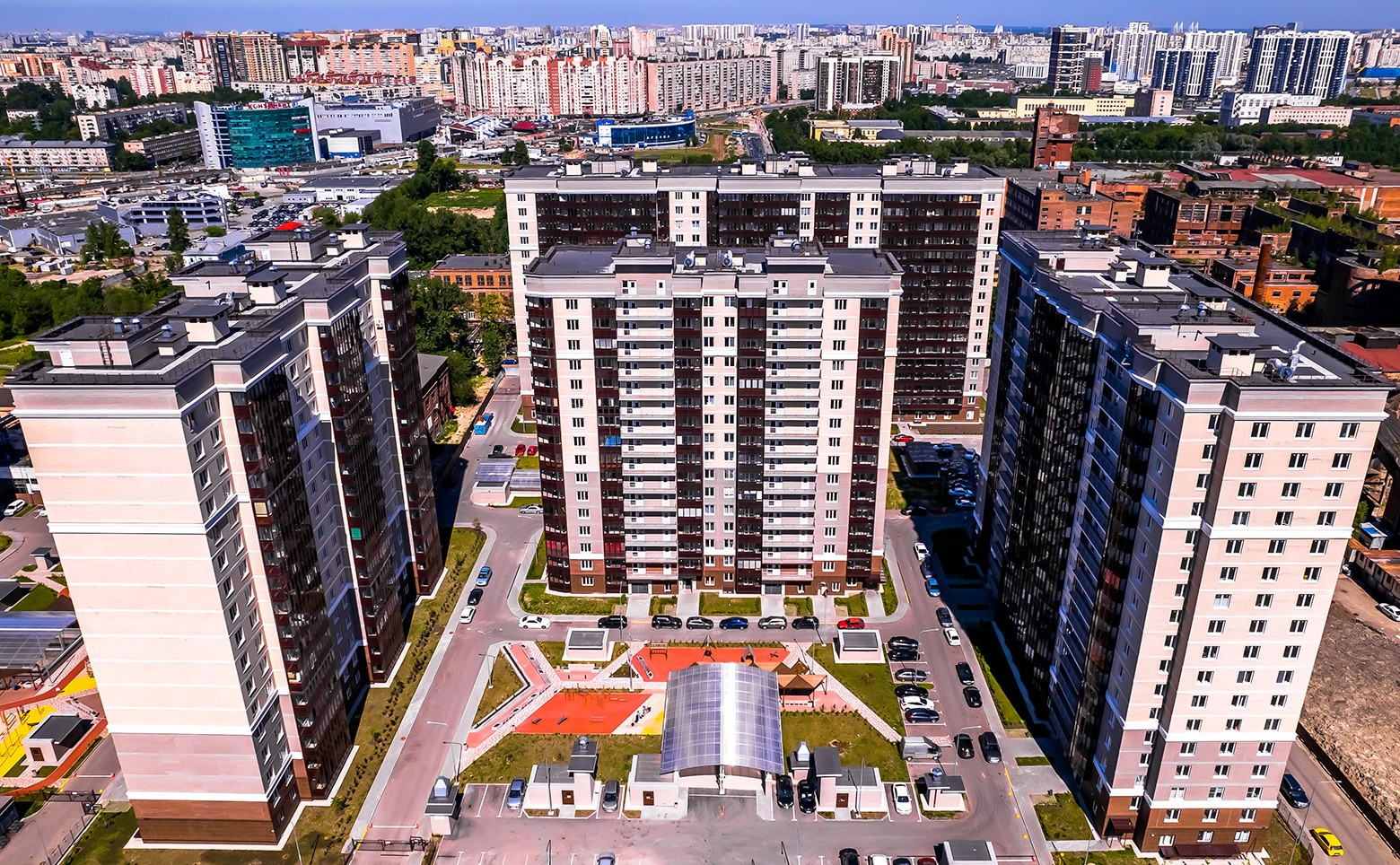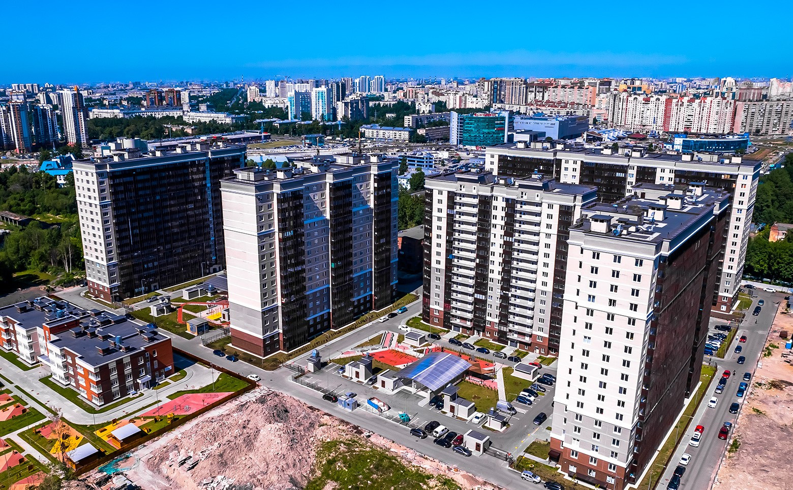 Придомовая территория благоустроена, предусмотрены пешеходные дорожки и тротуары, зеленые зоны с ландшафтным дизайном, места для отдыха, детские и спортивные площадки с безопасным резиновым покрытием. На первых этажах корпусов находятся коммерческие помещения. В состав комплекса входит детский сад на 220 мест. Для автовладельцев предусмотрен подземный паркинг на 720 мест.