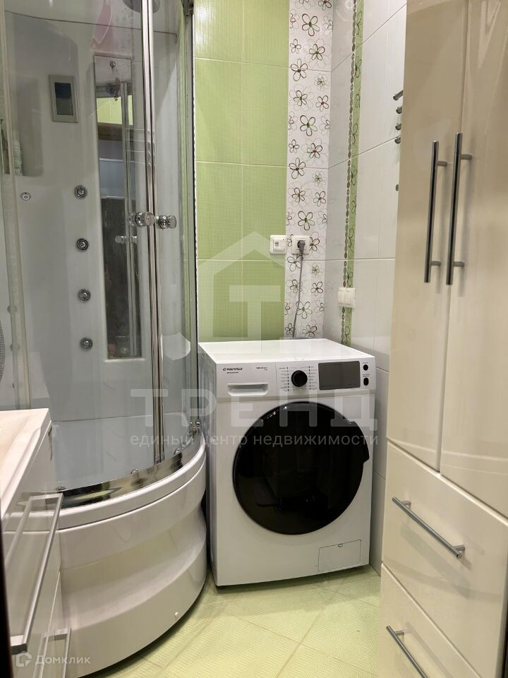 В ванной комнате установлены душевая кабина, раковина и стиральная машина.