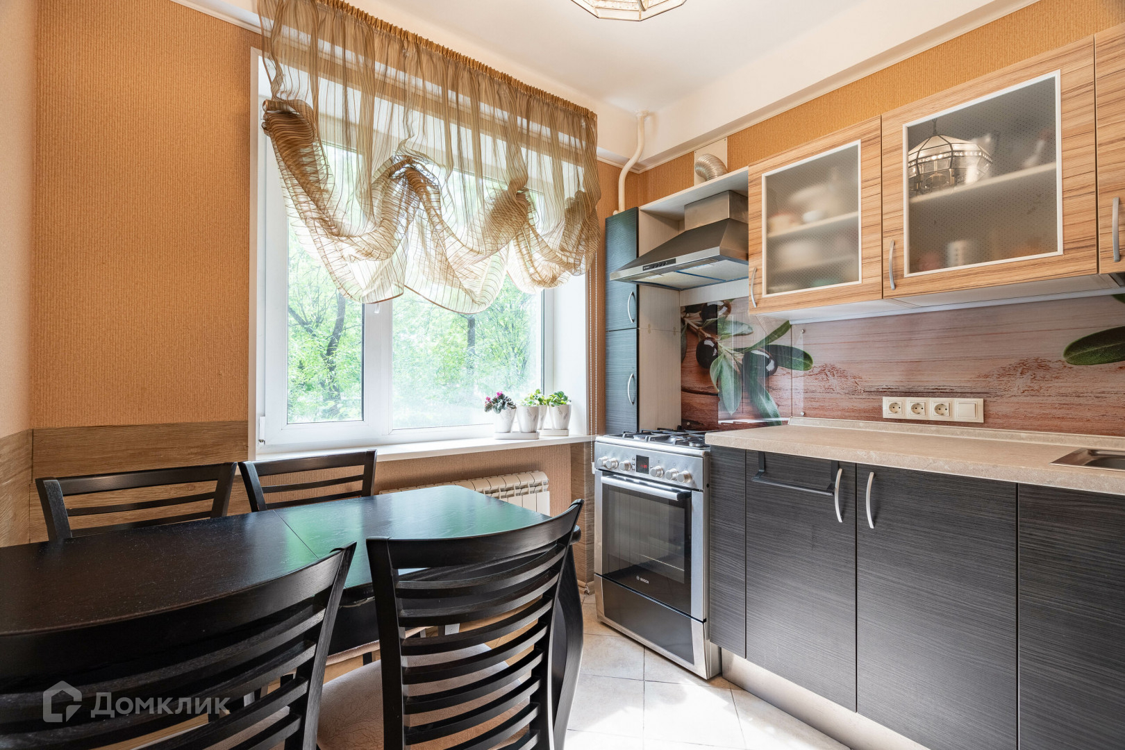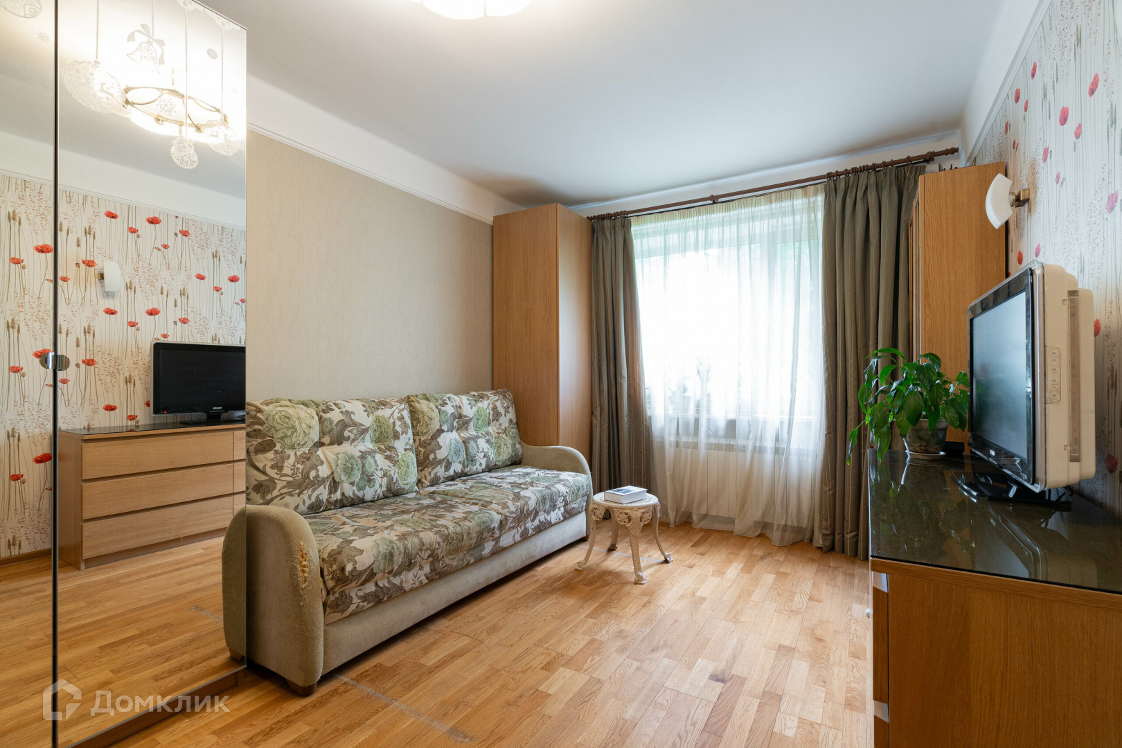 Квартира находится на достаточно высоком первом этаже. Окна квартиры выходят на зеленый палисадник.