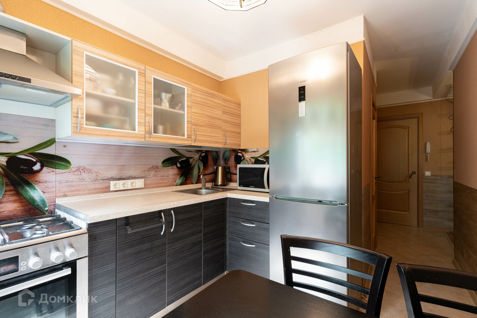 В квартире произведен ремонт: на кухне на полу плитка, в комнате – паркетная доска. Окна – стеклопакеты. На кухне встроенный кухонный гарнитур фабрики "Мария" со всей необходимой техникой, который останется будущему владельцу: вытяжка и газовая плита с электродуховым шкафом Bocsh, стиральная машина Samsung. Остальная мебель- по договоренности. В комнате есть очень удобная ниша, где можно разместить спальное место или гардеробную. Санузел – раздельный. В прихожей – достаточно большая кладовка.