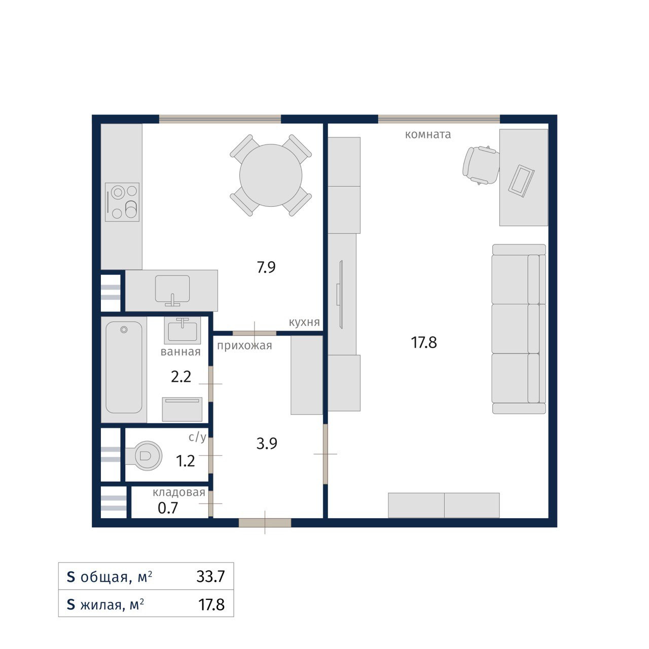 Общая площадь 33.7 м2