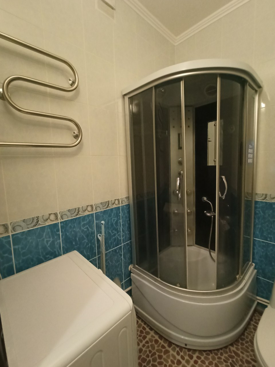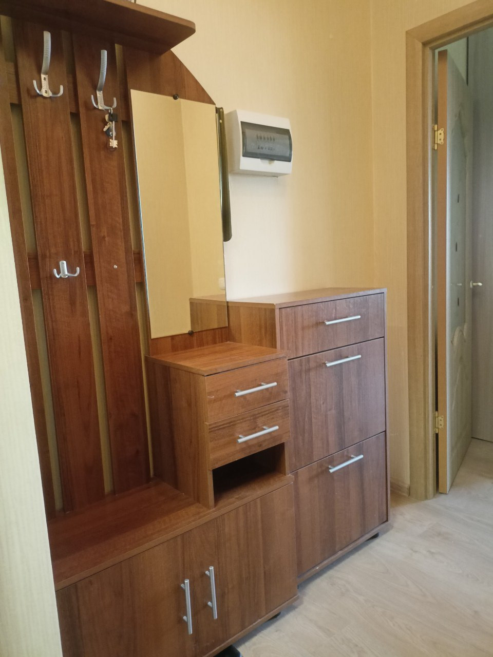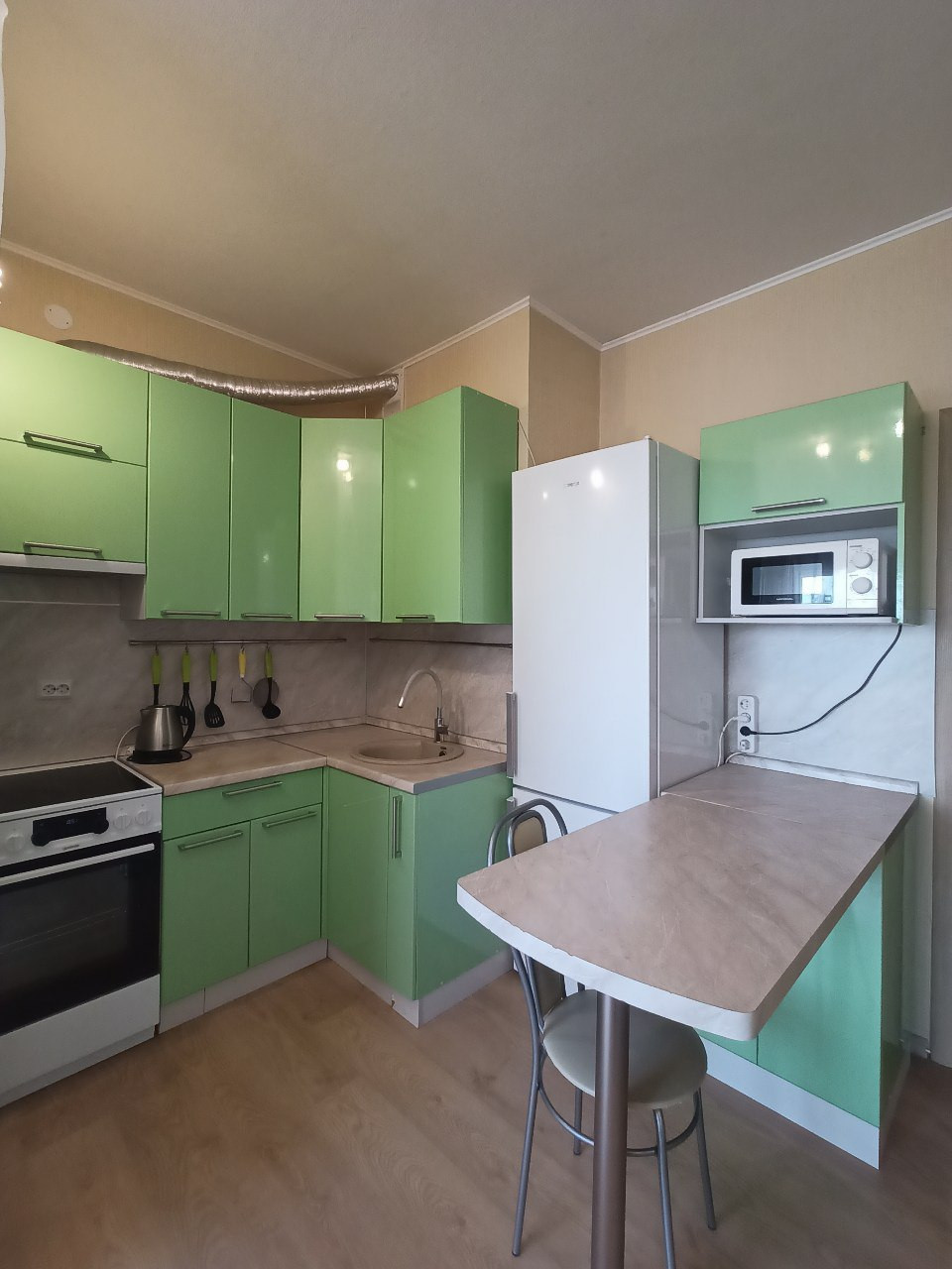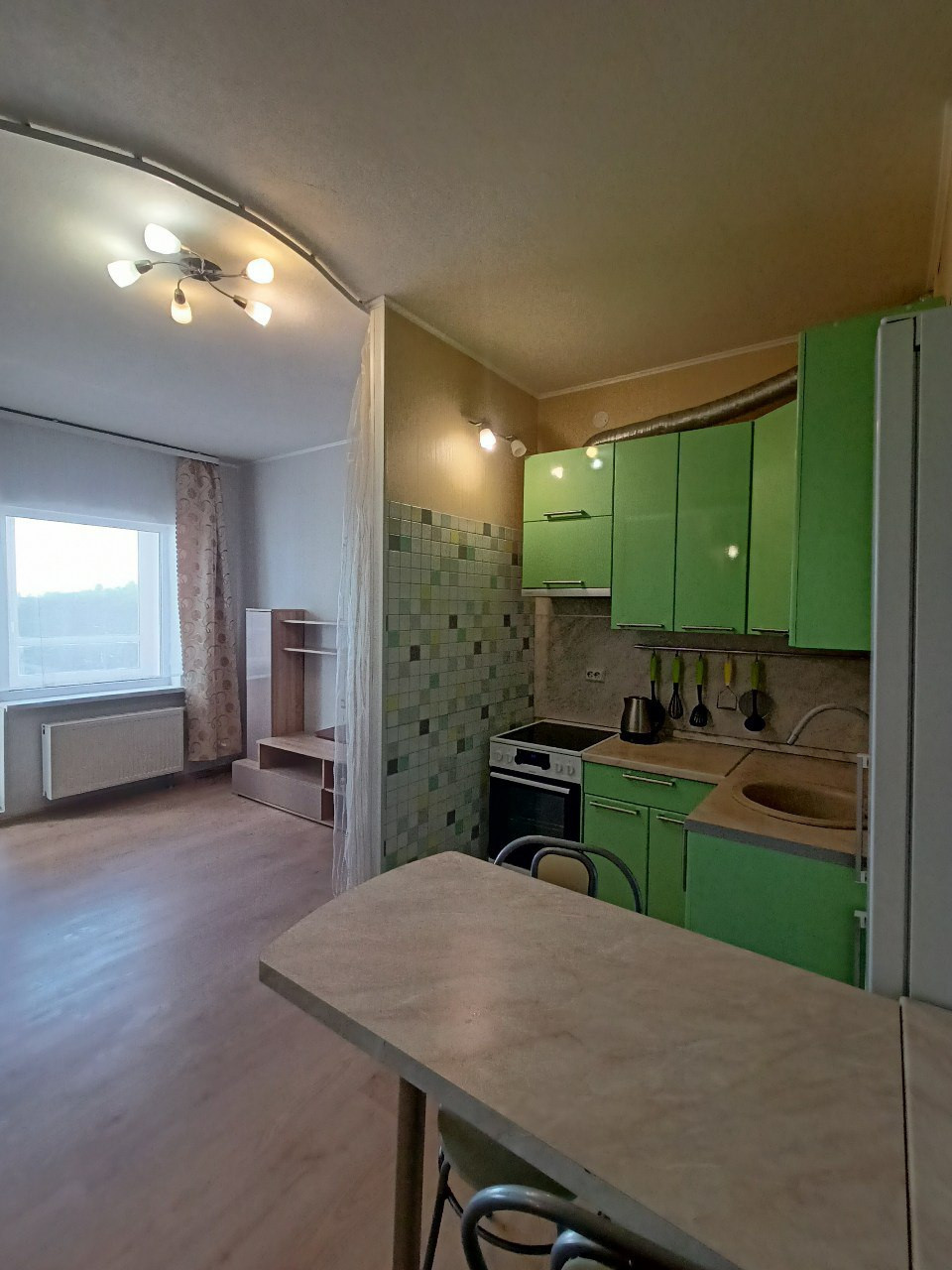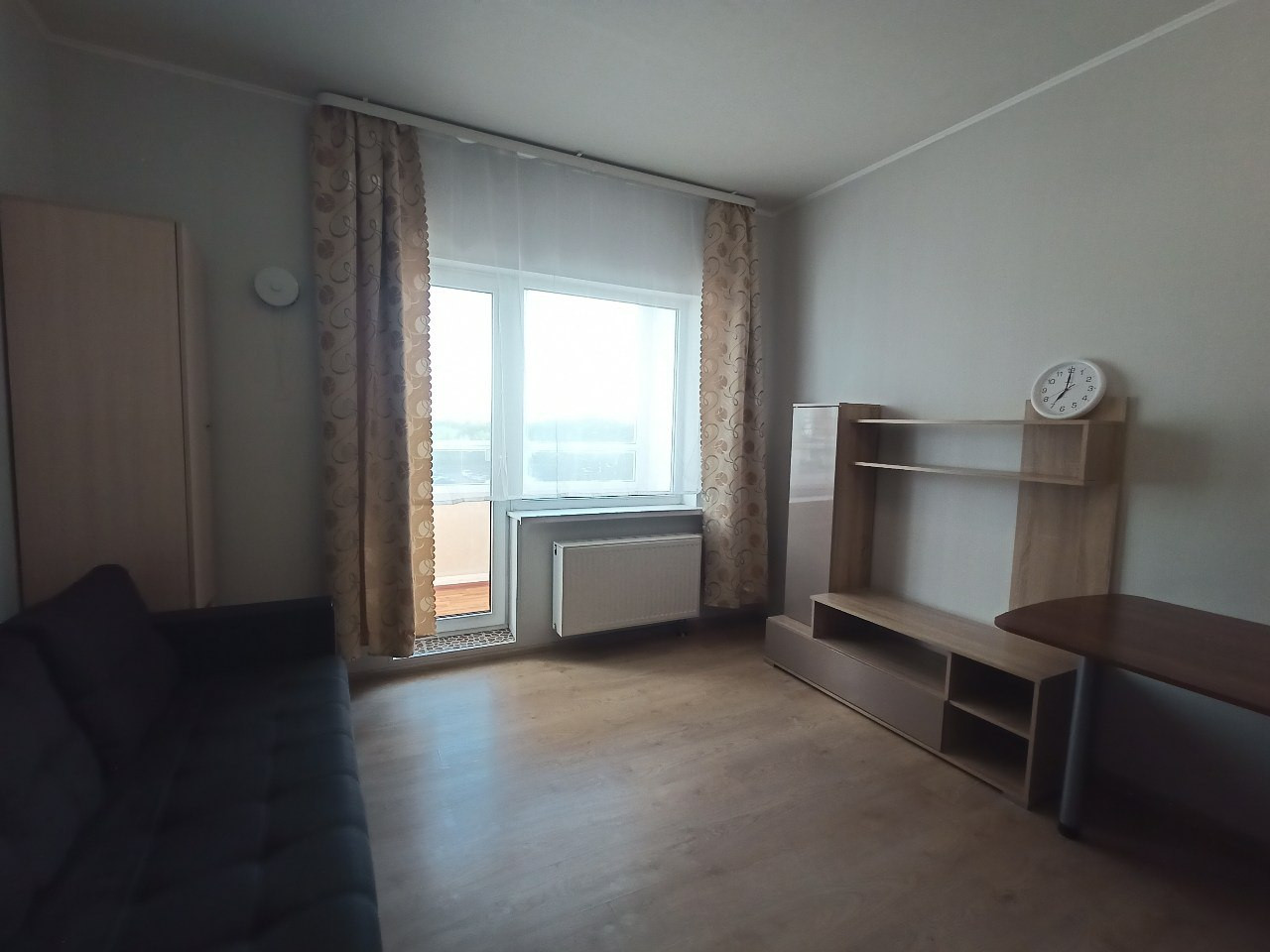 В квартире остаётся мебель на фото. Большой кухонный гарнитур с электроплитой и холодильником NoFrost для любителей готовить. Шкаф-купе, диван еврокнижка, небольшой стеллаж, шкаф и стол. В ванной остаётся стиральная машина. Приятный бонус - водонагреватель на случай нечастых отключений горячей воды.