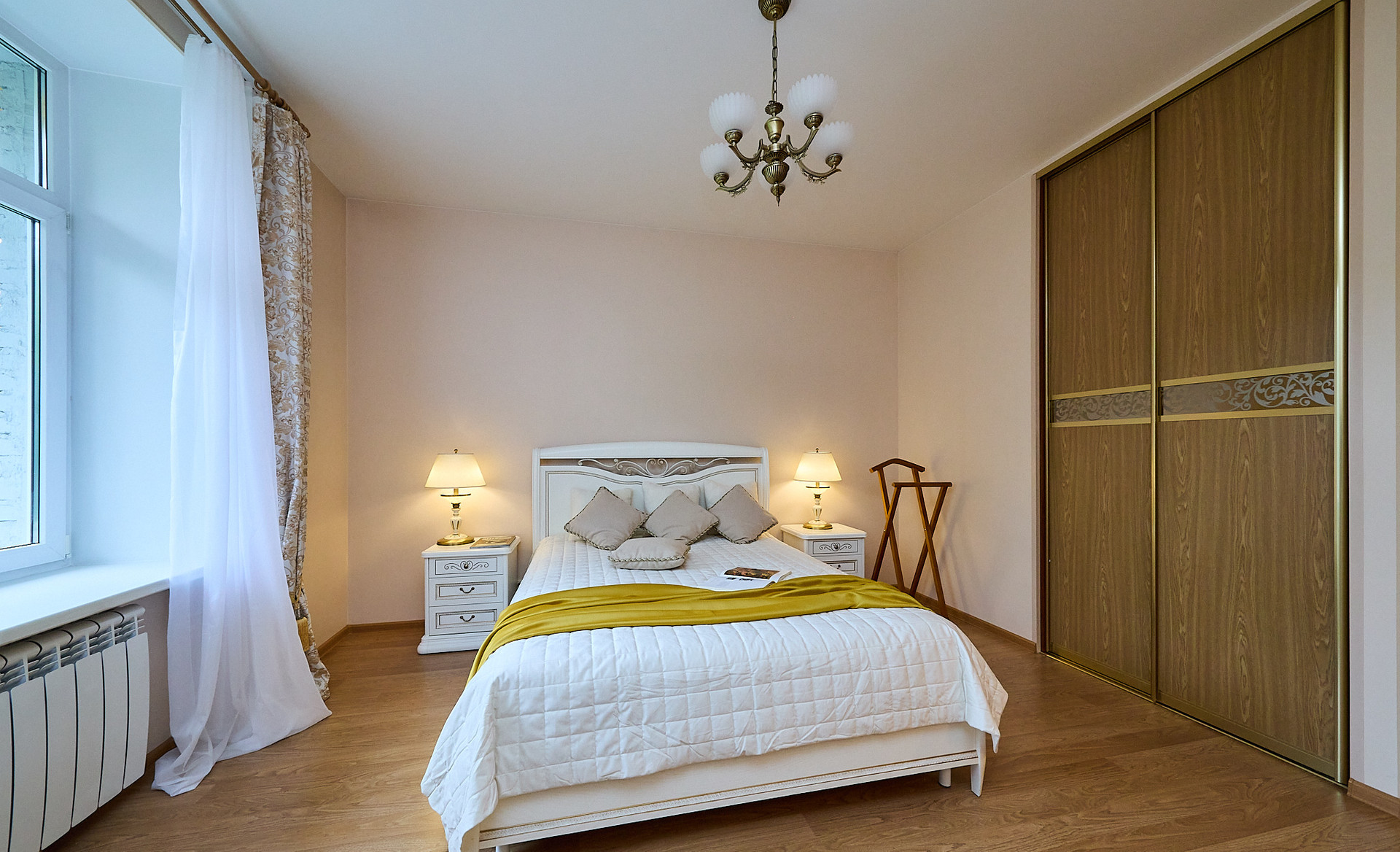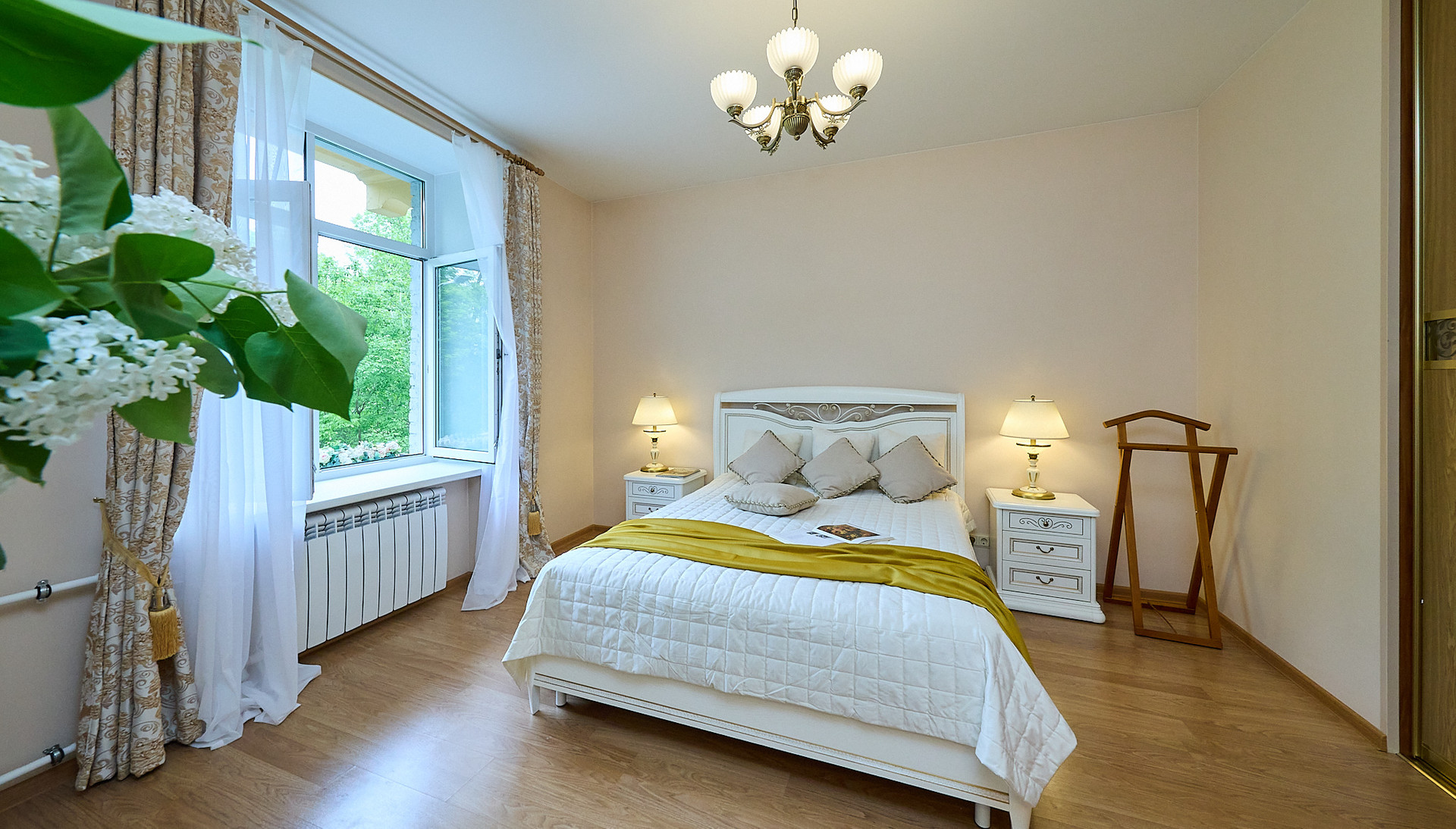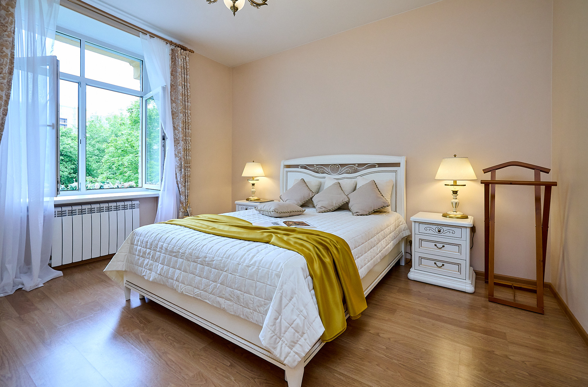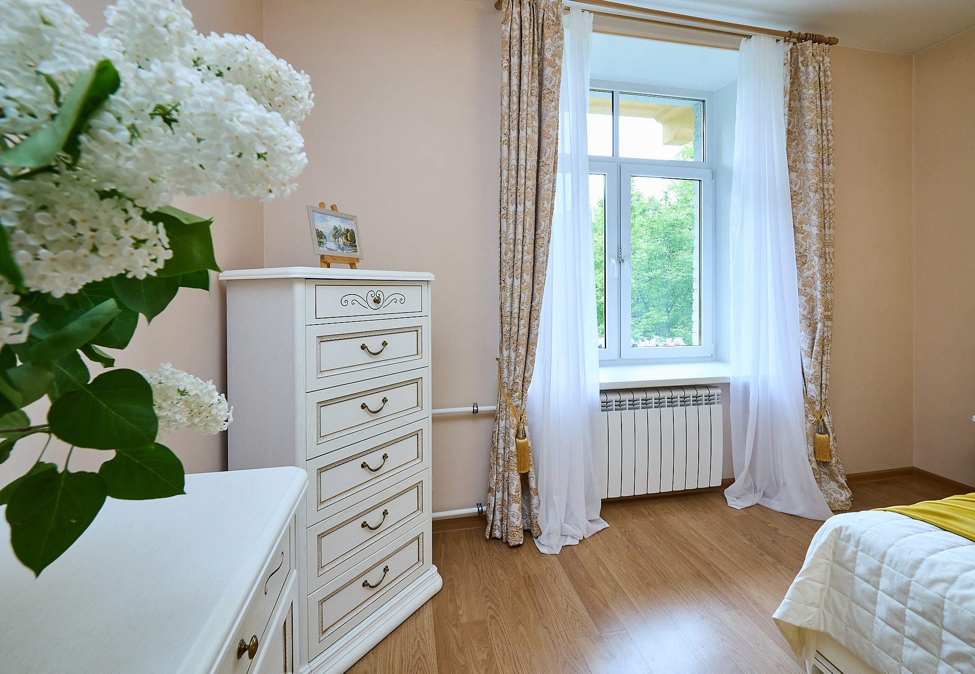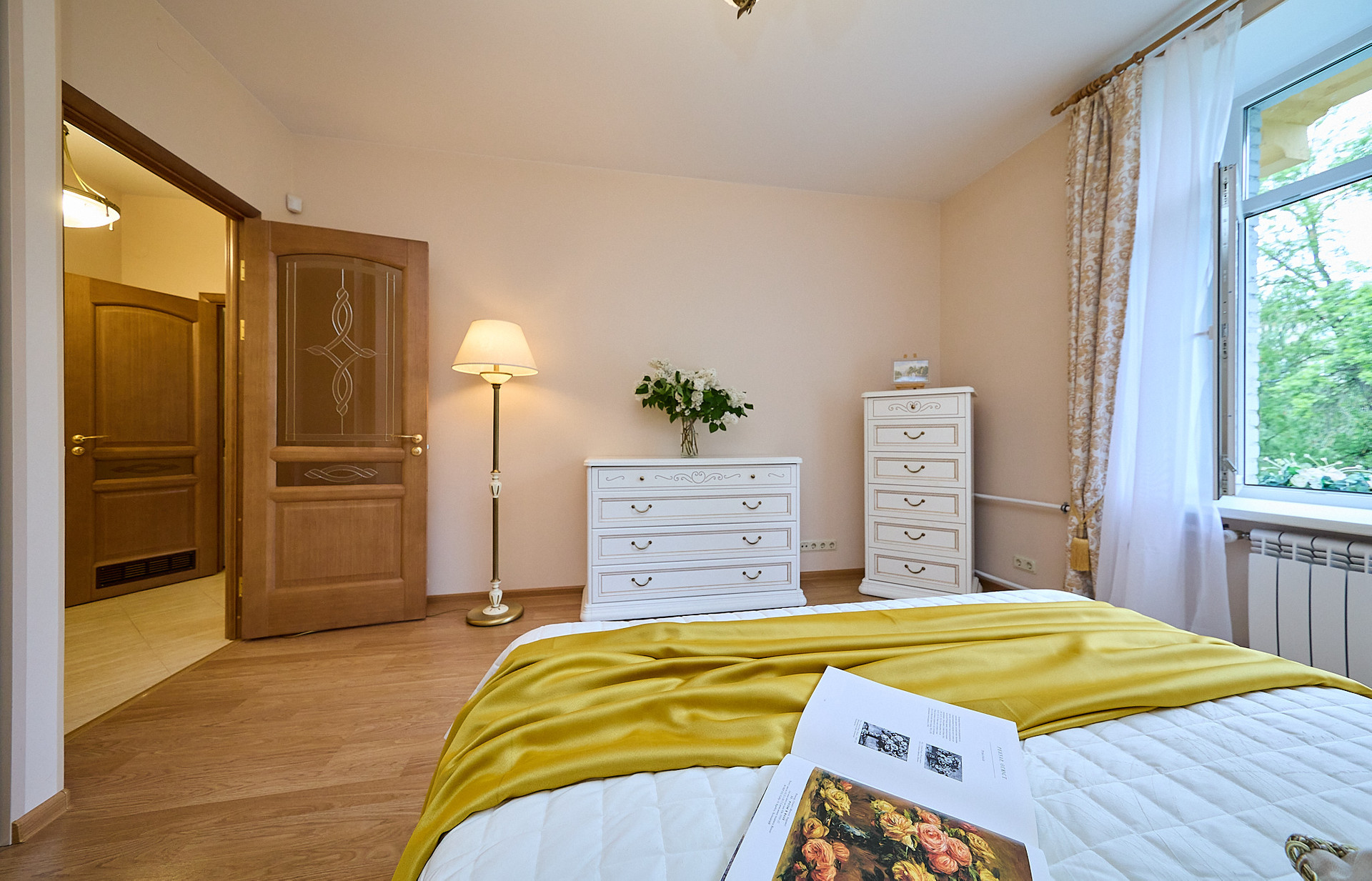 *в комнате мебель из натурального дерева