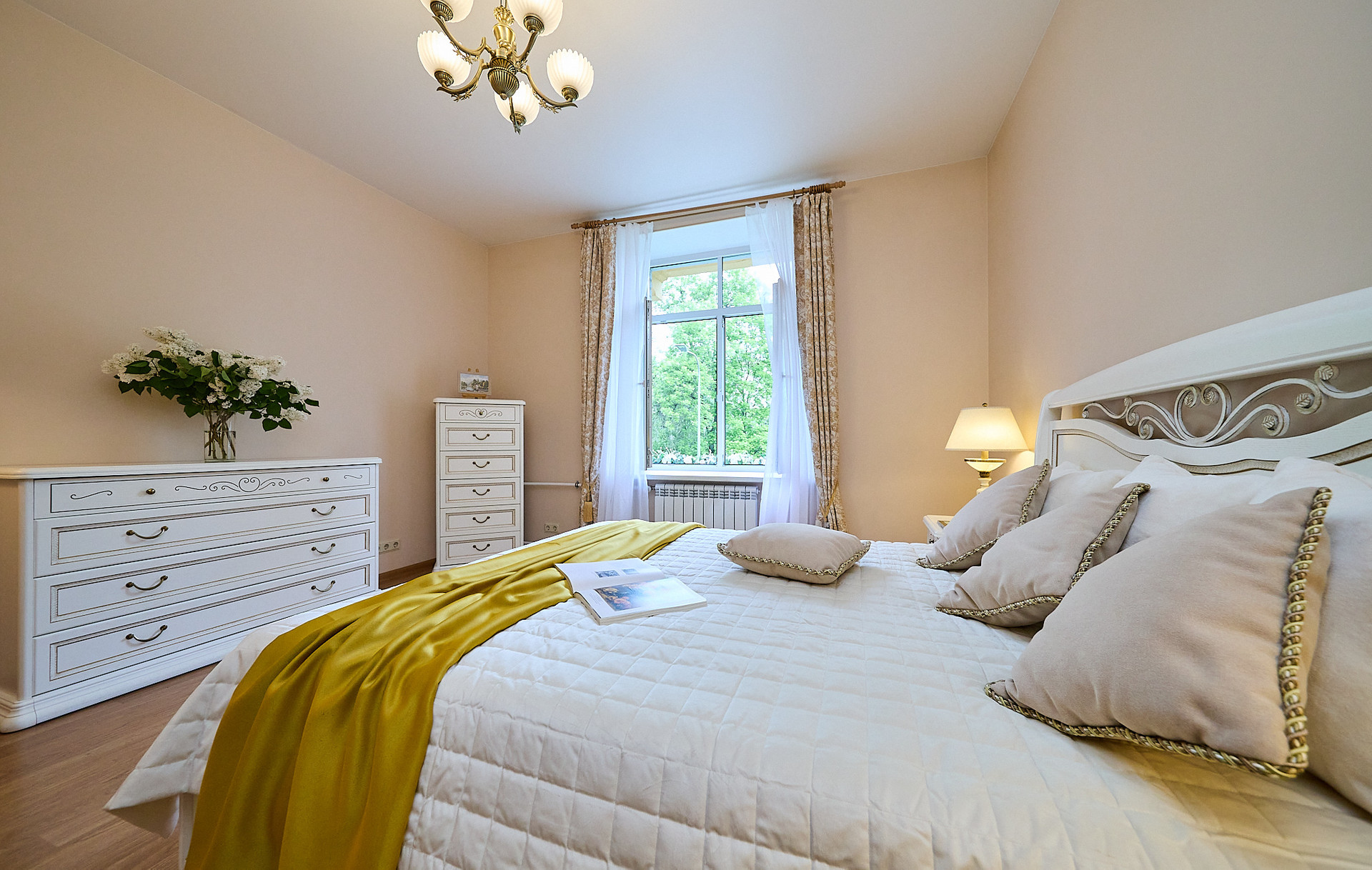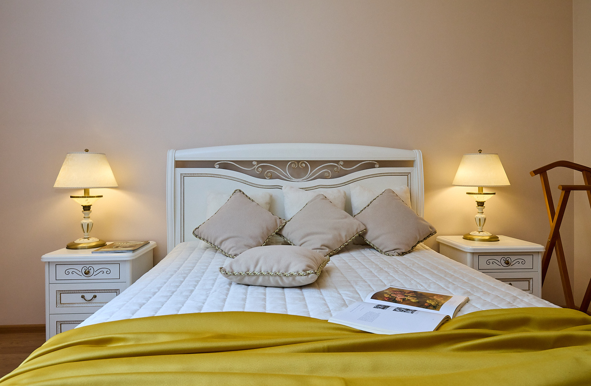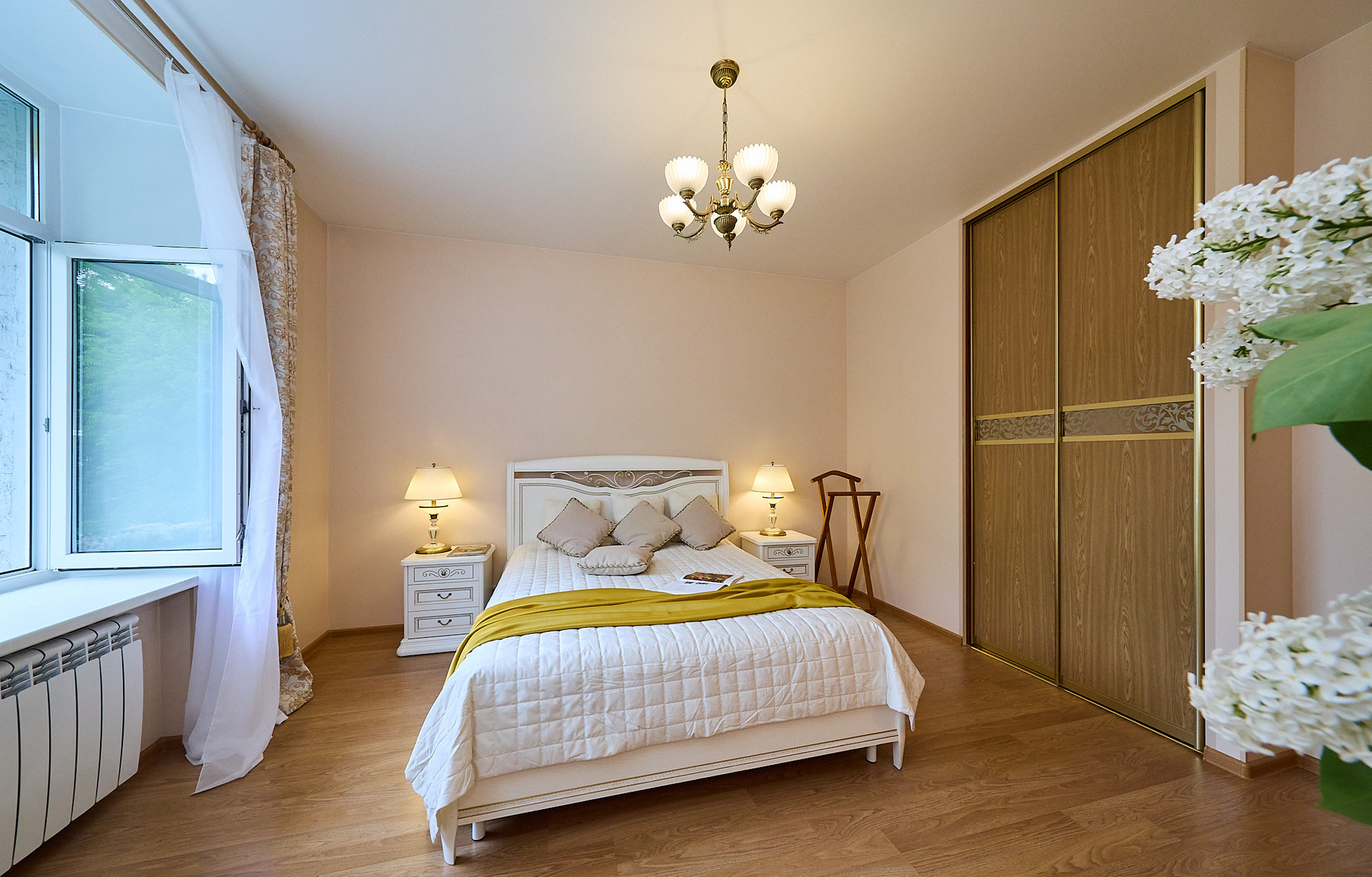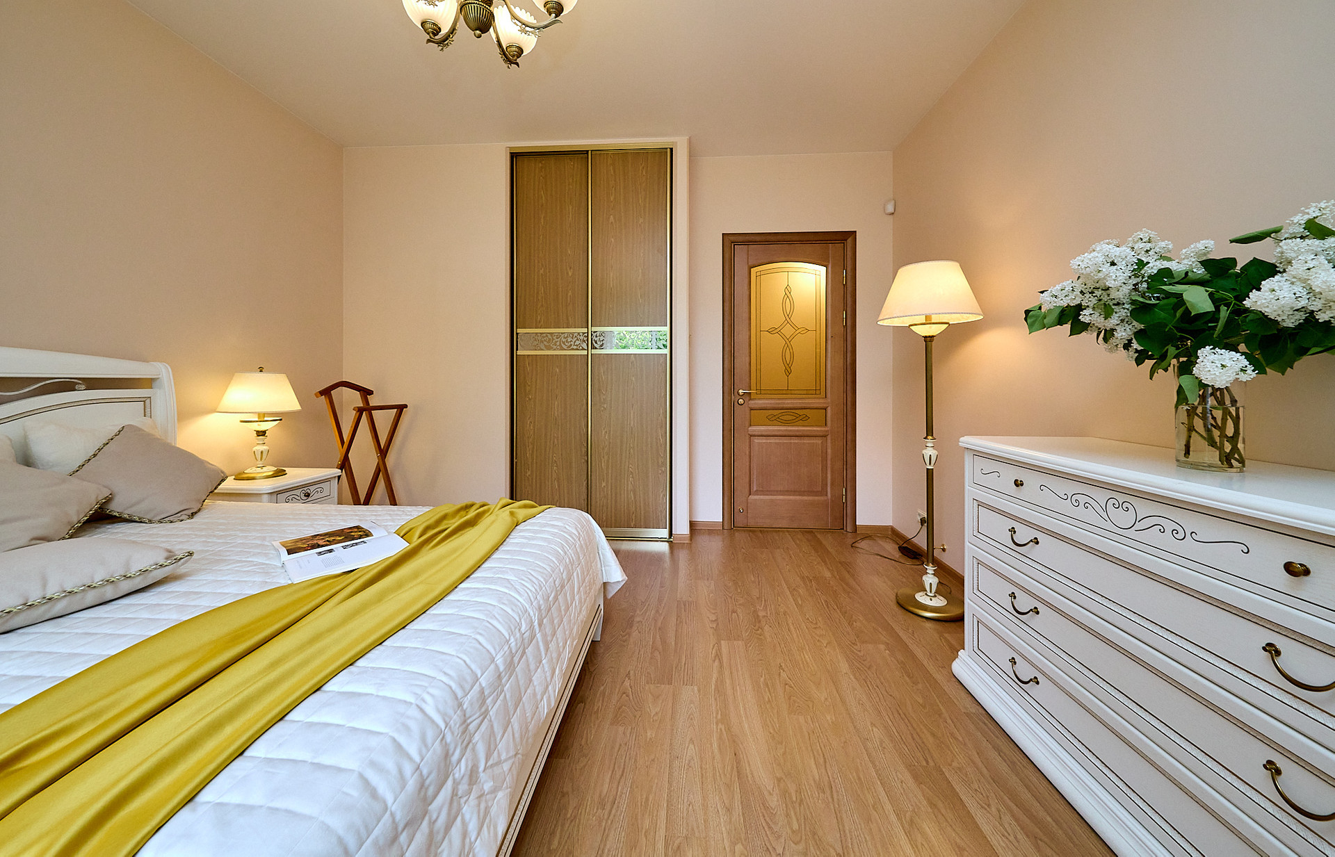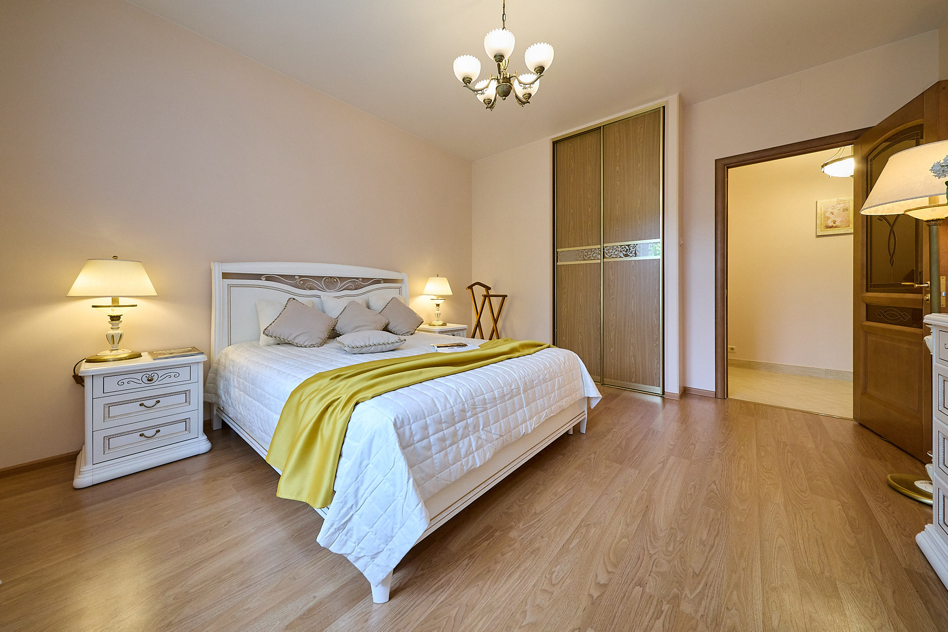 *в комнате мебель из натурального дерева