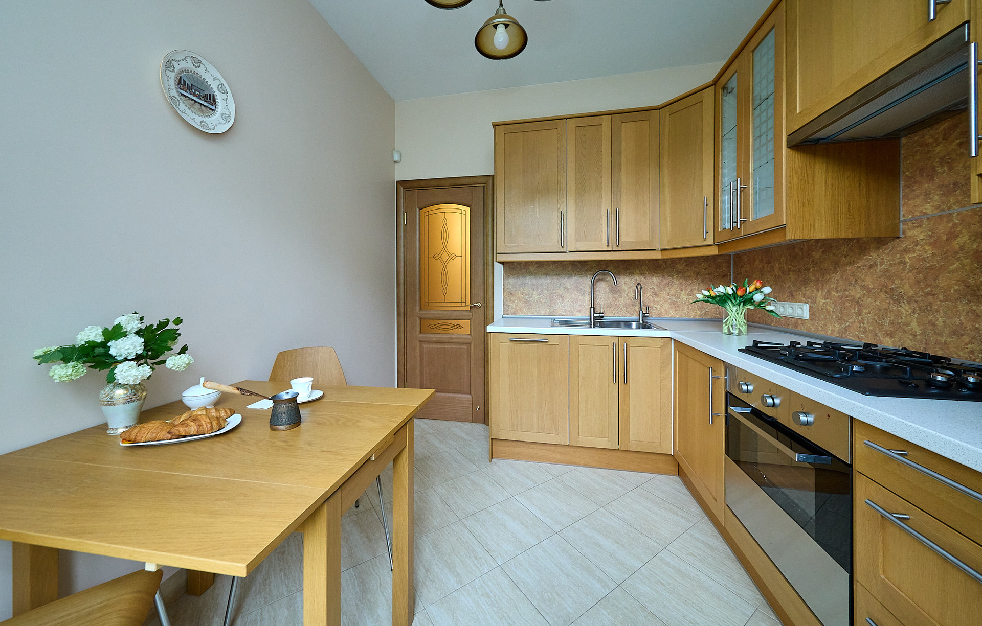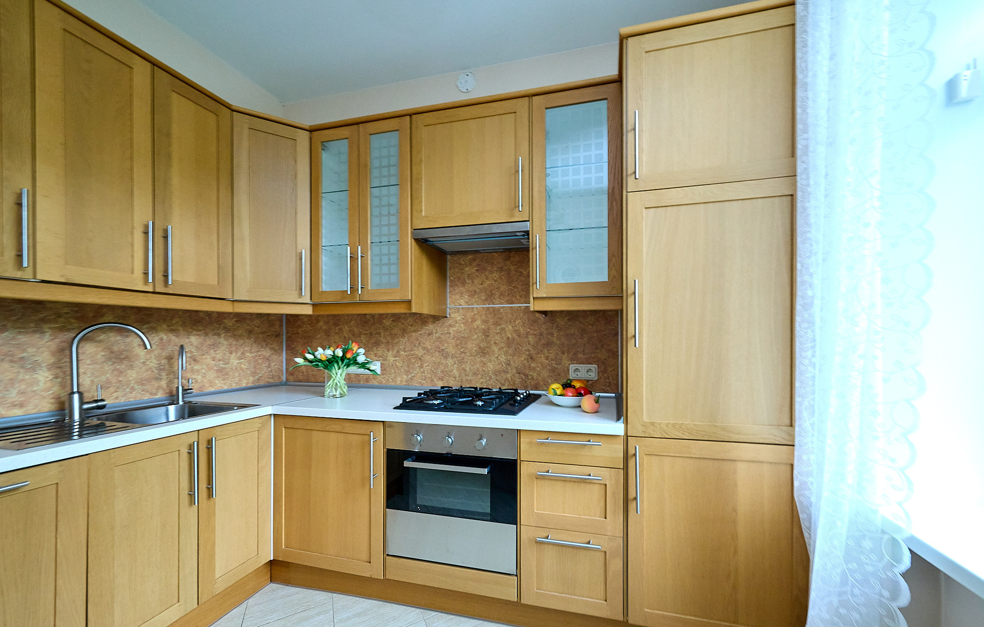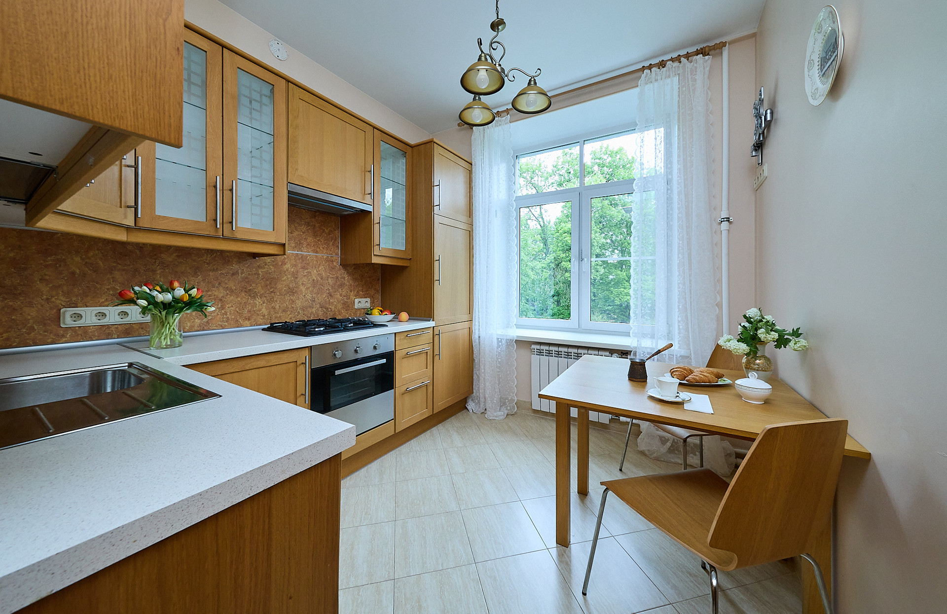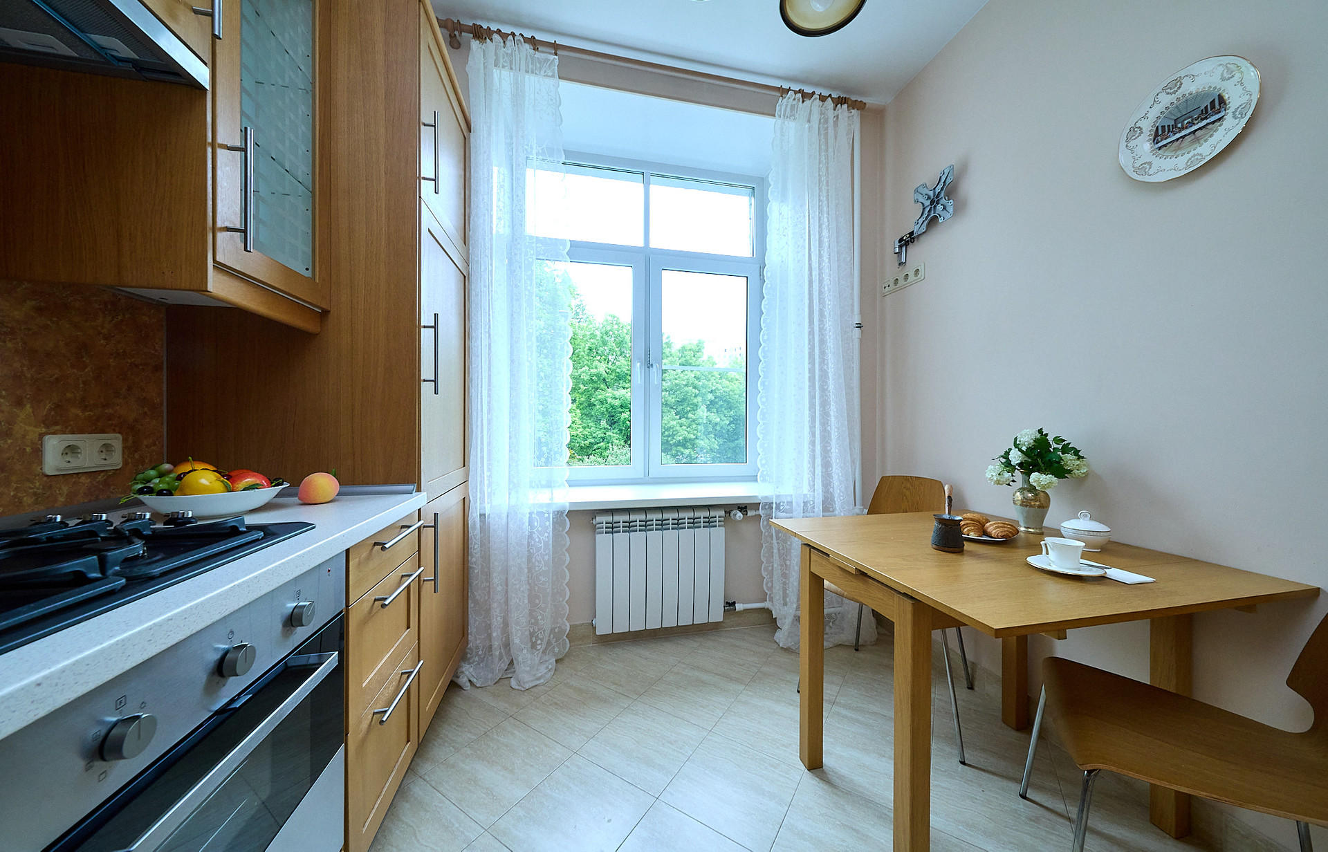 *установлена кухня, с фасадами натурального дерева, и встроенной бытовой техникой.