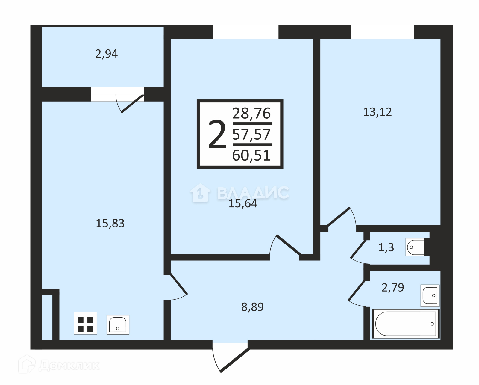 Общая площадь 60.5 м2