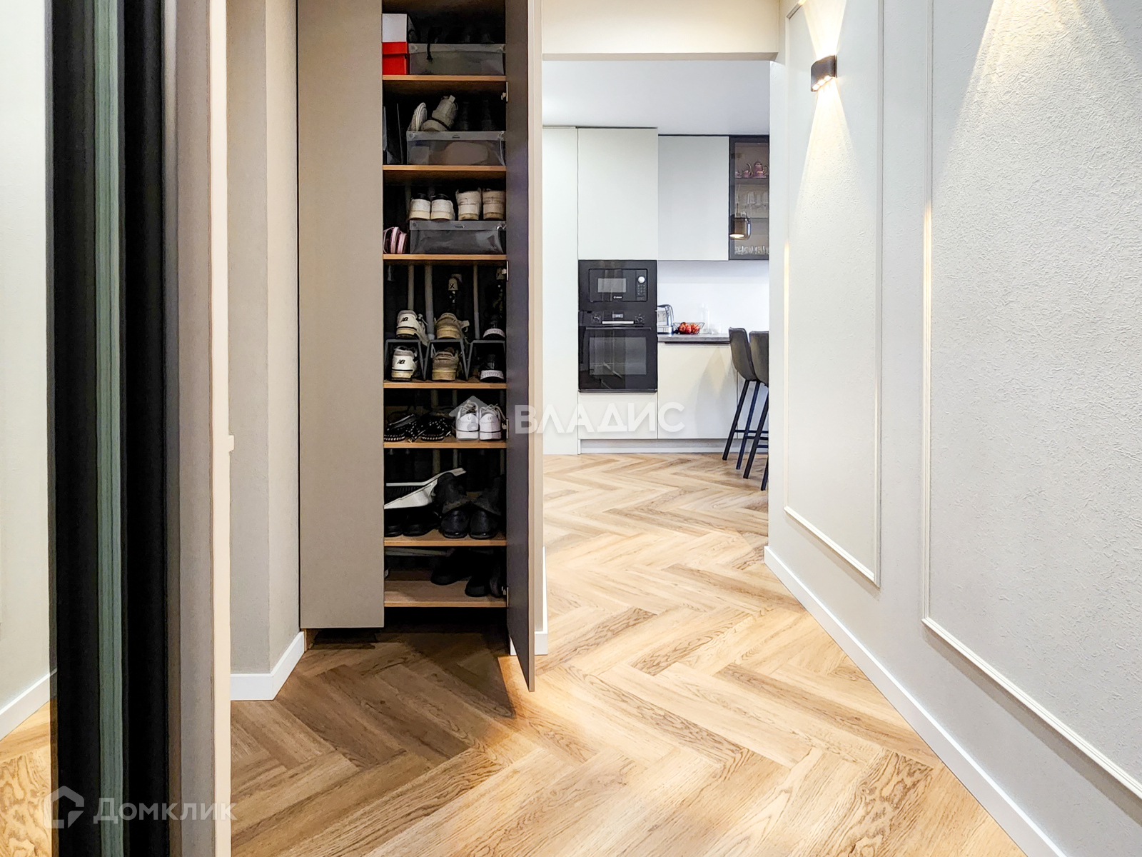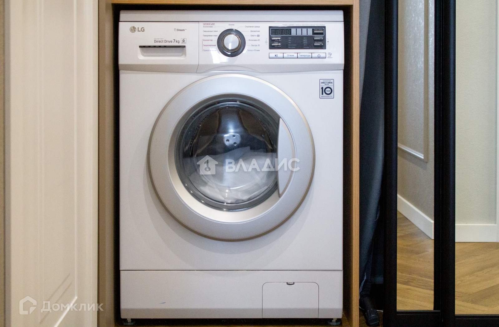 Стиральная машина располагается в гардеробном шкафу, тем самым очень экономит место и пространство Вашей ванной комнаты. В гардеробе продумано место под обувницу!