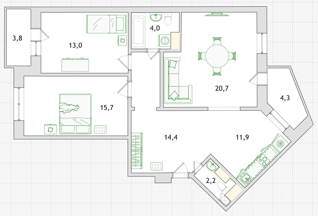 - Комната № 1 – 20,7 кв.м с выходом на лоджию;