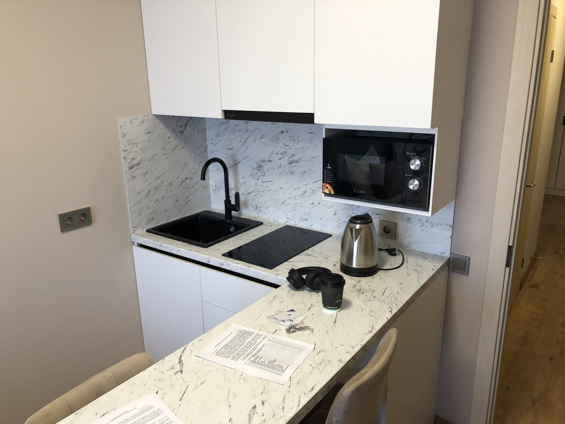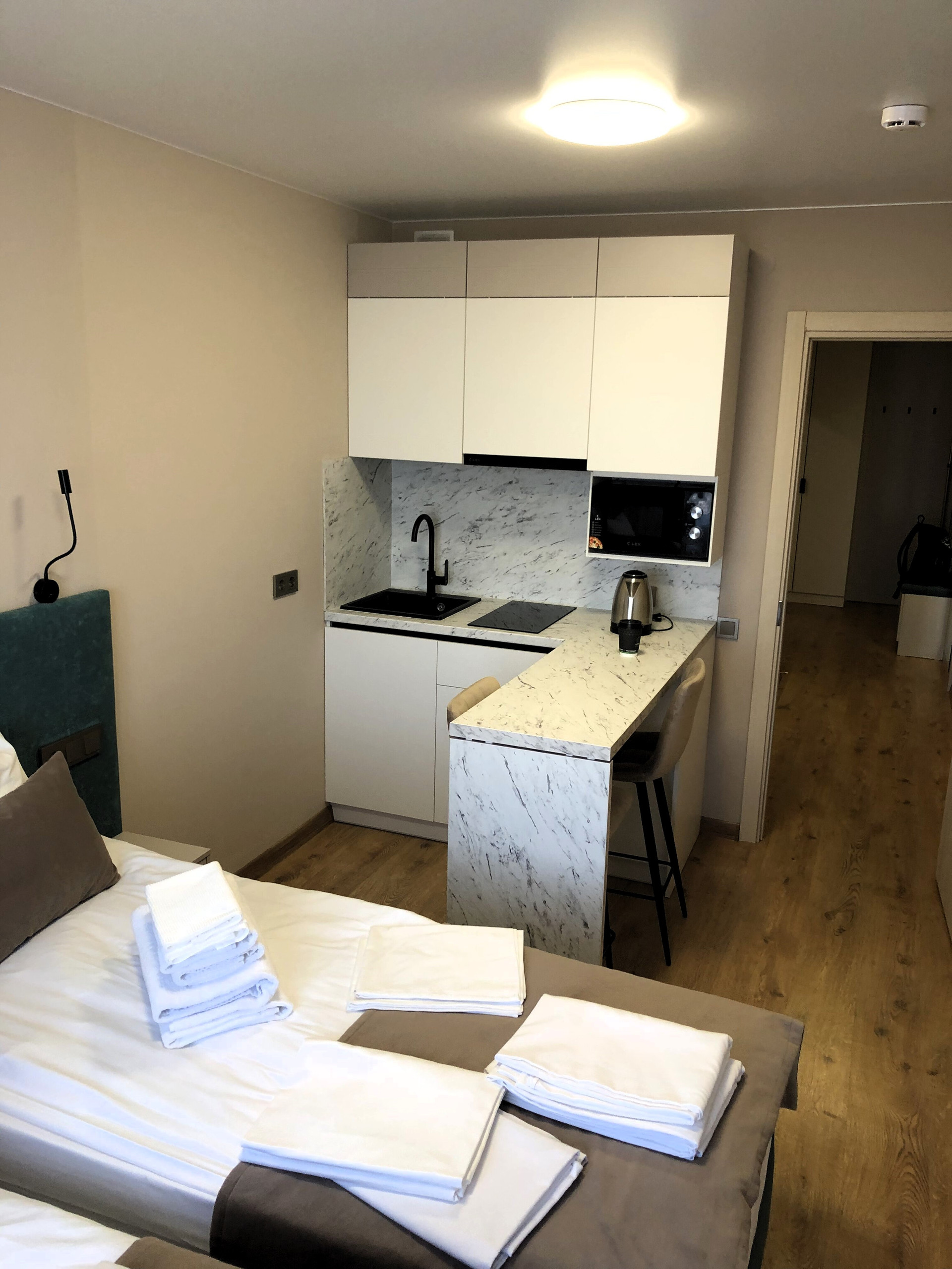 Общая S-23,5 кв.м., выделенная кухонная зона- 5 кв.м., с/уз совмещенный. Произведен качественный ремонт из  высокопрочных и износостойких материалов.  Апартаменты полностью меблированы и укомплектованы техникой, текстилем и посудой в соответствии с требованиями комплекса. Окна выходят во двор.  Студия- угловая, что удобно, т.к. нет соседей.