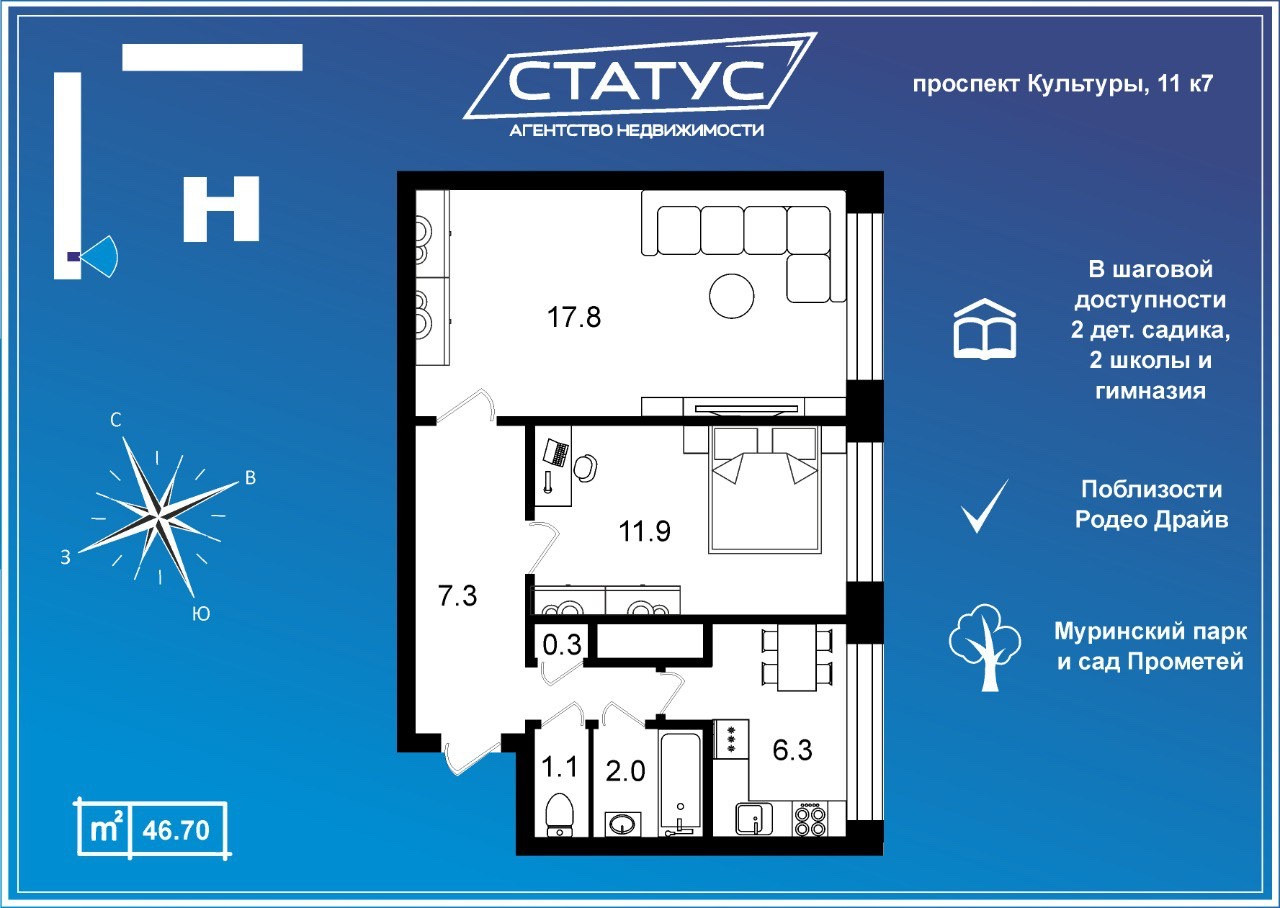 2-комнатная квартира, 46.7 м2, этаж 2 / 9, на продажу в Санкт-Петербурге, проспект Культуры, 11к7