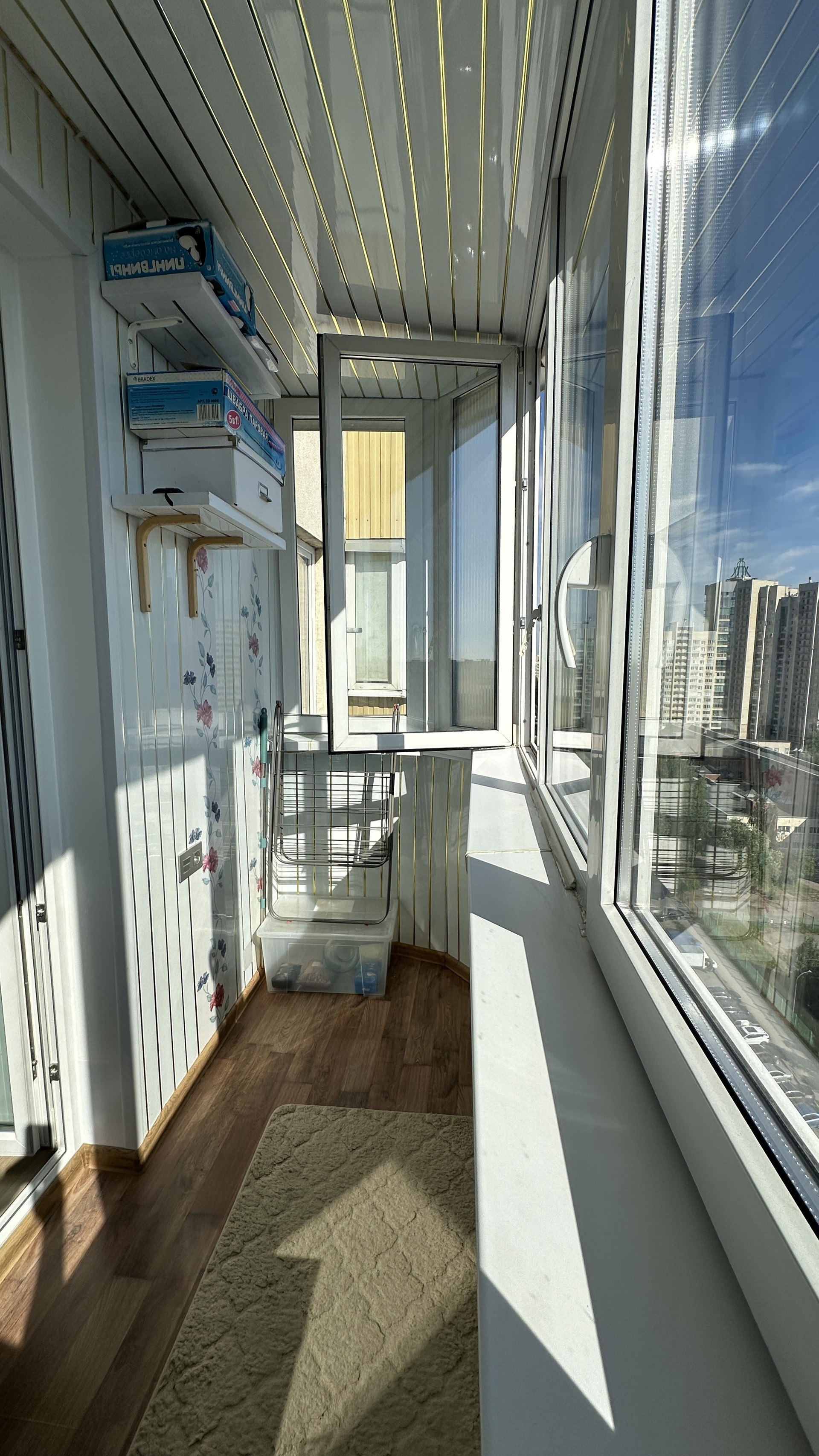 Балкон 4,7м: вместительный, есть навесные полки и удобно встает сушилка для белья.