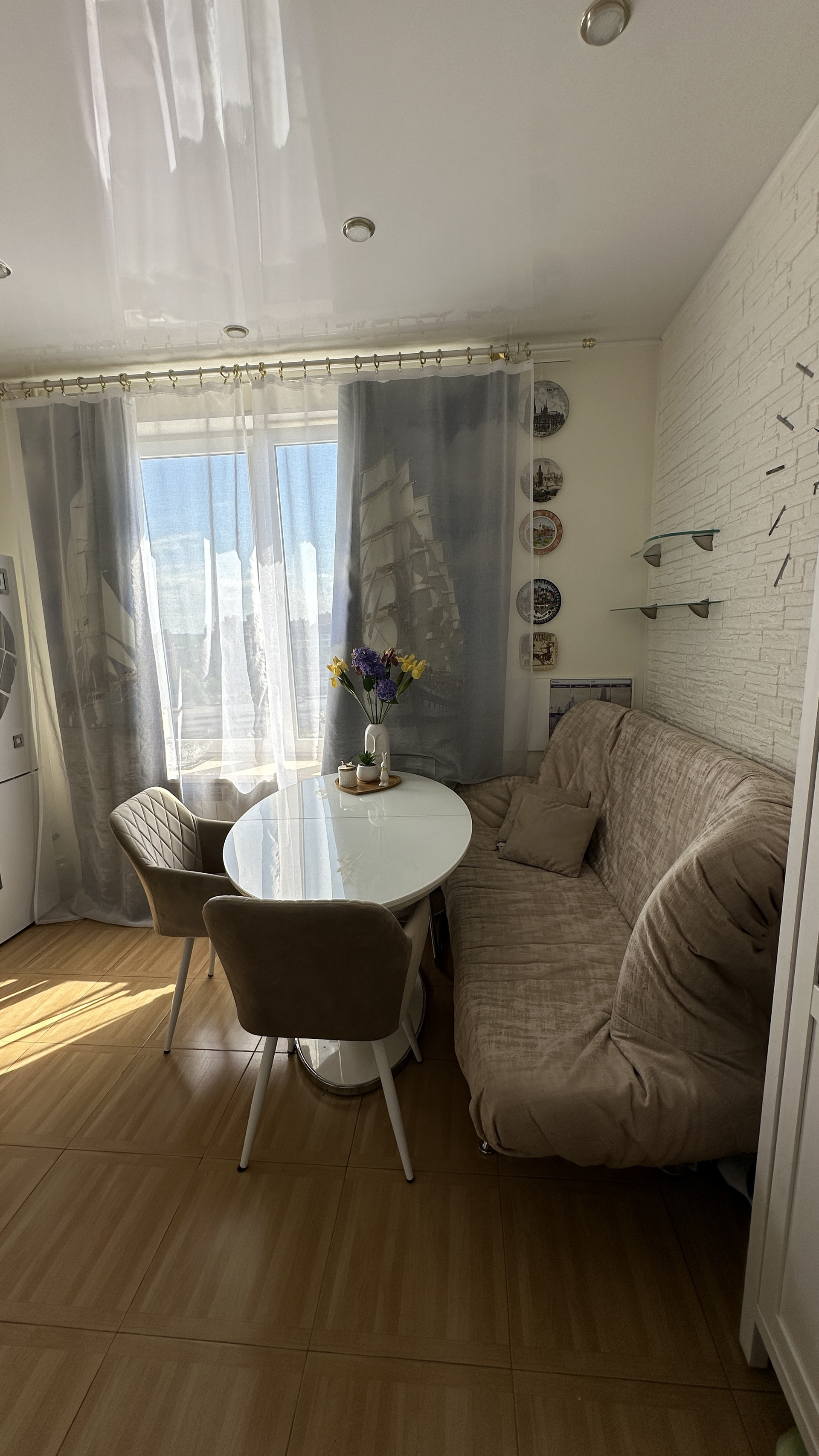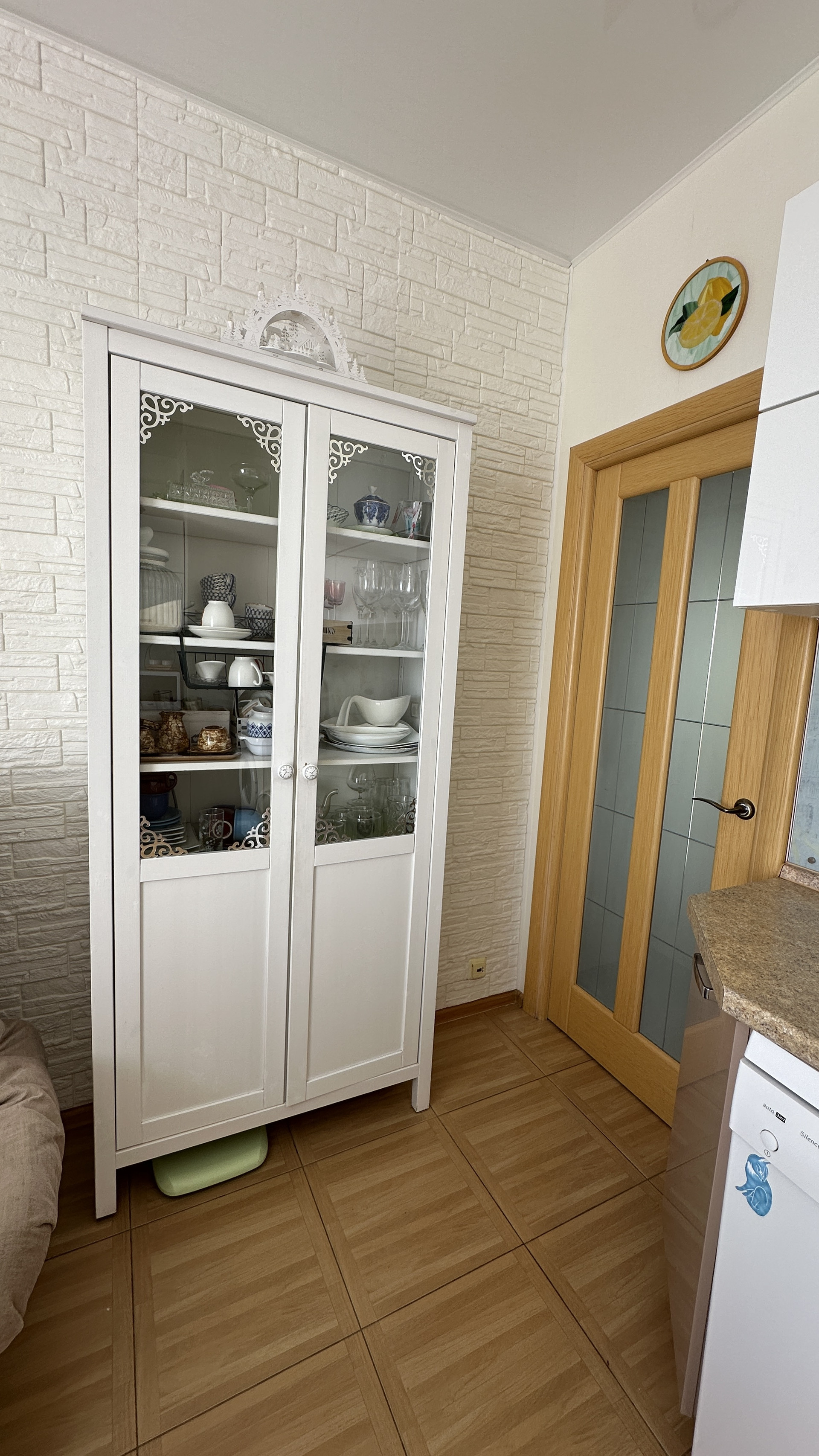 Кухня 13м: посудомоечная машина, духовой шкаф, стиральная машина, вытяжка, варочная панель, стол, диван, шкаф буфет.