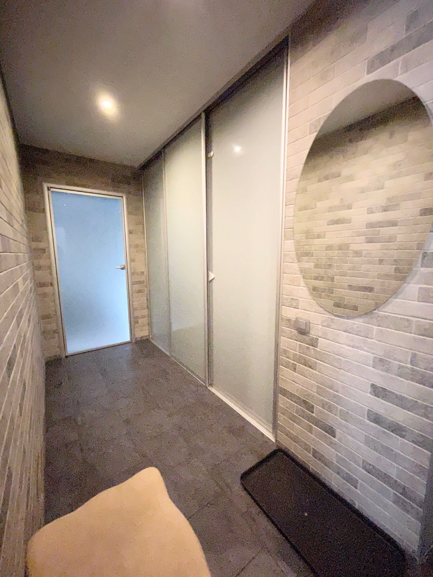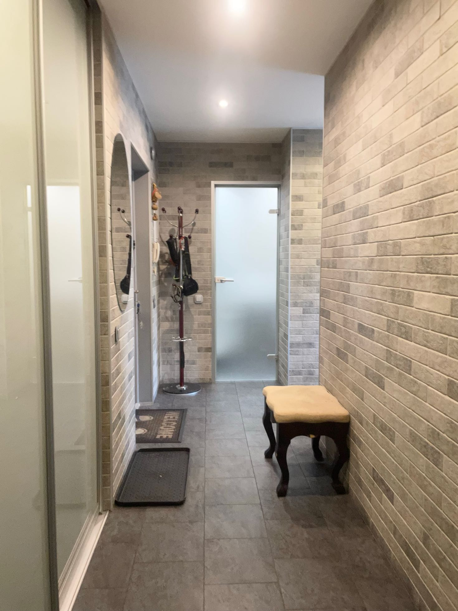 На полу и стенах в коридоре покрытие из керамогранита, углы защищены металическим профилем, установлена удобная вместительная гардеробная система, закрыта встроенными дверями-купе.