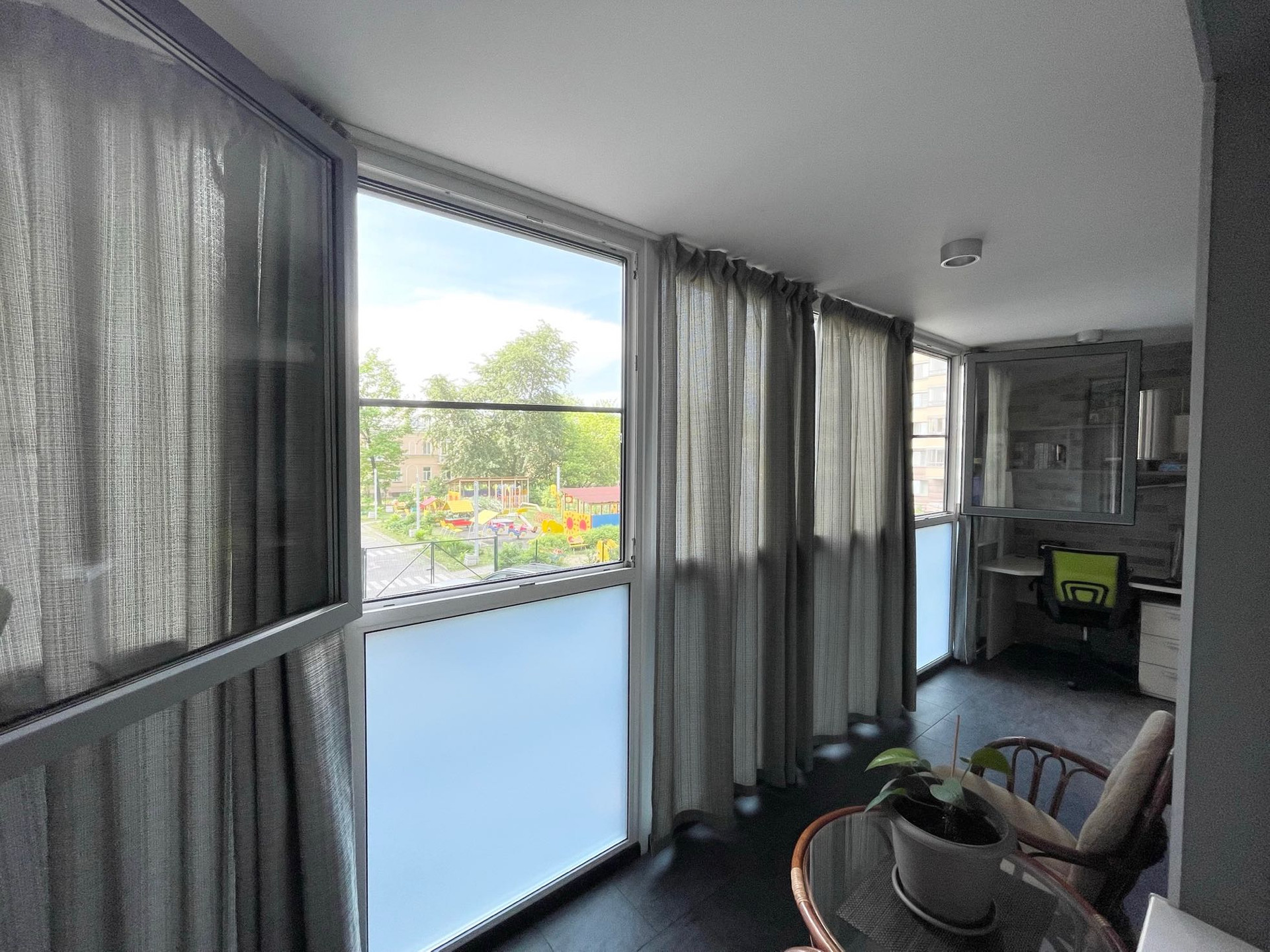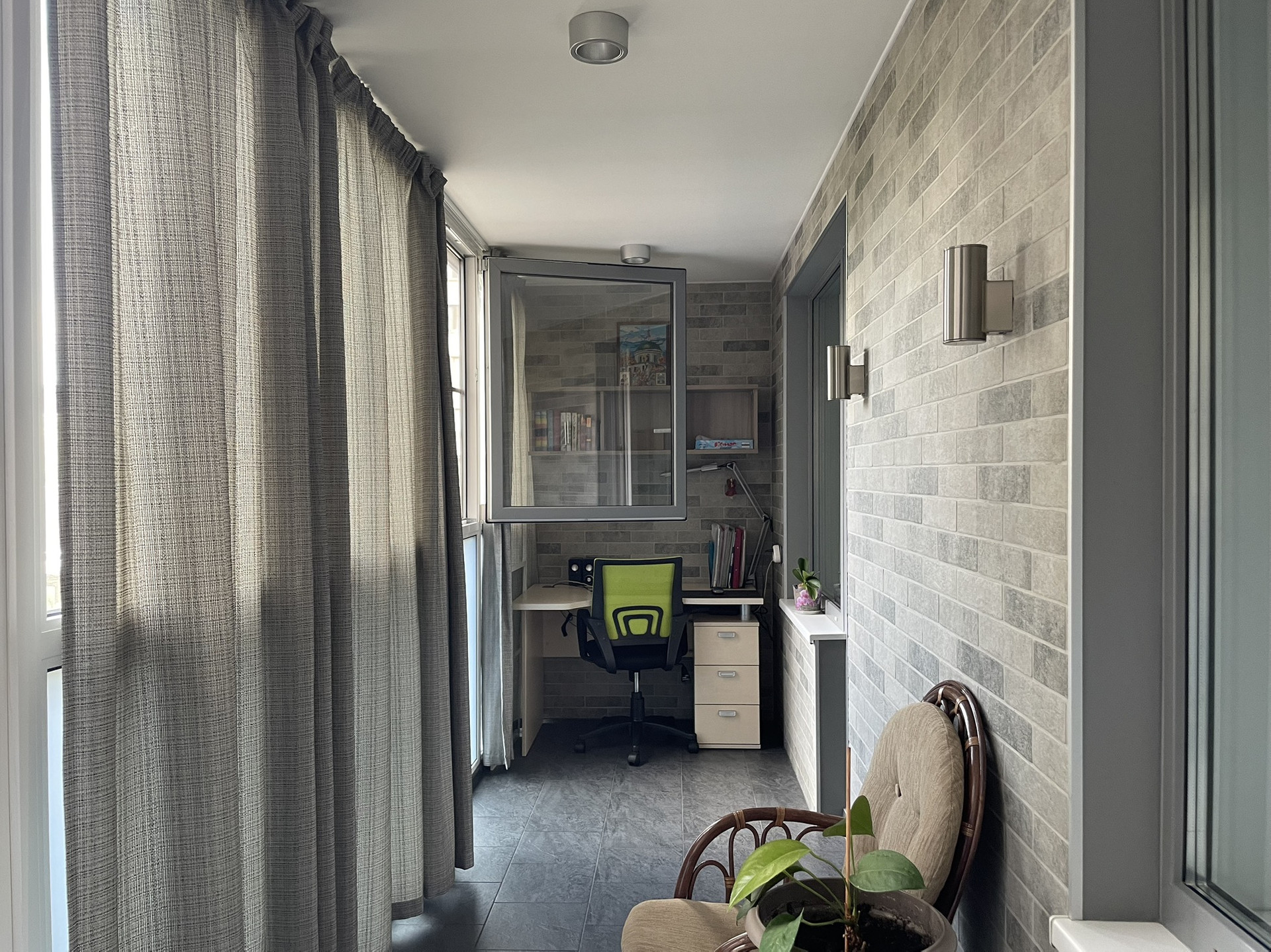 На лоджии оборудована рабочая зона, места для хранения и зона отдыха.