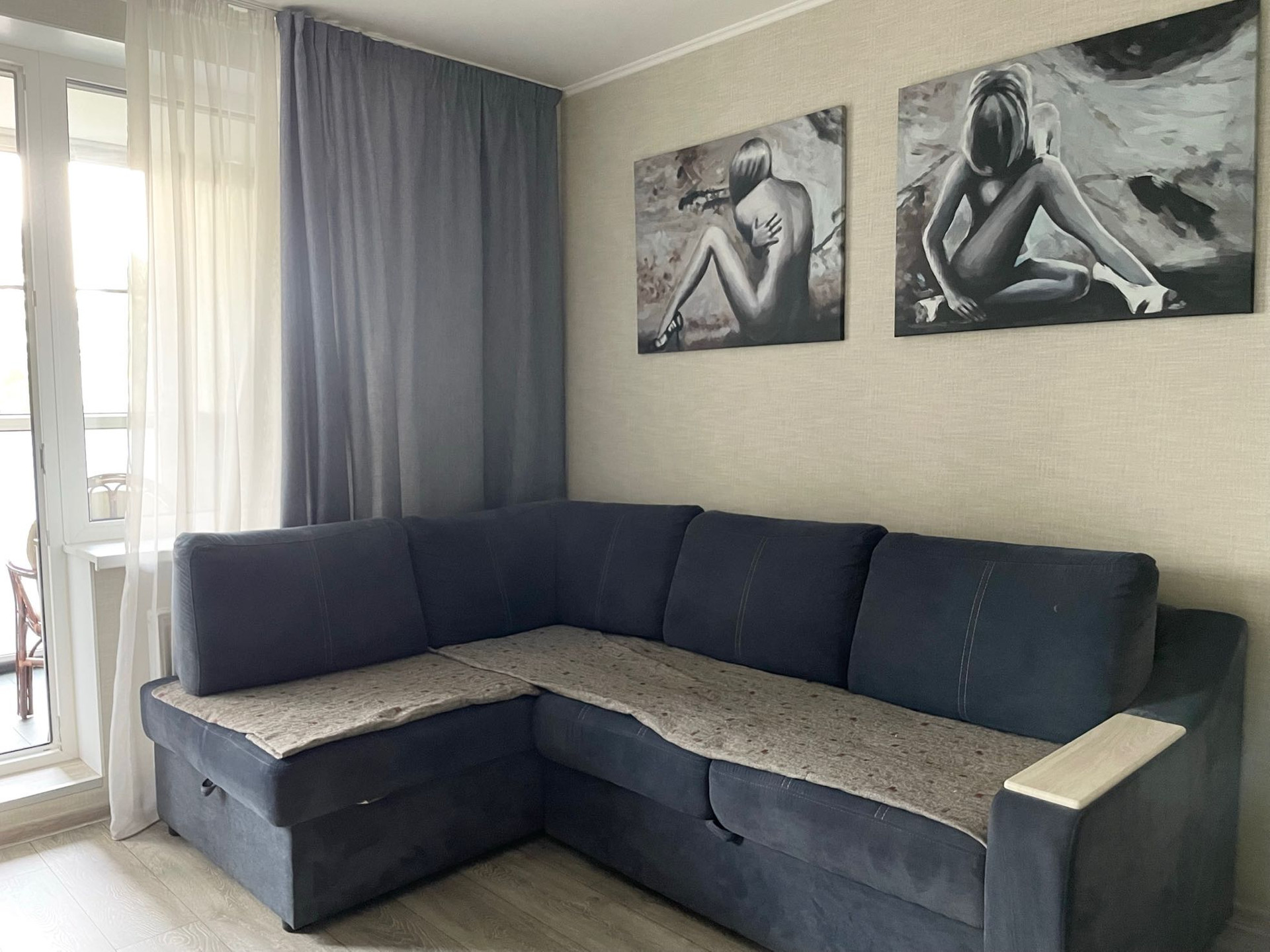 В комнатах уложен ламинат 33 класса. В спальне сделана шумоизоляция, остается спальный гарнитур, также есть встроенная большая гардеробная.