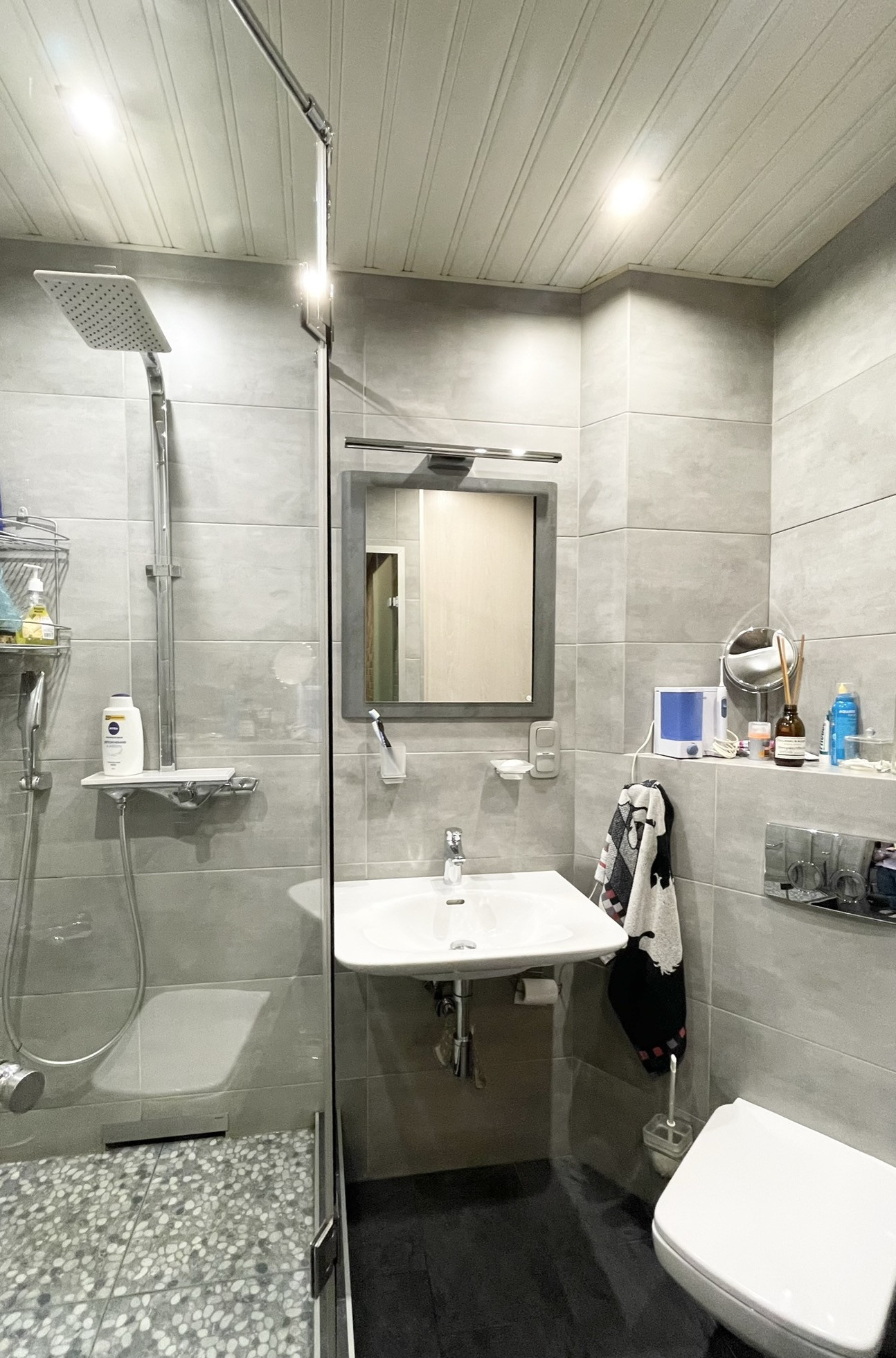 Совмещенный санузел оснащен тропическим душем, инсталляцией с гигиеническим душем, раковиной и зеркалом с подсветкой, зоной для хранения, стиральной машиной.