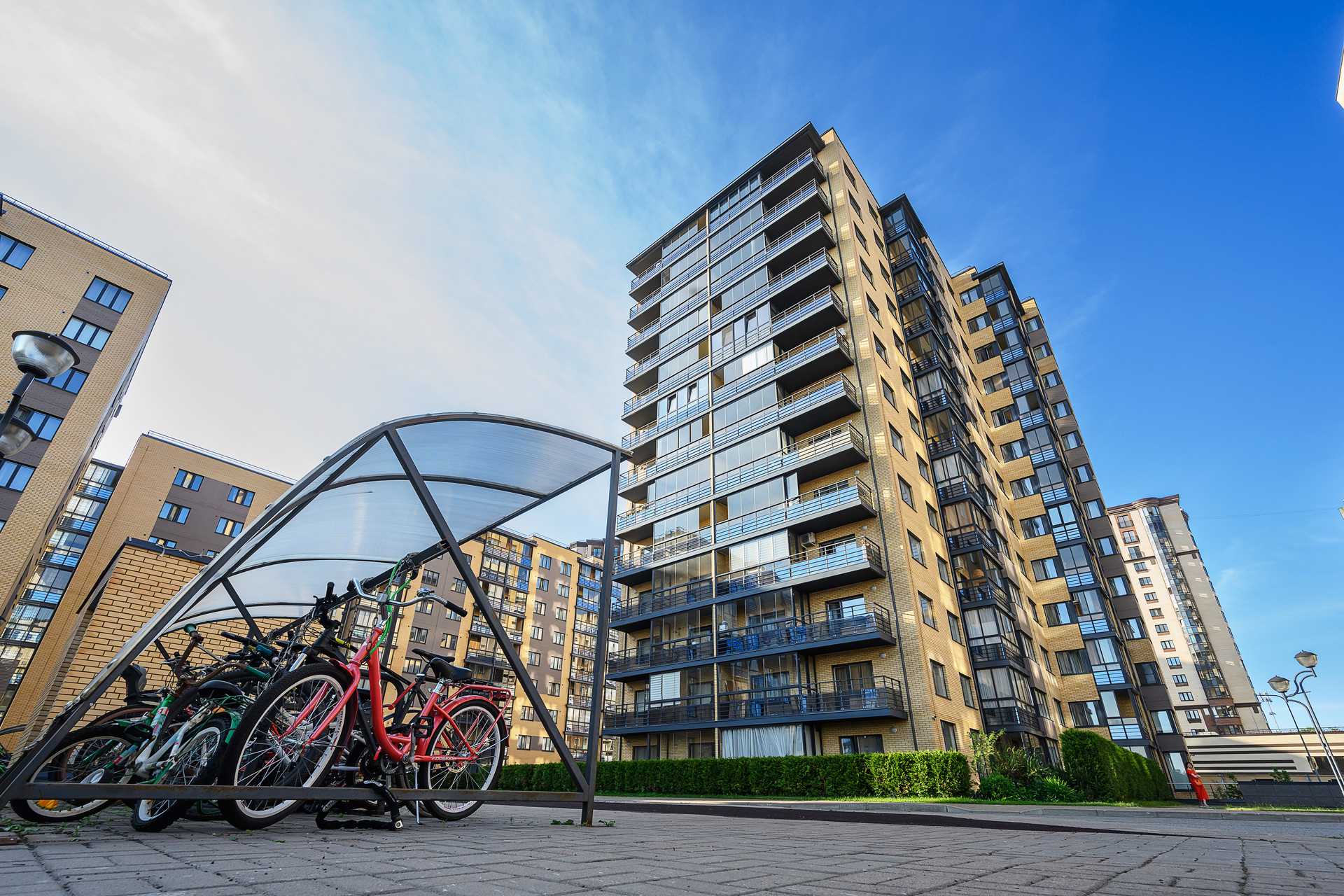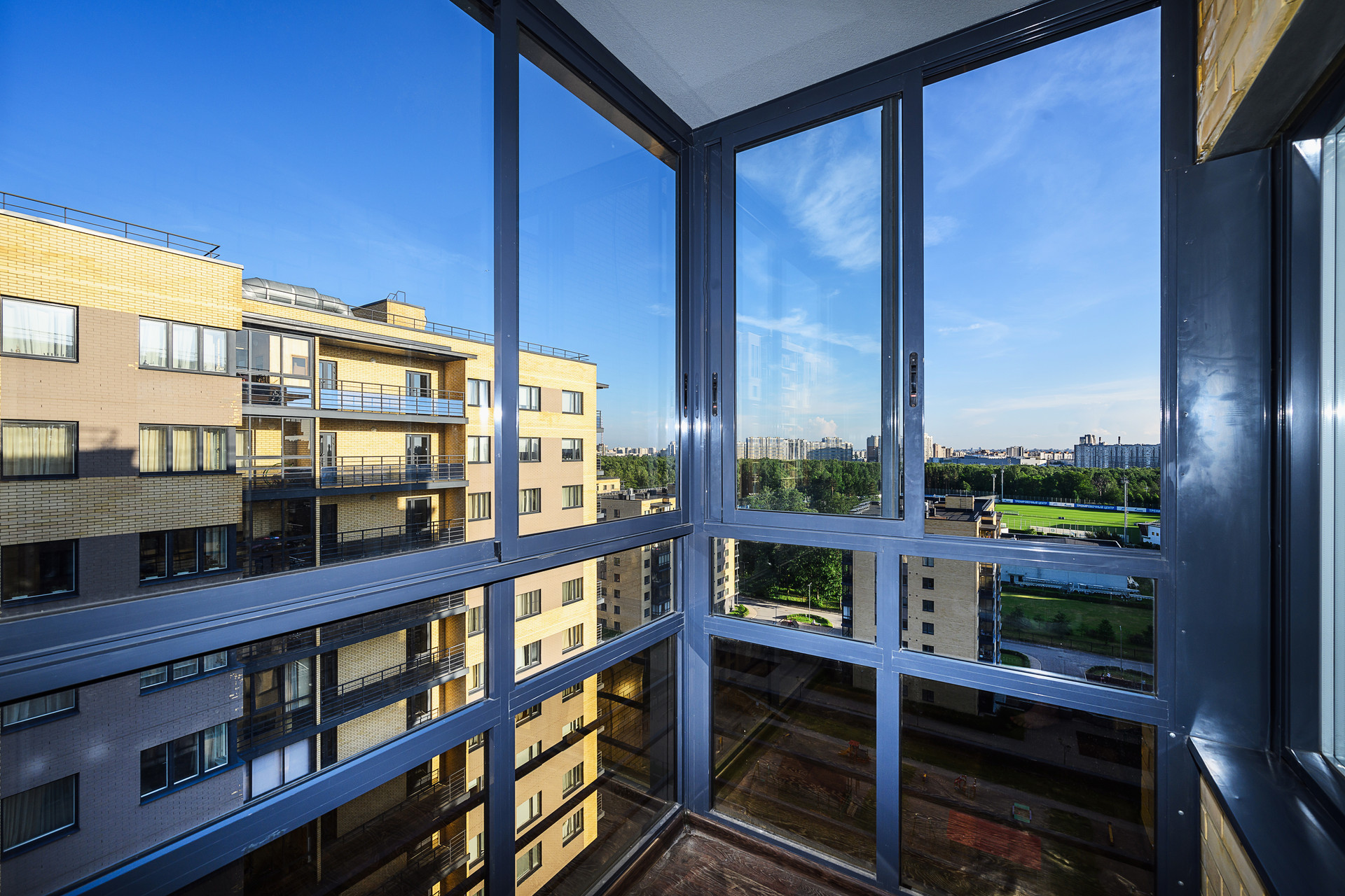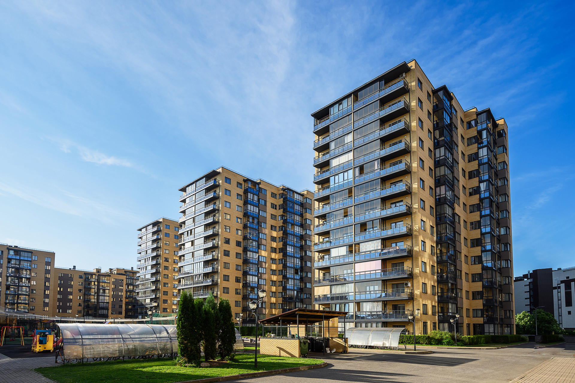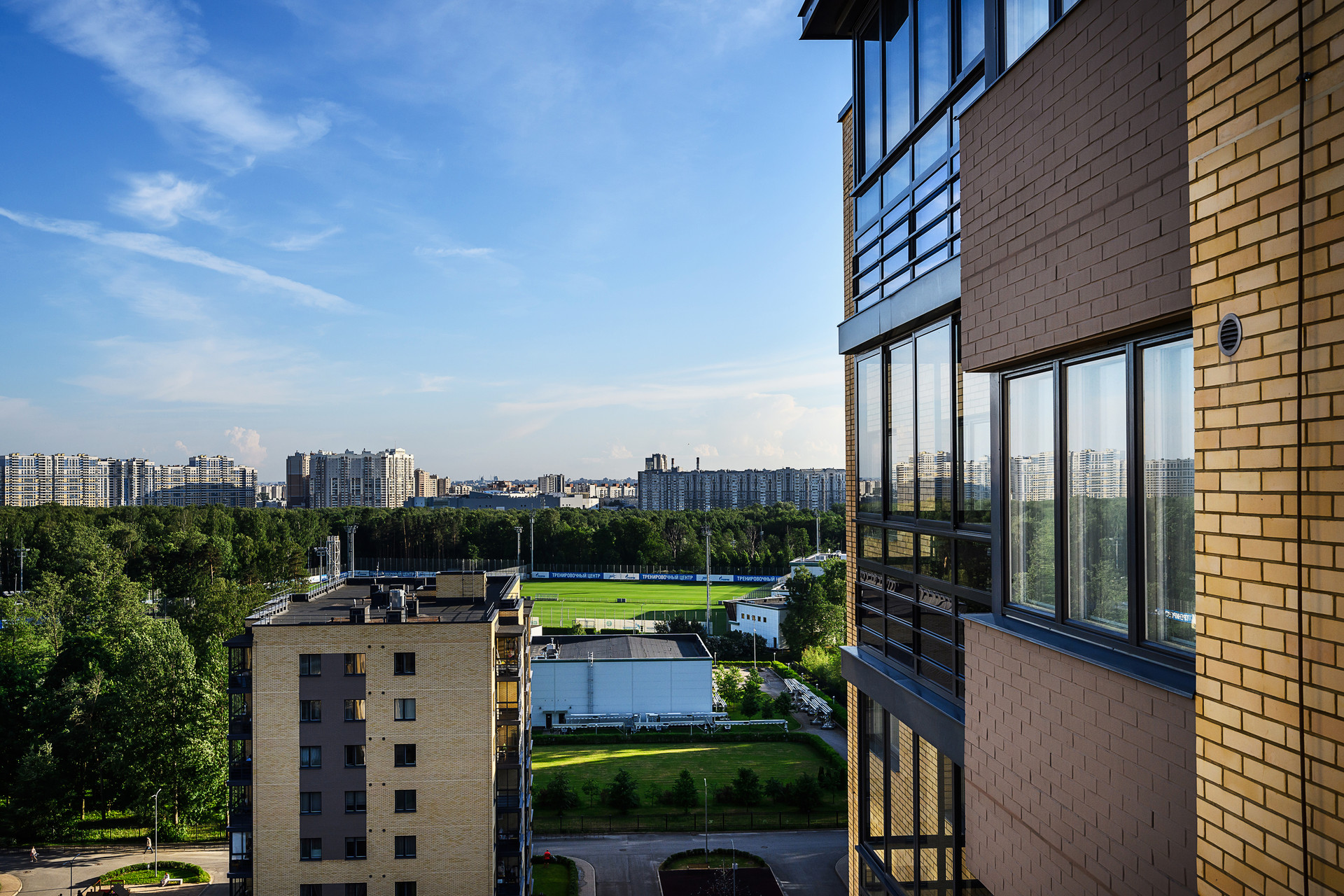 На территории есть несколько детских игровых площадок, футбольное поле, тренажеры.